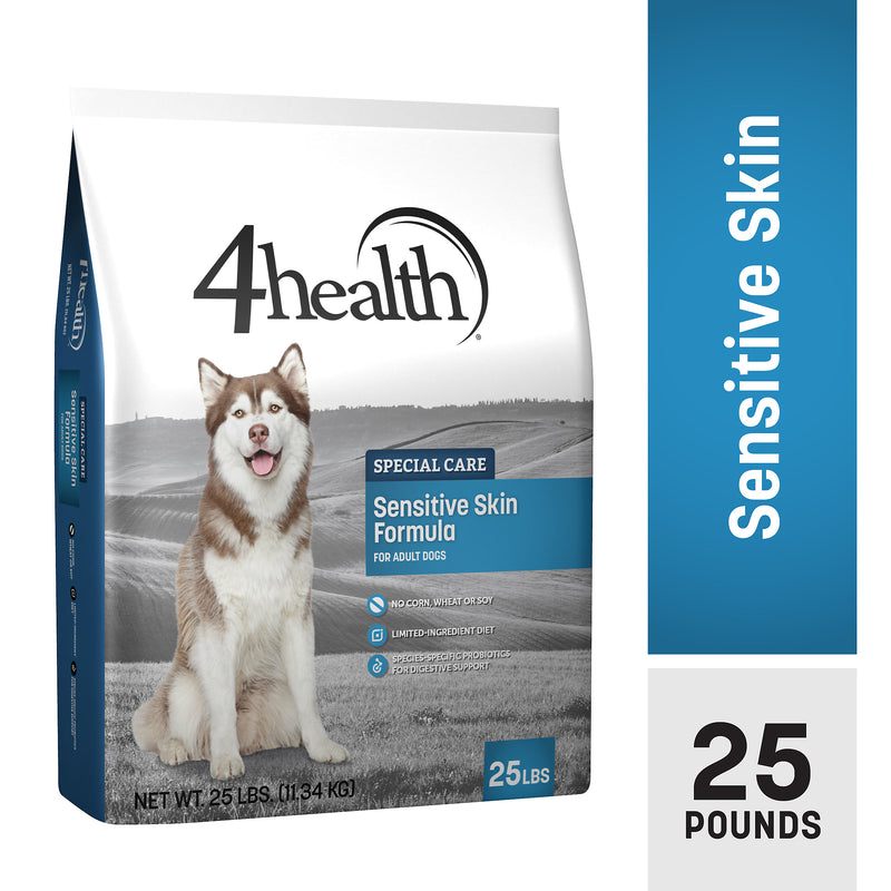 Shop / 4Health / 4health Special Care Sensitive Skin Formula Adult Dry Dog Food, 25 lb. 4health Special Care Sensitive Skin Formula Adult Dry Dog Food, 25 lb. 4health Default Title $51.99 Default Title Purchase Options Free In-Store Pick Up Not Available Save 10% on orders $49+ Set your store for inventory and store pickup details Zip Code Search Same-day Delivery* No minimum charge for delivery orders. *Order before 2pm and have it delivered today. Orders placed after 2pm will be delivered the next day. Must be inside delivery radius. Zip Code Unfortunately delivery is not available to this address. In order to ensure the best availability accuracy, changing your selected store will remove all items from your cart. You will need to re-add these items with your newly selected store if you choose to continue. Continue Cancel Ship it to Me Quantity Add To Cart Feeding guide disclaimer ✕ Feeding guides provide a starting point for the amount of food to give your pet each day. We recommend that you keep your pet in ideal body condition and not allow them to become overweight. The amount of food your pet needs can vary based on age, activity level or other food and treats given, so be sure to work with your veterinarian to determine an appropriate weight for your pet, and to make any necessary adjustments to their feeding. Information 4health Special Care Sensitive Skin Formula for Adult Dogs is a limited-ingredient diet with zero grains and ideal ratios of omega fatty acids for a healthy skin and coat. Easily digestible, hydrolyzed salmon is the single animal protein source for a nutritional approach to skin and coat support. This formula provides complete nutrition and may be fed long-term.Every bag of 4health contains select ingredients and has undergone rigorous quality-control processes.Ideal for pets that may have sensitivities to corn, wheat or soy.GRAIN FREEPeas provide high-quality carbohydrates and enhance palatability in this grain free formula.TAURINETaurine-fortified to help support a healthy heart.LIMITED-INGREDIENT DIETA narrow selection of high-quality ingredients provides complete nutrition for your dog.SPECIES-SPECIFIC PROBIOTICSDeveloped from probiotic strains found in the canine Gl tract, these ingredients help maintain the proper balance of beneficial bacteria in your dog's intestines. Each cup of food provides live, active cultures that help support healthy digestion.SKIN AND COATA blend of omega-6 and omega-3 fatty acids helps keep the skin and coat healthy and shiny.ANTIOXIDANT FORMULATIONGuaranteed levels of zinc, selenium and vitamin E help support a healthy immune system. Customers also liked Customer Reviews