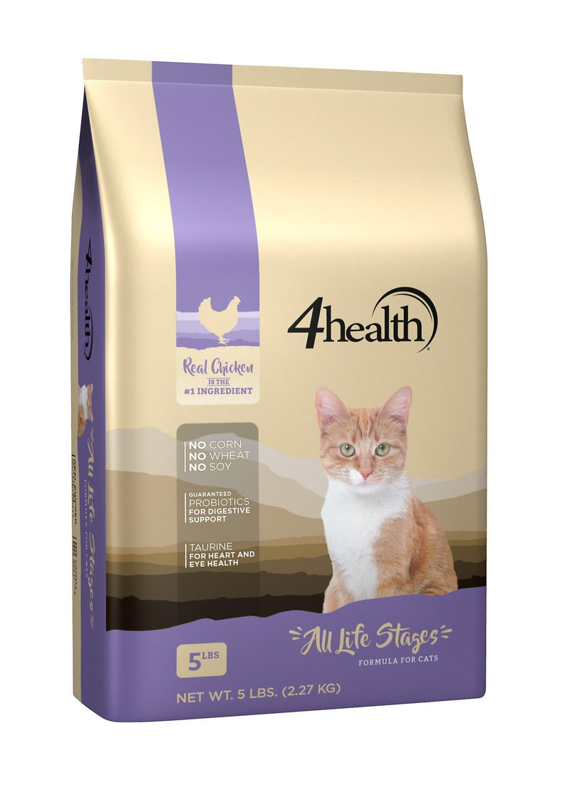 Shop / 4Health / 4health with Wholesome Grains All Life Stages Dry Cat Food 4health with Wholesome Grains All Life Stages Dry Cat Food 4health $15.99 5 lb 18 lb 5-lb 18-lb Purchase Options Free In-Store Pick Up Not Available Save 10% on orders $49+ Set your store for inventory and store pickup details Zip Code Search Same-day Delivery* No minimum charge for delivery orders. *Order before 2pm and have it delivered today. Orders placed after 2pm will be delivered the next day. Must be inside delivery radius. Zip Code Unfortunately delivery is not available to this address. In order to ensure the best availability accuracy, changing your selected store will remove all items from your cart. You will need to re-add these items with your newly selected store if you choose to continue. Continue Cancel Ship it to Me Quantity Add To Cart Feeding guide disclaimer ✕ Feeding guides provide a starting point for the amount of food to give your pet each day. We recommend that you keep your pet in ideal body condition and not allow them to become overweight. The amount of food your pet needs can vary based on age, activity level or other food and treats given, so be sure to work with your veterinarian to determine an appropriate weight for your pet, and to make any necessary adjustments to their feeding. Information 4health® Chicken & Rice Formula for for Adult Cats & Kittens is specifically formulated to meet the nutritional needs of all adult cats and kittens. Made with real chicken for great protein nutrition and great taste. Added nutritional features provide quality nutrition for your cat's health. Every bag of 4health contains select ingredients and has undergone rigorous quality-control processes. Real chicken, vegetables & fruits provide appropriate nutrition and great taste for your pet without the need for artificial colors, flavors or preservatives. REAL CHICKEN- Real chicken is the #1 ingredient. ANTIOXIDANT FORMULATION- Contains guaranteed levels of zinc, selenium and vitamin E for immune-supporting antioxidant nutrition. TAURINE- Taurine-fortified to help support a healthy heart and eyes. GUARANTEED PROBIOTICS- These ingredients help maintain the proper balance in your cats digestive system. Each cup of food provides live, active cultures that help support healthy digestion. SKIN AND COAT- A blend of omega-6 and omega-3 fatty acids helps keep the skin and coat healthy and shiny. AAFCO STATEMENT- 4health® All Life Stages Formula for Adult Cats & Kittens is formulated to meet the nutritional levels established by the AAFCO Cat Food Nutrient Profiles for All Life Stages. Customers also liked Customer Reviews