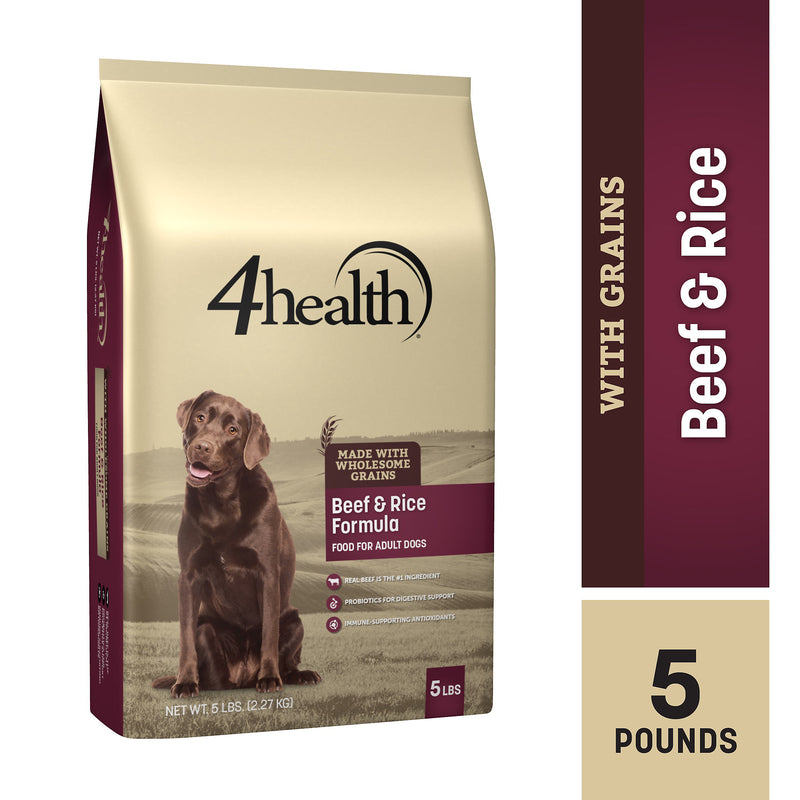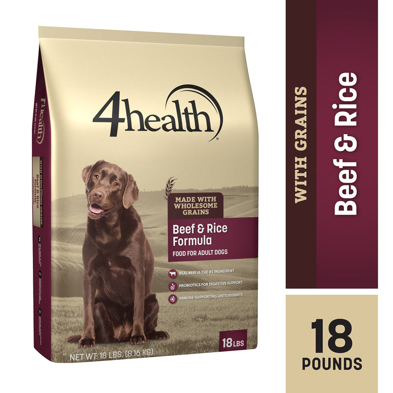 Shop / 4Health / 4health with Wholesome Grains Beef & Rice Formula Adult Dry Dog Food 4health with Wholesome Grains Beef & Rice Formula Adult Dry Dog Food 4health $11.99 5 lb 18 lb 45 lb 5-lb 18-lb 45-lb Purchase Options Free In-Store Pick Up Not Available Save 10% on orders $49+ Set your store for inventory and store pickup details Zip Code Search Same-day Delivery* No minimum charge for delivery orders. *Order before 2pm and have it delivered today. Orders placed after 2pm will be delivered the next day. Must be inside delivery radius. Zip Code Unfortunately delivery is not available to this address. In order to ensure the best availability accuracy, changing your selected store will remove all items from your cart. You will need to re-add these items with your newly selected store if you choose to continue. Continue Cancel Ship it to Me Quantity Add To Cart Feeding guide disclaimer ✕ Feeding guides provide a starting point for the amount of food to give your pet each day. We recommend that you keep your pet in ideal body condition and not allow them to become overweight. The amount of food your pet needs can vary based on age, activity level or other food and treats given, so be sure to work with your veterinarian to determine an appropriate weight for your pet, and to make any necessary adjustments to their feeding. Information 4health® Beef & Rice Formula for Adult Dogs is specifically formulated to meet the nutritional needs of your adult dog. Beef is the first ingredient, providing great taste and great protein nutrition. with protein and fat levels selected to help your dog maintain a lean body condition, this formula provides quality nutrition for your dog's health. Every bag of 4health contains select ingredients and has undergone rigorous quality-control processes. TAURINETaurine-fortified to help support a healthy heart. GLUCOSAMINE AND CHONDROITIN PROBIOTICSThese ingredients help maintain the proper balance in your dog's digestive system. Each cup of food provides live, active cultures that help support healthy digestion. SKIN AND COATA blend of omega-6 and omega-3 fatty acids helps keep the skin and coat healthy and shiny. ANTIOXIDANT FORMULATIONContains guaranteed levels of zinc, selenium and vitamin E for immune-supporting antioxidant nutrition. AAFCO STATEMENT4health® Beef & Rice Formula for Adult Dogs is formulated to meet the nutritional levels established by the AAFCO Dog Food Nutrient Profiles for maintenance. Customers also liked Customer Reviews