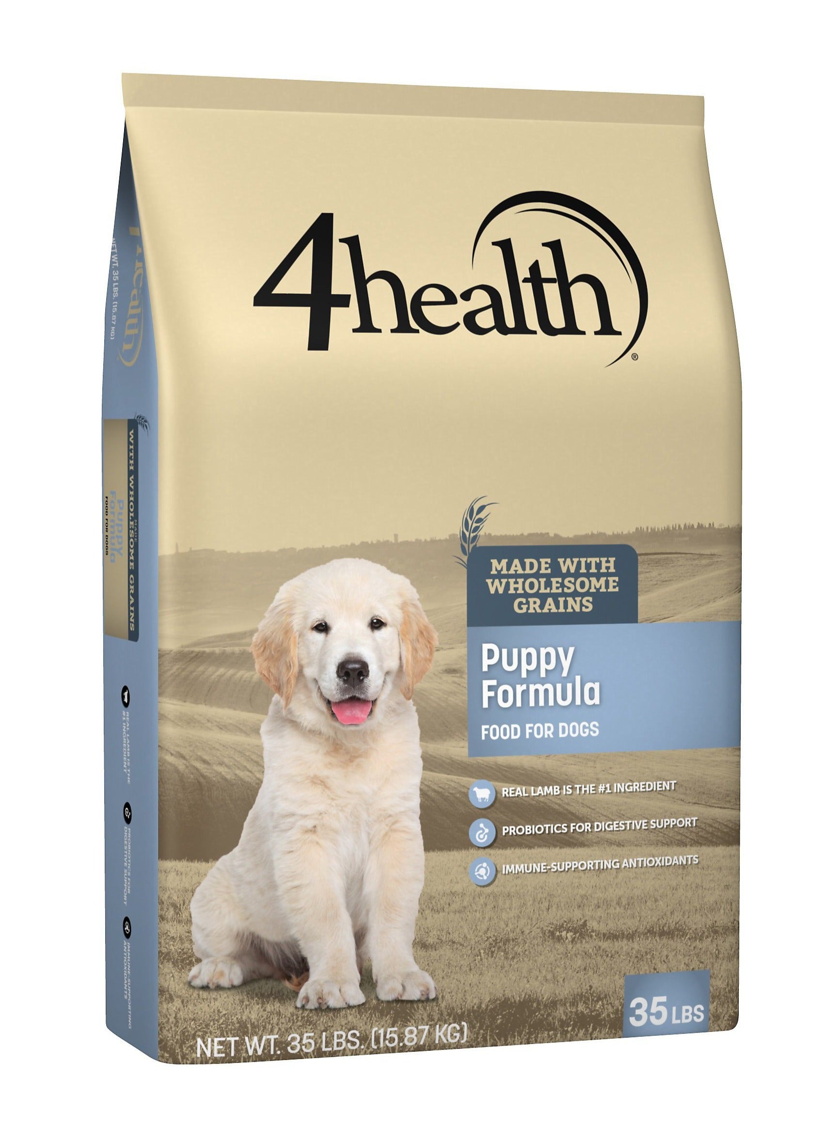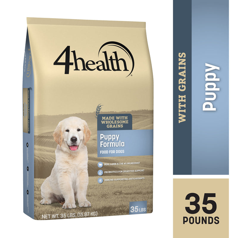 Shop / 4Health / 4health with Wholesome Grains Puppy Formula Dry Dog Food, 35lb 4health with Wholesome Grains Puppy Formula Dry Dog Food, 35lb 4health Weight: 35 lb $49.99 35-lb Purchase Options Free In-Store Pick Up Not Available Save 10% on orders $49+ Set your store for inventory and store pickup details Zip Code Search Same-day Delivery* No minimum charge for delivery orders. *Order before 2pm and have it delivered today. Orders placed after 2pm will be delivered the next day. Must be inside delivery radius. Zip Code Unfortunately delivery is not available to this address. In order to ensure the best availability accuracy, changing your selected store will remove all items from your cart. You will need to re-add these items with your newly selected store if you choose to continue. Continue Cancel Ship it to Me Quantity Add To Cart Feeding guide disclaimer ✕ Feeding guides provide a starting point for the amount of food to give your pet each day. We recommend that you keep your pet in ideal body condition and not allow them to become overweight. The amount of food your pet needs can vary based on age, activity level or other food and treats given, so be sure to work with your veterinarian to determine an appropriate weight for your pet, and to make any necessary adjustments to their feeding. Information 4health® Puppy Formula for Dogs is specifically formulated to meet the nutritional needs of your puppy. Real lamb is the first ingredient, providing great taste for puppies that thrive on lamb protein. with protein and fat levels selected to help your puppy grow and thrive, this formula provides quality nutrition for your puppy's health. Every bag of 4health contains select ingredients and has undergone rigorous quality-control processes. Real lamb and wholesome grains provide appropriate nutrition and great taste for your pet without theneed for artificial colors, flavors or preservatives. TAURINETaurine-fortified to help support a healthy heart. DHADocosahexaenoic acid, an omega-3 fatty acid, is provided by salmon oil. This fatty acid is important fordevelopment of your puppy's brain and eyes. PROBIOTICSThese ingredients help maintain the proper balance in your dog's digestive system. Each cup of food provides live, active cultures that help support healthy digestion. SKIN AND COATA blend of omega-6 and omega-3 fatty acids helps keep the skin and coat healthy and shiny. ANTIOXIDANT FORMULATIONContains guaranteed levels of zinc, selenium and vitamin E for immune-supporting antioxidant nutrition. AAFCO STATEMENT4health® Puppy Formula for Dogs is formulated to meet the nutritional levels established by the AAFCO Dog Food Nutrient Profiles for All Life Stages including growth of large size dogs (70 lb. or more as an adult). Customers also liked Customer Reviews