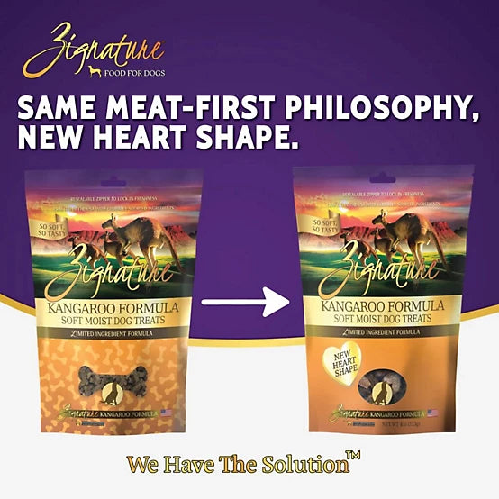 Shop / $7.99 Treats / Zignature Soft Moist Dog Treats Kangaroo Formula Dog Treats, 4 oz. Zignature Soft Moist Dog Treats Kangaroo Formula Dog Treats, 4 oz. Pets Global 4oz $7.99 4oz Purchase Options Free In-Store Pick Up Not Available Save 10% on orders $49+ Set your store for inventory and store pickup details Zip Code Search Same-day Delivery* No minimum charge for delivery orders. *Order before 2pm and have it delivered today. Orders placed after 2pm will be delivered the next day. Must be inside delivery radius. Zip Code Unfortunately delivery is not available to this address. In order to ensure the best availability accuracy, changing your selected store will remove all items from your cart. You will need to re-add these items with your newly selected store if you choose to continue. Continue Cancel Ship it to Me Quantity Add To Cart Feeding guide disclaimer ✕ Feeding guides provide a starting point for the amount of food to give your pet each day. We recommend that you keep your pet in ideal body condition and not allow them to become overweight. The amount of food your pet needs can vary based on age, activity level or other food and treats given, so be sure to work with your veterinarian to determine an appropriate weight for your pet, and to make any necessary adjustments to their feeding. Information Delivering wild, humanely sourced kangaroo as the #1 ingredient in tender, nutrient-rich bites. This ultra-lean novel protein is packed with omega?3s, B12, and iron to support heart health, energy, and coat shine. A smart, savory reward for sensitive dogs or those managing weight and muscle tone. Made with the same premium proteins as our Zignature® Original line, offering pet parents peace of mind with consistent, trusted nutrition from bowl to treat bag Savory, soft treats with an irresistible aroma designed to capture your dog's attention and keep them motivated during training Bite-sized rewards in a convenient, training-ready, grab-and-go pouch-perfect for on-the-spot treating Kangaroo, Lentils, Peas, Coconut Glycerin, Chickpeas, Dried Cultured Skim Milk, Lactic Acid, Natural Flavor, Apple Cider Vinegar, Celery Powder, Natural Smoke Flavor, Mixed Tocopherols (preservative), Citric Acid (preservative), Rosemary Extract. Customers also liked Customer Reviews