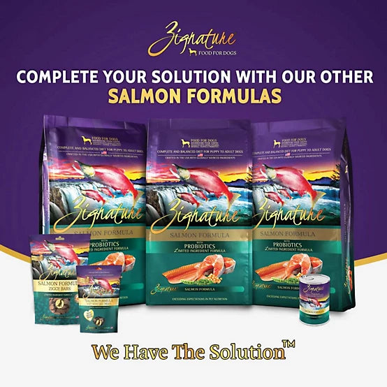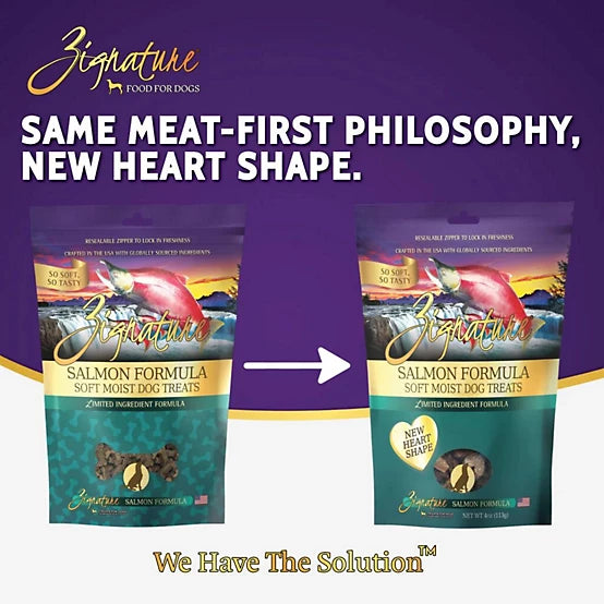 Shop / $7.99 Treats / Zignature Soft Moist Dog Treats Salmon Formula Dog Treats, 4 oz. Zignature Soft Moist Dog Treats Salmon Formula Dog Treats, 4 oz. Pets Global 4oz $7.99 4oz Purchase Options Free In-Store Pick Up Not Available Save 10% on orders $49+ Set your store for inventory and store pickup details Zip Code Search Same-day Delivery* No minimum charge for delivery orders. *Order before 2pm and have it delivered today. Orders placed after 2pm will be delivered the next day. Must be inside delivery radius. Zip Code Unfortunately delivery is not available to this address. In order to ensure the best availability accuracy, changing your selected store will remove all items from your cart. You will need to re-add these items with your newly selected store if you choose to continue. Continue Cancel Ship it to Me Quantity Add To Cart Feeding guide disclaimer ✕ Feeding guides provide a starting point for the amount of food to give your pet each day. We recommend that you keep your pet in ideal body condition and not allow them to become overweight. The amount of food your pet needs can vary based on age, activity level or other food and treats given, so be sure to work with your veterinarian to determine an appropriate weight for your pet, and to make any necessary adjustments to their feeding. Information Crafted with real salmon as the #1 ingredient, these soft, high-reward treats deliver lean protein and natural omega?3s to support strong muscles, heart health, and joint comfort. With a fish-forward flavor and gentle digestibility, they're ideal for sensitive pups or dogs needing skin and coat care. Made with the same premium proteins as our Zignature® Original line, offering pet parents peace of mind with consistent, trusted nutrition from bowl to treat bag Savory, soft treats with an irresistible aroma designed to capture your dog's attention and keep them motivated during training Bite-sized rewards in a convenient, training-ready, grab-and-go pouch-perfect for on-the-spot treating Salmon, Lentils, Peas, Coconut Glycerin, Chickpeas, Dried Cultured Skim Milk, Lactic Acid, Natural Flavor, Apple Cider Vinegar, Celery Powder, Natural Smoke Flavor, Mixed Tocopherols (preservative), Citric Acid (preservative), Rosemary Extract. Customers also liked Customer Reviews