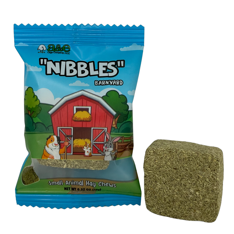 Shop / A&E Cage Company / A&E Cage Nibbles Small Animal Hay Chew Bite A&E Cage Nibbles Small Animal Hay Chew Bite A&E Cage Company 15g $0.99 $1.49 15g Purchase Options Free In-Store Pick Up Not Available Save 10% on orders $49+ Set your store for inventory and store pickup details Zip Code Search Same-day Delivery* No minimum charge for delivery orders. *Order before 2pm and have it delivered today. Orders placed after 2pm will be delivered the next day. Must be inside delivery radius. Zip Code Unfortunately delivery is not available to this address. In order to ensure the best availability accuracy, changing your selected store will remove all items from your cart. You will need to re-add these items with your newly selected store if you choose to continue. Continue Cancel Ship it to Me Quantity Add To Cart Feeding guide disclaimer ✕ Feeding guides provide a starting point for the amount of food to give your pet each day. We recommend that you keep your pet in ideal body condition and not allow them to become overweight. The amount of food your pet needs can vary based on age, activity level or other food and treats given, so be sure to work with your veterinarian to determine an appropriate weight for your pet, and to make any necessary adjustments to their feeding. Information Single Hay Chews Display Box is the perfect treats for your small animal that are all natural. They are made with ground Timothy Hay and Ground Rice, which is high in fiber and nutrition to help provide important nutrients to your small animal. These treats are best suited for guinea pigs, rabbits, hamsters and similarly sized animals. These treats can also improve dental health, digestion, prevent boredom, promote exercise and relieve tension. You will be getting 1 individually wrapped hay chew, in sealed packaging that will keep your snack(s) dry and secured inside of the bag. The display box can hold up to 32 individually wrapped units. Customers also liked Customer Reviews