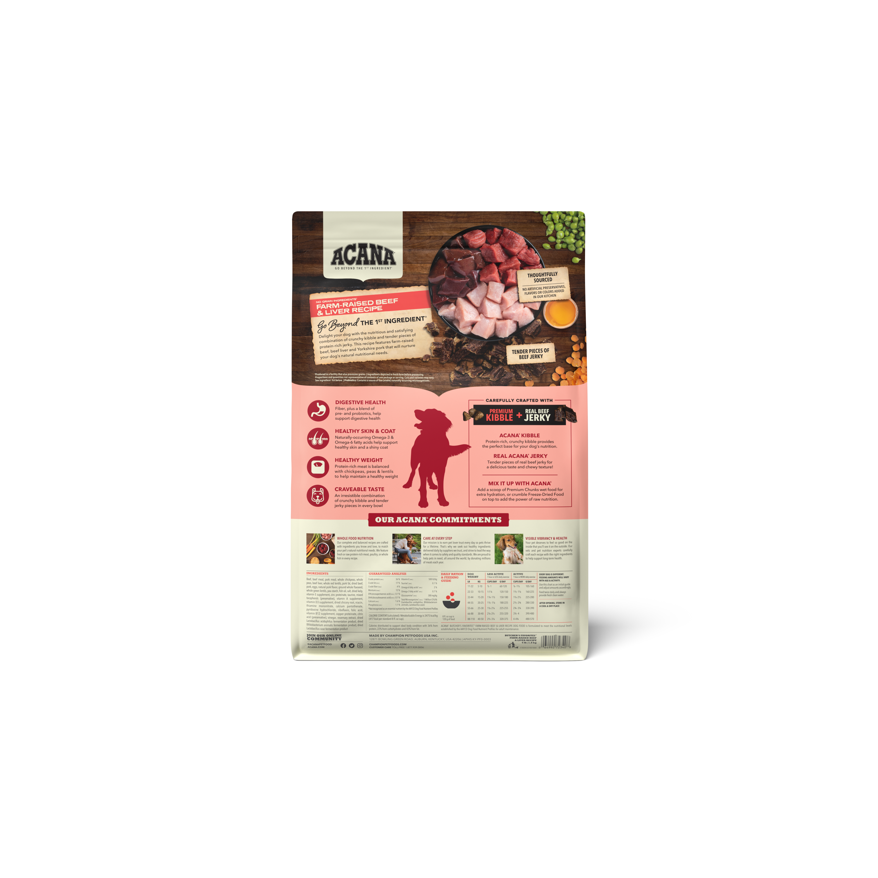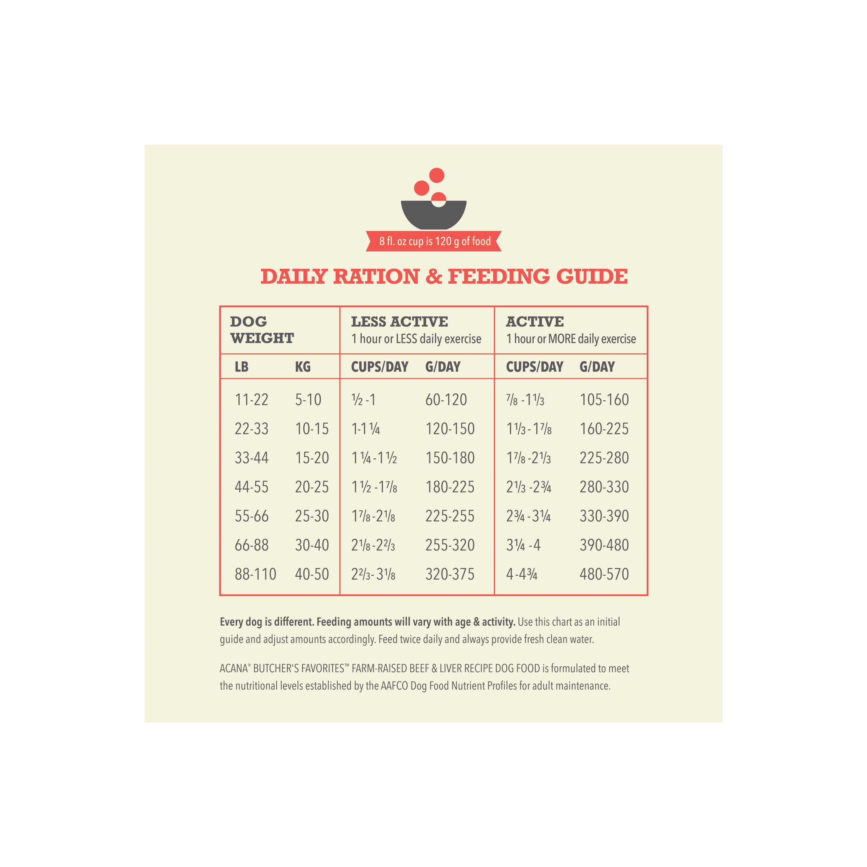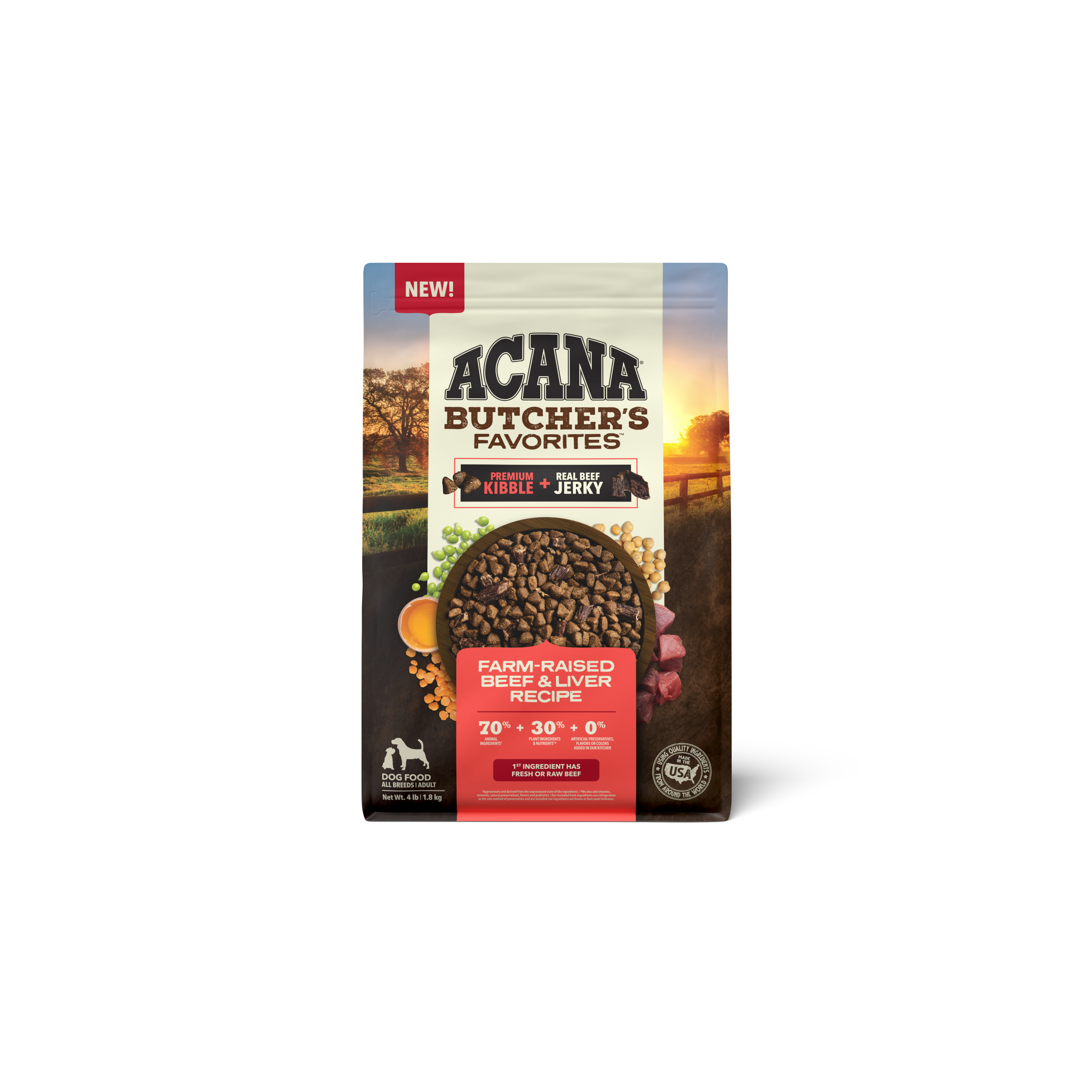 Shop / ACANA / ACANA Butcher's Favorites Farm-Raised Beef 4lb ACANA Butcher's Favorites Farm-Raised Beef 4lb ACANA 4 LB $30.99 4 LB Purchase Options Free In-Store Pick Up Not Available Save 20% on orders $100+ Set your store for inventory and store pickup details Zip Code Search Same-day Delivery* No minimum charge for delivery orders. *Order before 2pm and have it delivered today. Orders placed after 2pm will be delivered the next day. Must be inside delivery radius. Zip Code Unfortunately delivery is not available to this address. In order to ensure the best availability accuracy, changing your selected store will remove all items from your cart. You will need to re-add these items with your newly selected store if you choose to continue. Continue Cancel Ship it to Me Quantity Add To Cart Feeding guide disclaimer ✕ Feeding guides provide a starting point for the amount of food to give your pet each day. We recommend that you keep your pet in ideal body condition and not allow them to become overweight. The amount of food your pet needs can vary based on age, activity level or other food and treats given, so be sure to work with your veterinarian to determine an appropriate weight for your pet, and to make any necessary adjustments to their feeding. Information Bring home the quality nutrition your dog needs to thrive with ACANA Butcher's Favorites Farm-Raised Beef & Liver Recipe Dry Dog Food. This high protein dog food includes ACANA dog food kibble and tender pieces of protein-rich real beef jerky your dog will crave. Fresh farm-raised beef, beef liver and Yorkshire pork are balanced with chickpeas, peas & lentils to help maintain a healthy weight. The dry dog food is 70 percent* animal ingredients and 30 percent** plant ingredients and nutrients. Even better, nutritious ingredients in this ACANA dog food kibble help support three key health benefits, including digestive health, a healthy weight and a healthy skin and coat. Our included fresh ingredients use refrigeration as the sole method of preservation and our included raw ingredients are frozen at their peak freshness. Choose ACANA dry dog food to give your companion the nutritional foundation they need to live a happy, healthy life. *Approximate and derived from the unprocessed state of the ingredients **We also add vitamins, minerals, natural preservatives flavors and probiotics One (1) 4 lb bag of ACANA Butcher's Favorites Farm-Raised Beef & Liver Recipe Dry Dog Food High-protein dog food recipe features fresh farm-raised beef, beef liver and Yorkshire pork and is balanced to include 70 percent* animal ingredients and 30 percent** plant ingredients and nutrients Contains a mix of premium dry kibble and protein-rich, tender pieces of real beef jerky your dog will crave Protein-rich animal ingredients are balanced with other wholesome ingredients to help support digestive health, a healthy weight and a healthy skin and coat Premium dog food made in the USA with quality ingredients from around the world Ingredients Beef, beef meal, pork meal, whole chickpeas, whole peas, beef liver, whole red lentils, pork fat, driedbeef, pork, eggs, natural pork flavor, ground whole flaxseed, whole green lentils, pea starch, fish oil,salt, dried kelp, vitamin E supplement, zinc proteinate, taurine, mixed tocopherols (preservative),vitamin A supplement, vitamin D3 supplement, dried chicory root, niacin, thiamine mononitrate,calcium pantothenate, pyridoxine hydrochloride, riboflavin, folic acid, vitamin B12 supplement,copper proteinate, citric acid (preservative), vinegar, rosemary extract, dried Lactobacillus acidophilusfermentation product, dried Bifidobacterium animalis fermentation product, dried Lactobacillus caseifermentation product. Guaranteed Analysis Crude protein 36% min, Crude fat 17% min, Crude fiber 4% max, Moisture 12% max, Dietary Starch 20% max, EPA (eicosapentaenoic acid) 0.1% min, DHA (docosahexaenoic acid) 0.1% min, Calcium 1.6% min, Phosphorus 1.1% min, Omega-6 fatty acids* 2.0% min, Omega-3 fatty acids* 0.7% min, Glucosamine* 300mg/kg min, Total Microorganisms* 1 Million CFU/lb, (Lactobacillus acidophilus, Bifidobacterium animalis, Lactobacillus casei), *Not recognized as an essential nutrient by the AAFCO Dog Food Nutrient Profiles. Customers also liked Customer Reviews