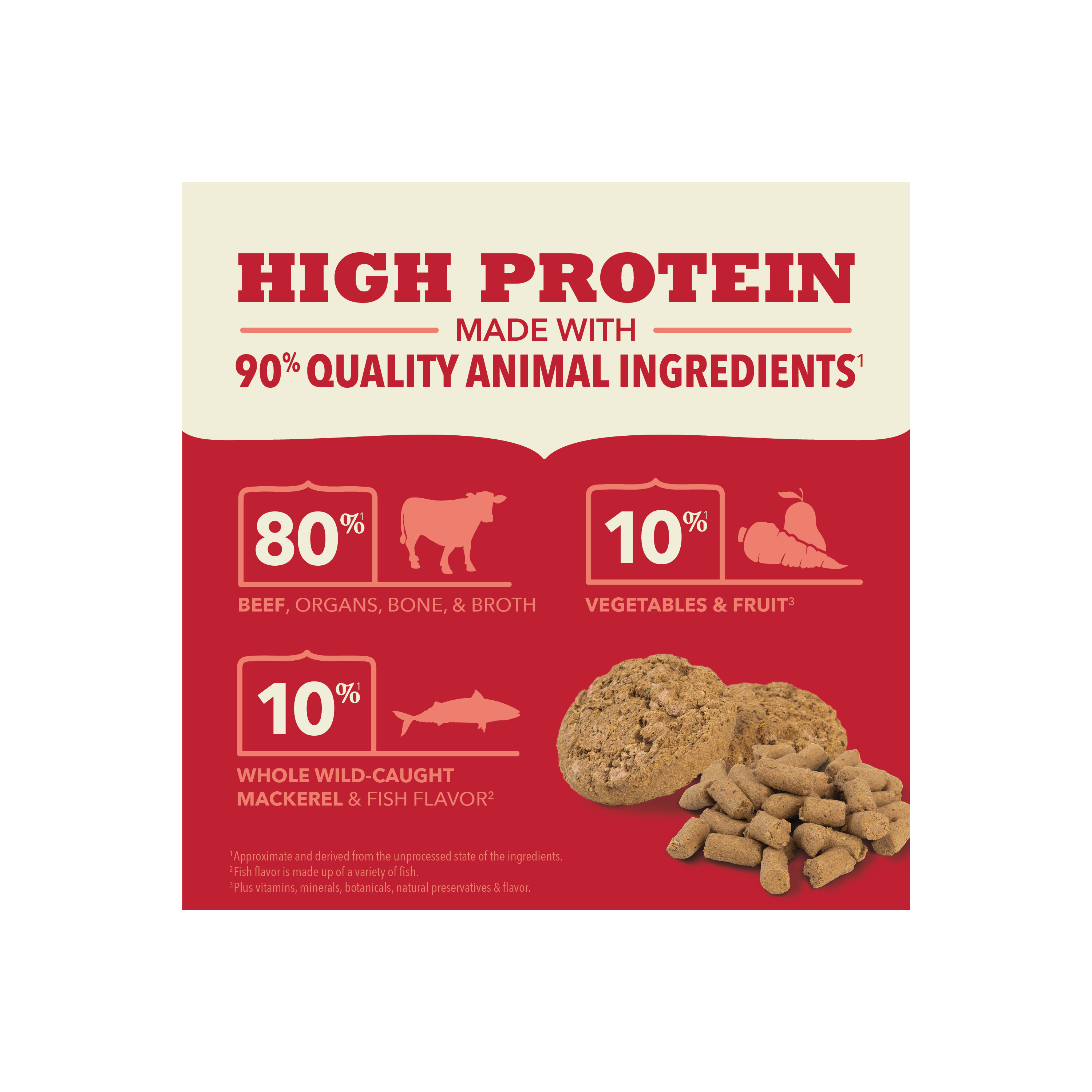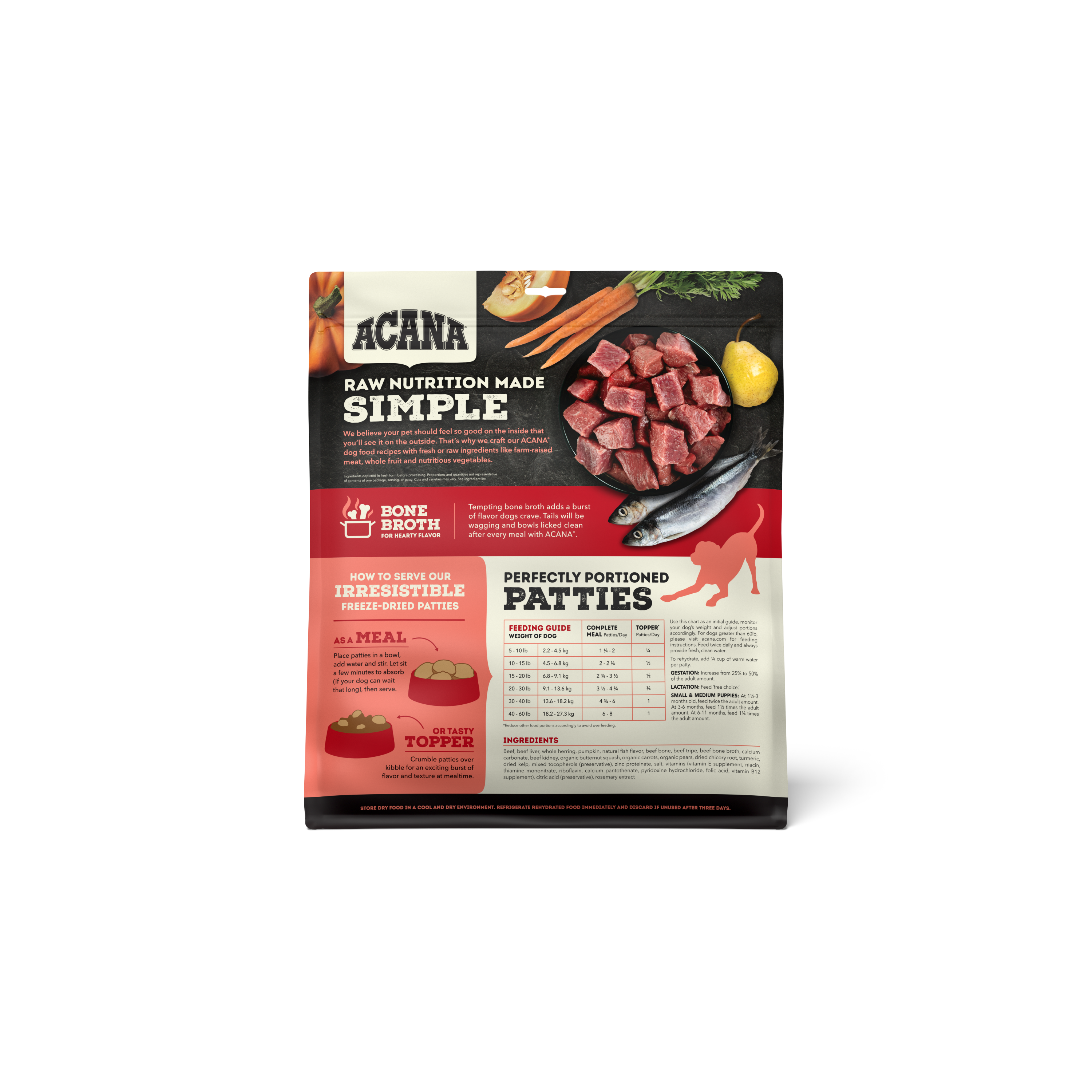 Shop / ACANA / ACANA Freeze-Dried Food Patties Farm-Raised Beef Recipe 14OZ ACANA Freeze-Dried Food Patties Farm-Raised Beef Recipe 14OZ ACANA 14 OZ $34.99 14 OZ Purchase Options Free In-Store Pick Up Not Available Save 20% on orders $100+ Set your store for inventory and store pickup details Zip Code Search Same-day Delivery* No minimum charge for delivery orders. *Order before 2pm and have it delivered today. Orders placed after 2pm will be delivered the next day. Must be inside delivery radius. Zip Code Unfortunately delivery is not available to this address. In order to ensure the best availability accuracy, changing your selected store will remove all items from your cart. You will need to re-add these items with your newly selected store if you choose to continue. Continue Cancel Ship it to Me Quantity Add To Cart Feeding guide disclaimer ✕ Feeding guides provide a starting point for the amount of food to give your pet each day. We recommend that you keep your pet in ideal body condition and not allow them to become overweight. The amount of food your pet needs can vary based on age, activity level or other food and treats given, so be sure to work with your veterinarian to determine an appropriate weight for your pet, and to make any necessary adjustments to their feeding. Information Give your dog's meals a boost of nutrition and delicious flavor with ACANA Farm-Raised Beef Recipe Freeze Dried Dog Food Meal and Topper. This grain free* freeze dried dog food satisfies your dog's natural cravings with ingredients like farm-raised beef, organs and bone. This dog food features protein-rich, bite-size breakable patties that are balanced with vegetables and fruit to provide all the benefits of raw nutrition with none of the mess. Delectable as a meal or as a topper on your dog‰۪s favorite ACANA kibble, this freeze dried dog food topper is infused with a hearty bone broth for a taste dog's love. This dog food contains 90 percent** quality animal ingredients. Our included fresh ingredients use refrigeration as the sole method of preservation and our included raw ingredients are frozen at their peak freshness. Choose ACANA freeze dried dog food to give your companion the nutritional foundation they need to live a happy, healthy life. *Produced in a facility that also processes grains **Approximate and derived from the unprocessed state of the ingredients One (1) 14 oz bag of ACANA High Protein Farm-Raised Beef Recipe Freeze Dried Dog Food Meal & Topper Made with farm-raised beef, organs and bone, this grain free* freeze dried dog food offers a balanced recipe with 90 percent** quality animal ingredients Bite-sized breakable patties infused with hearty bone broth and freeze-dried coated to lock in nutrients and a rich, natural flavor your dog will love Crumble over your dog's favorite ACANA for a delicious dog food topper, or mix it with warm water for a nutritious meal Premium ACANA dog food made in the USA with quality ingredients from around the world Ingredients Beef, beef liver, whole mackerel, pumpkin, natural fish flavor, beef bone, beef tripe, beefkidney, beef bone broth, organic butternut squash, organic carrots, organic pear, salt, driedchicory root, turmeric, dried kelp, mixed tocopherols (preservative), zinc proteinate, vitamins (vitamin E supplement, niacin, thiamine mononitrate, riboflavin, calcium pantothenate,pyridoxine hydrochloride, folic acid, vitamin B12 supplement), citric acid (preservative),rosemary extract Guaranteed Analysis Crude protein (min.) 36%, Crude fat (min.) 32%,Crude fiber (max.) 5%, Moisture (max.) 5%, Ash (max.) 12%, Dietary Starch (max.) 87%,Sugars (max.) 1%,EPA (eicosapentaenoic acid) (min.) 0.1%, DHA (docosahexaenoic acid) (min.) 0.1%, Calcium (min.) 1.7%, Phosphorus (min.) 1.2%, Omega-6 fatty acids* (min.) 1.6%, Omega-3 fatty acids* (min.) 0.7%, *Not recognized as an essential nutrient by the AAFCO Dog Food Nutrient Profiles. Customers also liked Customer Reviews
