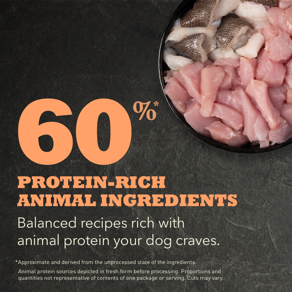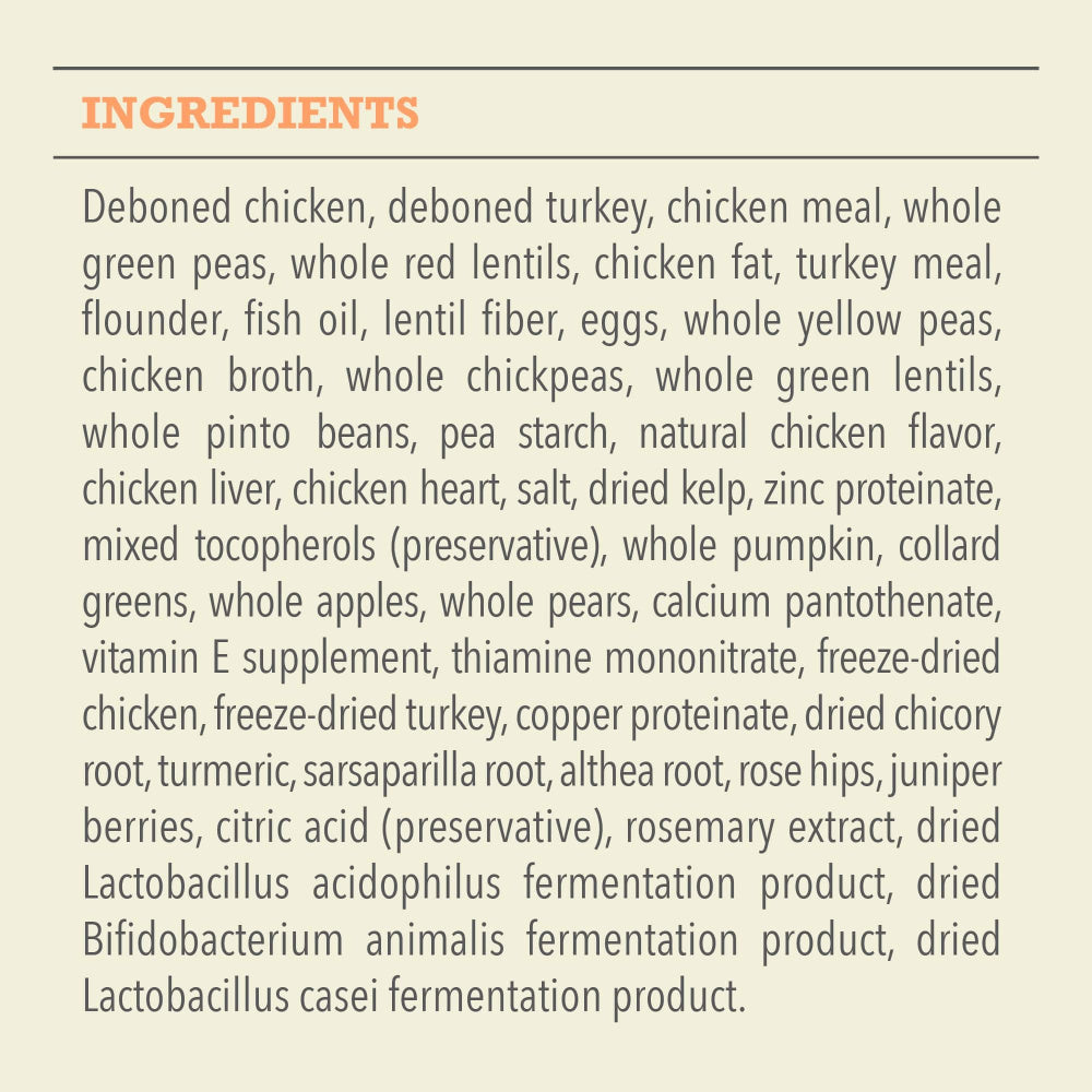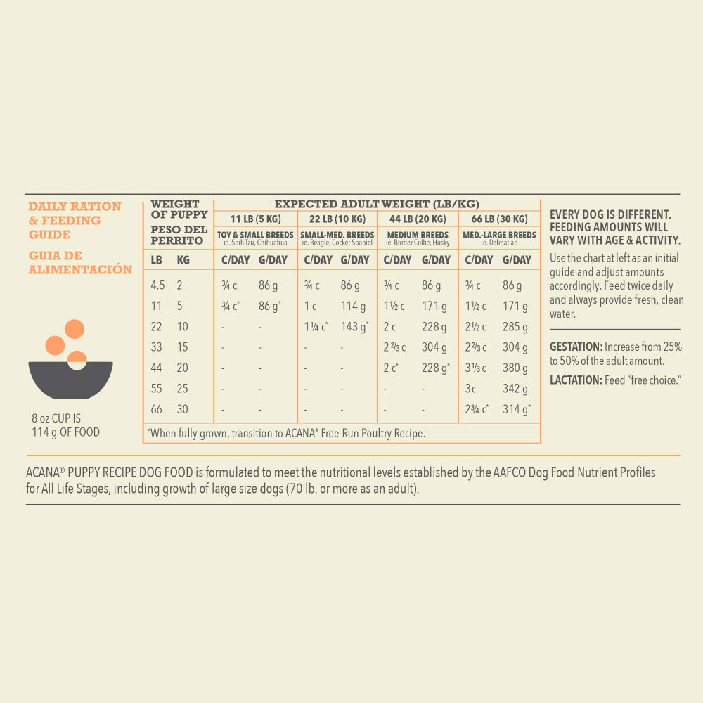 Shop / ACANA / ACANA Puppy & Junior Formula Grain Free Dry Dog Food ACANA Puppy & Junior Formula Grain Free Dry Dog Food ACANA $21.99 4.5 lb 25 lb 4.5-lb 25-lb Purchase Options Free In-Store Pick Up Not Available Save 10% on orders $49+ Set your store for inventory and store pickup details Zip Code Search Same-day Delivery* No minimum charge for delivery orders. *Order before 2pm and have it delivered today. Orders placed after 2pm will be delivered the next day. Must be inside delivery radius. Zip Code Unfortunately delivery is not available to this address. In order to ensure the best availability accuracy, changing your selected store will remove all items from your cart. You will need to re-add these items with your newly selected store if you choose to continue. Continue Cancel Ship it to Me Quantity Add To Cart Feeding guide disclaimer ✕ Feeding guides provide a starting point for the amount of food to give your pet each day. We recommend that you keep your pet in ideal body condition and not allow them to become overweight. The amount of food your pet needs can vary based on age, activity level or other food and treats given, so be sure to work with your veterinarian to determine an appropriate weight for your pet, and to make any necessary adjustments to their feeding. Information Go Beyond the 1st Ingredient™ with ACANA® recipes that are thoughtfully crafted from start to finish. Your growing puppy needs protein and fat from quality animal protein to support their development. ACANA® Puppy & Junior recipe is balanced with 60%* quality animal ingredients like free-run chicken and turkey**, cage-free eggs, and 40%+ fruits, vegetables, and botanicals like whole pumpkin. Artificial colors, flavors or preservatives are never added in our kitchen. Our premium ingredients come from a curated group of farmers, ranchers and fishers we’ve known and trusted for decades, and we approach every batch with an unsurpassed commitment to safety and quality in our award-winning Kentucky kitchen. The result is a protein-rich, nutritious, and delicious dog food to help them live a healthy, happy life. *approximate and derived from the unprocessed state of the ingredients. **Our free-run chickens and turkeys are not housed in cages and are able to move in a barn without outdoor access. +we also add vitamins, minerals, natural preservatives and probiotics.Why We Love It First two ingredients are fresh or raw chicken & turkey; nutrient-dense and high in protein. Our fresh ingredients use refrigeration as the sole method of preservation and our raw ingredients are frozen at their peak freshness. Includes fresh or raw vegetables & fruit like collard greens, whole pumpkin, butternut squash, apples, and pears; nutritious and high in fiber. Grain-free with no added soy, corn, wheat or tapioca. About ACANAYour dog may not roam the wilderness like their ancestors did, but that doesn't mean you shouldn't feed them like they don't. ACANA makes only foods that are rich in meat and protein variety, with wholeprey meat ratios and limited carbohydrates, replacing fast carbs with low glycemic, healthy fruits and vegetables. With a state of art brand new kitchen in Kentucky, all ACANA foods are sourced and made right here in the USA by trusted farmers. With human grade ingredients that typically arrive at the kitchens within 48 hours of harvesting, fresh is the entire basis of ACANA’s brand. Ingredients like heritage red meats from the Appalachian ranching country, free run poultry and eggs, wild caught fish from New England, whole fruits and vegetables like Bartlett pears and butternut squash, and locally grown botanicals from Kentucky, ACANA believes the healthiest foods are made here at home in Kentucky, never outsourced. ACANA nourishes your pet's instinct for real, fresh meats and high quality grain-free carbohydrates. It's everything Mother Nature intended, and nothing she did not. Ingredients Deboned chicken, deboned turkey, chicken meal, whole green peas, whole red lentils, chicken fat, turkey meal, flounder, fish oil, lentil fiber, eggs, whole yellow peas, chicken broth, whole chickpeas, whole green lentils, whole pinto beans, pea starch, natural chicken flavor, chicken liver, chicken heart, salt, dried kelp, zinc proteinate, mixed tocopherols (preservative), whole pumpkin, collard greens, whole apples, whole pears, calcium pantothenate, vitamin E supplement, thiamine mononitrate, freeze-dried chicken liver, freeze-dried turkey liver, copper proteinate, dried chicory root, turmeric, sarsaparilla, althea root, rose hips, juniper berries, citric acid (preservative), rosemary extract, dried Lactobacillus acidophilus fermentation product, dried Bifidobacterium animalis fermentation product, dried Lactobacillus casei fermentation product. Guaranteed Analysis Nutrient Guaranteed Units Crude Protein 31% min Crude Fat 19% min Crude Fiber 5% max Moisture 12% max DHA 0.4% min EPA 0.2% min Calcium 1.2% min Phosphorus 1% min Omega-6 Fatty Acids 2.3% min Omega-3 Fatty Acids 1.3% min Glucosamine 800 mg/kg min Total Microorganisms 100MM CFU/lb min Customers also liked Customer Reviews