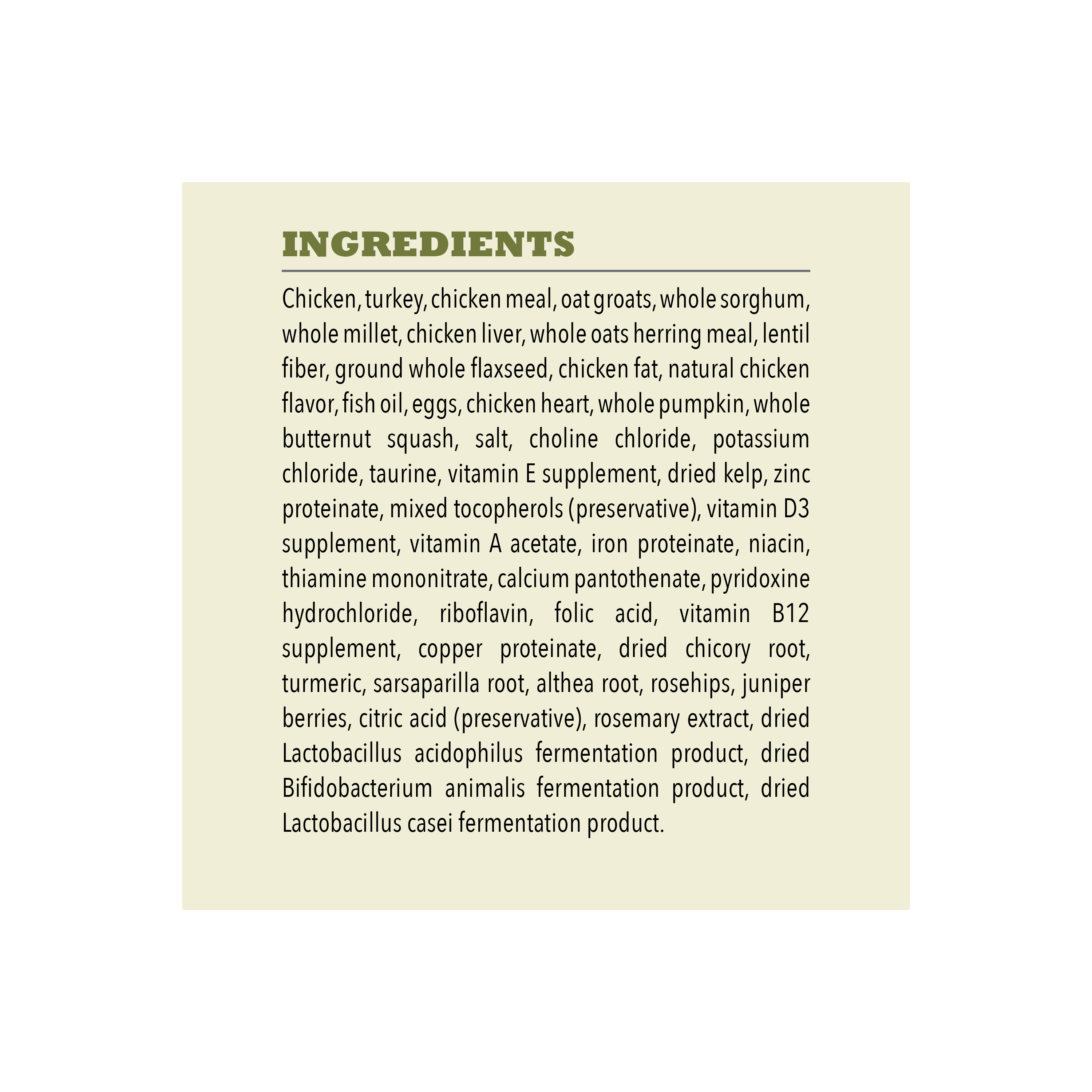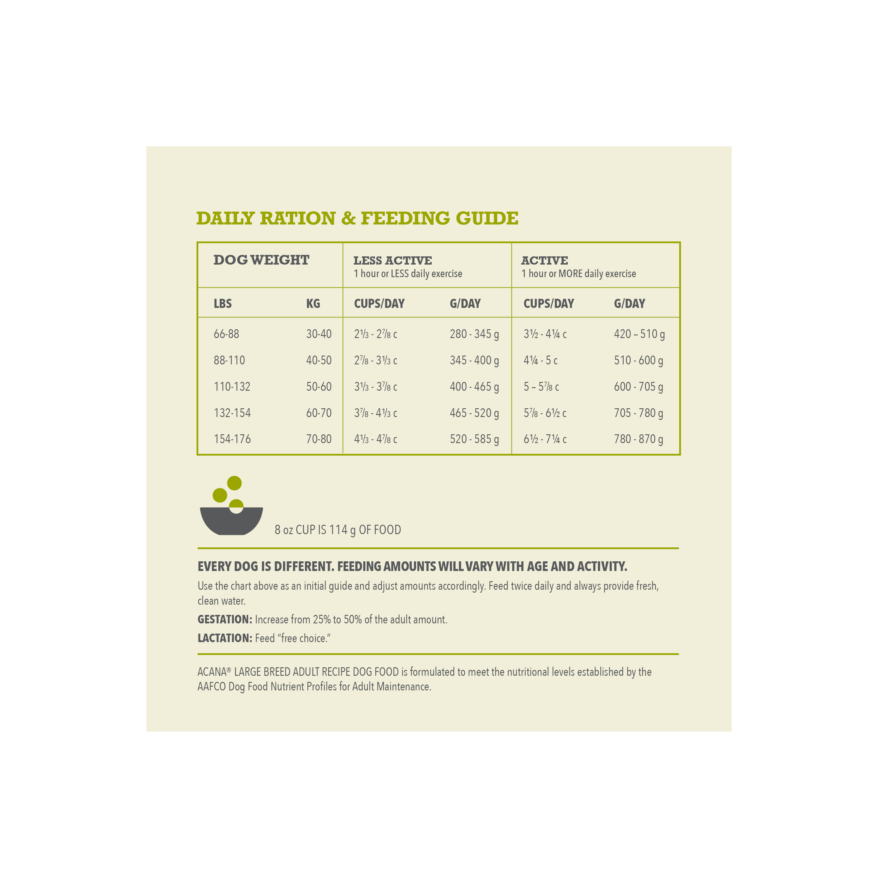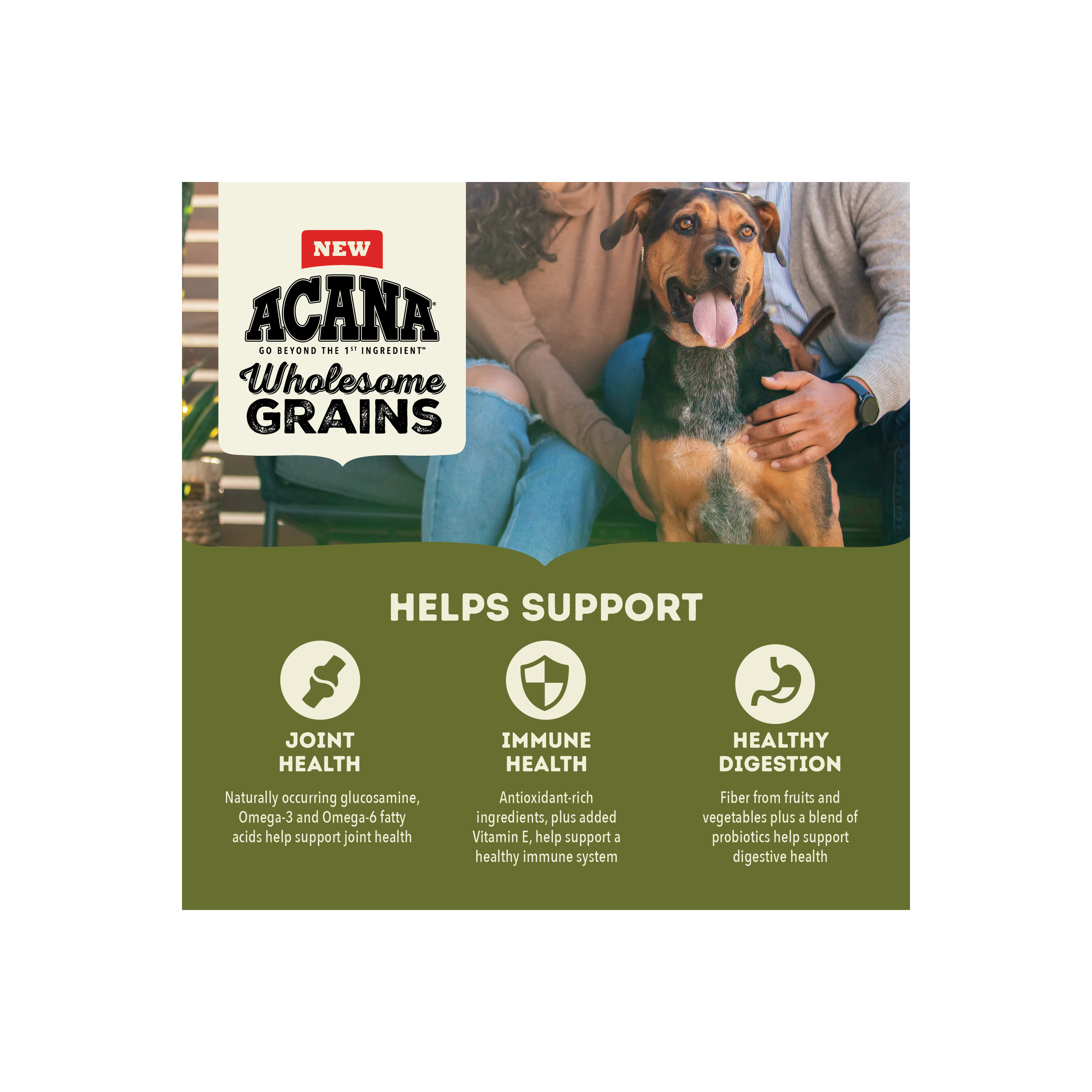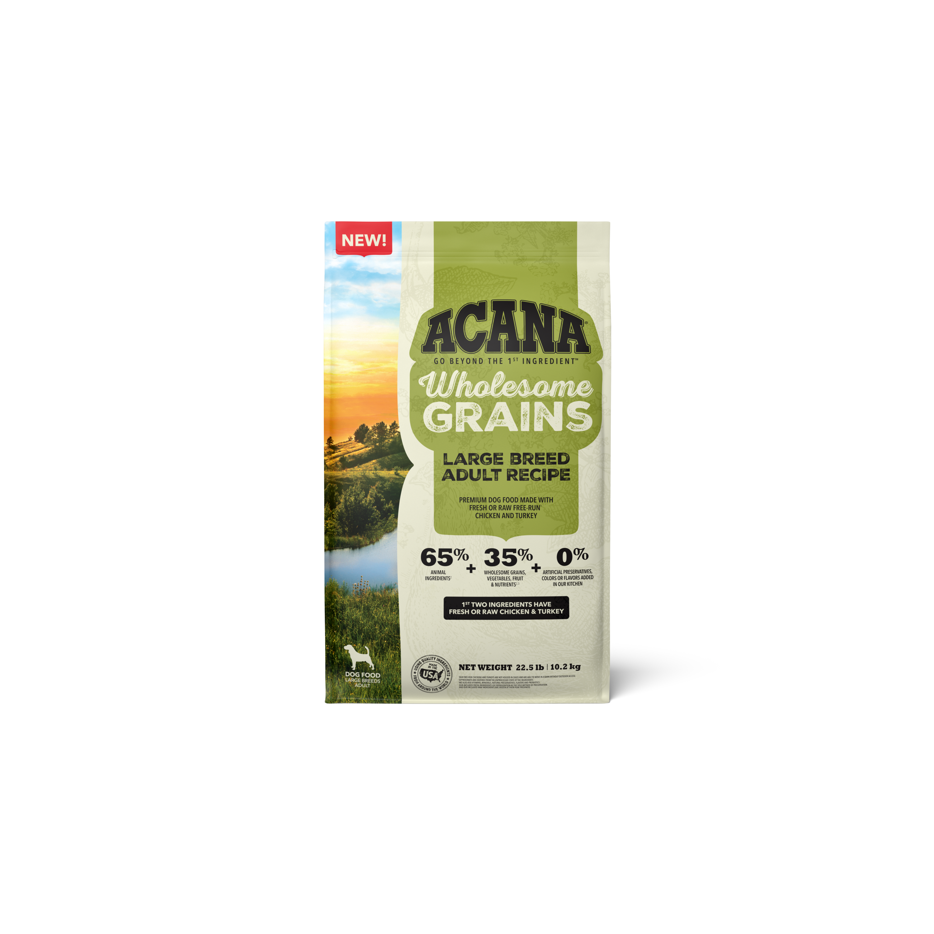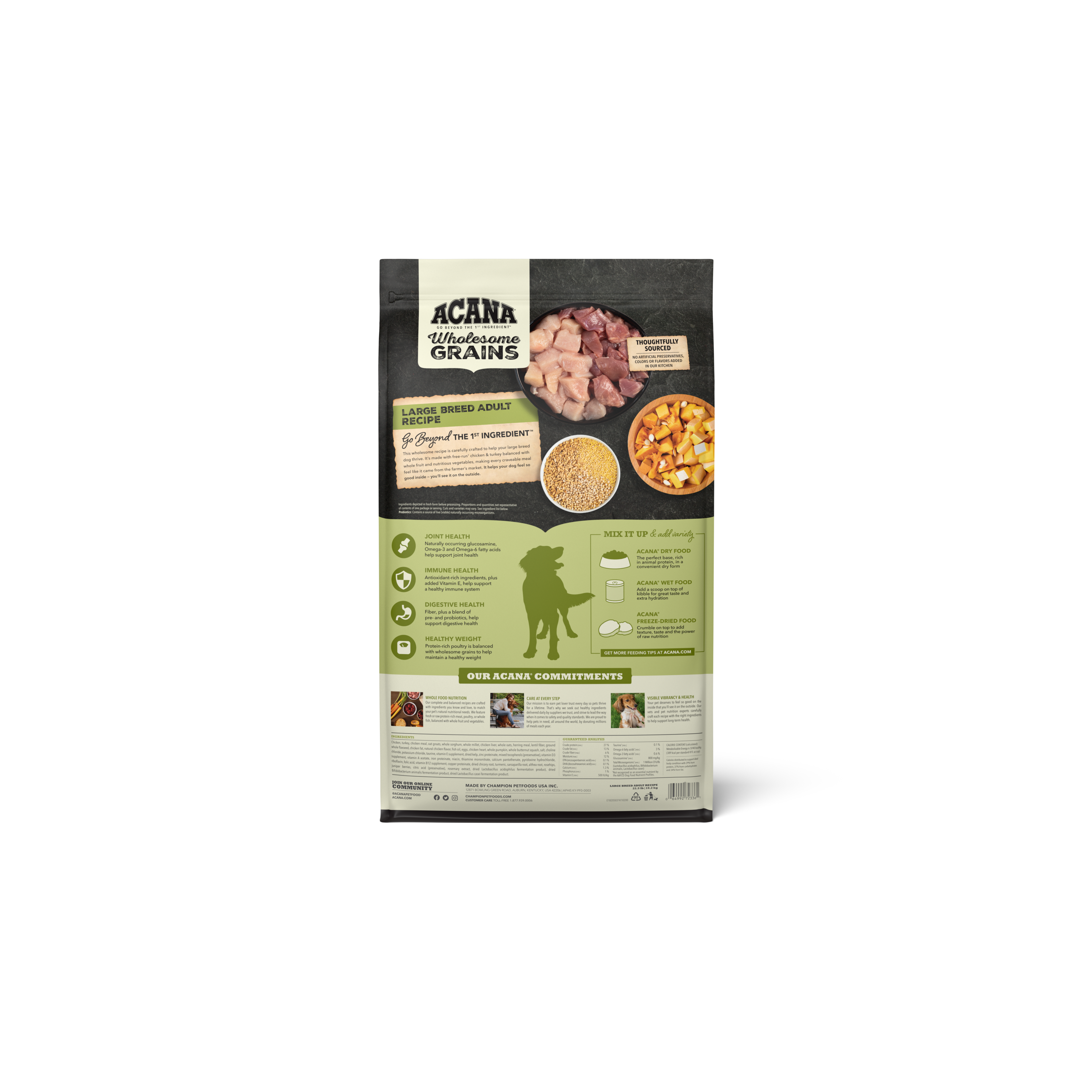Shop / ACANA / ACANA Wholesome Grains Large Breed Adult + Grains 22.5lb ACANA Wholesome Grains Large Breed Adult + Grains 22.5lb ACANA 22.5 LB $76.99 22.5 LB Purchase Options Free In-Store Pick Up Not Available Save 20% on orders $100+ Set your store for inventory and store pickup details Zip Code Search Same-day Delivery* No minimum charge for delivery orders. *Order before 2pm and have it delivered today. Orders placed after 2pm will be delivered the next day. Must be inside delivery radius. Zip Code Unfortunately delivery is not available to this address. In order to ensure the best availability accuracy, changing your selected store will remove all items from your cart. You will need to re-add these items with your newly selected store if you choose to continue. Continue Cancel Ship it to Me Quantity Add To Cart Feeding guide disclaimer ✕ Feeding guides provide a starting point for the amount of food to give your pet each day. We recommend that you keep your pet in ideal body condition and not allow them to become overweight. The amount of food your pet needs can vary based on age, activity level or other food and treats given, so be sure to work with your veterinarian to determine an appropriate weight for your pet, and to make any necessary adjustments to their feeding. Information Bring home the quality nutrition your dog needs to thrive with ACANA Wholesome Grains Large Breed Adult Recipe Dry Dog Food. This high protein dog food is formulated for adult, large breed dogs (70 lbs or more as an adult) and includes probiotics for dogs to offer dog digestive support. Protein-rich free run* chicken and free run* turkey are balanced with wholesome, fiber-rich grains to help support your large breed dog's digestive health. The dry dog food is 65 percent** animal ingredients and 35 percent*** wholesome grains, fruit and vegetables. Even better, the nutritious ingredients in this ACANA dog food support the unique needs of your large breed adult dog, helping support joint health, immune support, digestive health and weight. Choose ACANA Wholesome Grains Dry Dog Food today to give your companion the nutritional foundation they need to live a happy, healthy life. *Our free-run chickens and turkeys are not housed in cages and are able to move in a barn without outdoor access **Approximate and derived from the unprocessed state of the ingredients ***We also add vitamins, minerals, natural preservatives, flavors and probiotics One (1) 22.5 lb bag of ACANA Wholesome Grains Large Breed Adult Recipe Dry Dog Food High protein dog food recipe features free run* chicken and free run* turkey and is balanced to include 65 percent** animal ingredients and 35 percent*** wholesome grains, fruit, vegetables and nutrients A fiber-rich blend of wholesome grains plus probiotics for dogs helps support dog digestive health ACANA balances protein-rich animal ingredients with wholesome grains in kibble for large breed adult dogs that helps support their joint health, immune health, digestive health and healthy weight Premium dog food made in the USA with quality ingredients from around the world Ingredients Chicken, turkey, chicken meal, oat groats, whole sorghum, whole millet, chicken liver, whole oatsherring meal, lentil fiber, ground whole flaxseed, chicken fat, natural chicken flavor, fish oil, eggs,chicken heart, whole pumpkin, whole butternut squash, salt, choline chloride, potassium chloride,taurine, vitamin E supplement, dried kelp, zinc proteinate, mixed tocopherols (preservative), vitaminD3 supplement, vitamin A acetate, iron proteinate, niacin, thiamine mononitrate, calciumpantothenate, pyridoxine hydrochloride, riboflavin, folic acid, vitamin B12 supplement, copperproteinate, dried chicory root, turmeric, sarsaparilla root, althea root, rosehips, juniper berries, citricacid (preservative), rosemary extract, dried Lactobacillus acidophilus fermentation product, driedBifidobacterium animalis fermentation product, dried Lactobacillus casei fermentation product Guaranteed Analysis Crude protein 27% min, Crude fat 13% min, Crude fiber 6% max, Moisture 12% max, DHA (docosahexaenoic acid) 0.1% min, EPA (eicosapentaenoic acid) 0.1% min, Calcium 1.3% min, Phosphorus 1% min, Omega-6 fatty acids* 3% min, Omega-3 fatty acids* 0.6% min, Glucosamine *800 mg/kg min, Total Microorganisms* 1 Million CFU/lb, (Lactobacillus acidophilus, Bifidobacterium animalis, Lactobacillus casei), Vitamin E (min) 500 IU/kg *Not recognized as an essential nutrient by the AAFCO Dog Food Nutrient Profiles. Customers also liked Customer Reviews