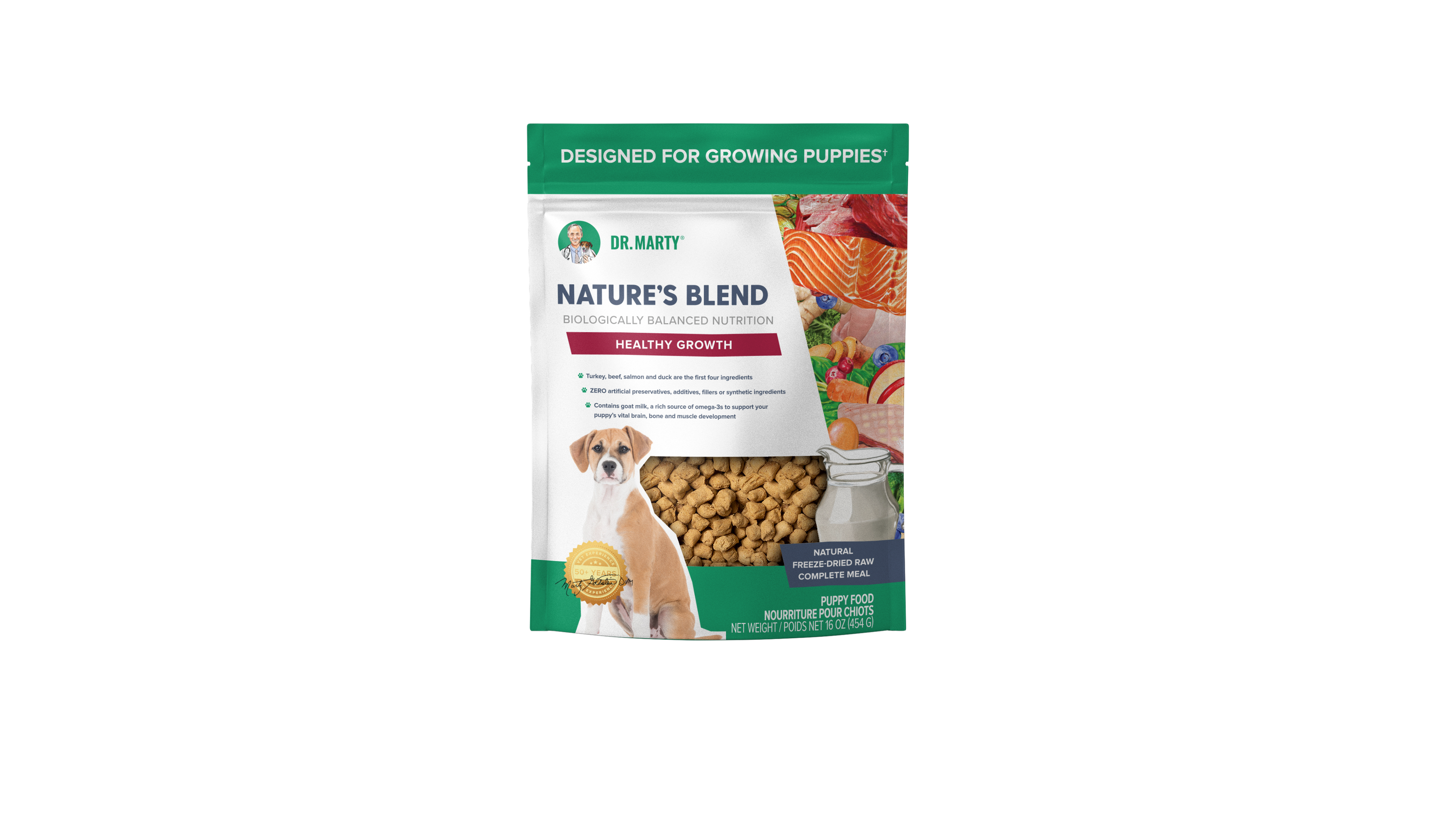 Shop / Products / Dr. Marty Nature's Blend for Puppies Freeze Dried Raw Dog Food Dr. Marty Nature's Blend for Puppies Freeze Dried Raw Dog Food Dr. Marty $14.99 6 oz 16 oz 6-oz 16-oz Purchase Options Free In-Store Pick Up Not Available Save 20% on orders $100+ Set your store for inventory and store pickup details Zip Code Search Same-day Delivery* No minimum charge for delivery orders. *Order before 2pm and have it delivered today. Orders placed after 2pm will be delivered the next day. Must be inside delivery radius. Zip Code Unfortunately delivery is not available to this address. In order to ensure the best availability accuracy, changing your selected store will remove all items from your cart. You will need to re-add these items with your newly selected store if you choose to continue. Continue Cancel Ship it to Me Quantity Add To Cart Feeding guide disclaimer ✕ Feeding guides provide a starting point for the amount of food to give your pet each day. We recommend that you keep your pet in ideal body condition and not allow them to become overweight. The amount of food your pet needs can vary based on age, activity level or other food and treats given, so be sure to work with your veterinarian to determine an appropriate weight for your pet, and to make any necessary adjustments to their feeding. Information Dr. Marty Nature's Blend is a premium, freeze-dried raw dog food formulated to support the health, happiness, and longevity of all adult dogs Unlike kibble cooked at high heat, Dr. Marty's freeze dried raw dog food locks in nutrients without harmful AGEs. No fillers, artificial preservatives, or synthetic additives—just pure, complete nutrition in every bite Zero artificial preservatives, additives, fillers or synthetic ingredients Use it as a mixer- If you'd like to boost your dog's diet with freeze-dried raw nutrition but don't want to replace their current food, you can use Nature's Blend as a mixer. Simply reduce the amount of Nature's Blend to avoid overfeeding Dr. Marty's freeze dried raw dog food is made in an FDA-audited, BRC-certified facility using HPP to eliminate pathogens. Each lot is tested for E.coli, Listeria, and Salmonella before release by our Quality Team Ingredients Turkey, Beef, Salmon, Duck, Beef Liver, Turkey Liver, Turkey Heart, Flaxseed, Sweet Potato, Egg, Pea Protein, Goat Milk, Apple, Blueberry, Carrot, Seaweed Derived Calcium, Cranberry, Pumpkin Seed, Spinach, Kelp, Ginger, Salt, Sunflower Seed, Broccoli, Kale, Mixed Tocopherols Guaranteed Analysis Nutrient Guaranteed Units Crude Protein 37% min Crude Fat 27% min Crude Fiber 4% max Moisture 6% max Customers also liked Customer Reviews