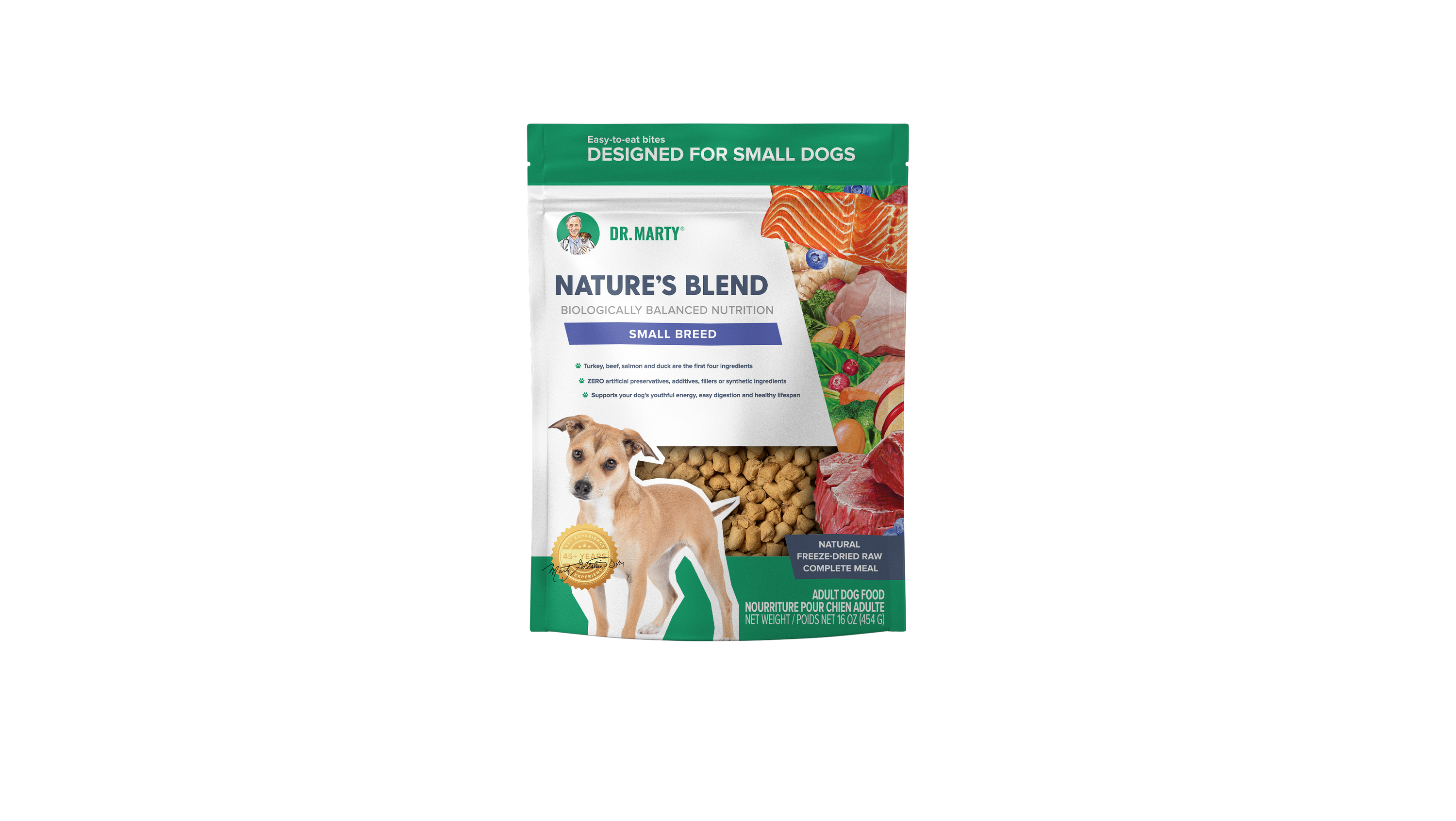 Shop / Products / Dr. Marty Nature's Blend Freeze Dried Raw Dog Food Dr. Marty Nature's Blend Freeze Dried Raw Dog Food Dr. Marty $14.99 $10 offDiscount will apply in cart $10 offDiscount will apply in cart 6 oz 16 oz 48 oz 6-oz 16-oz 48-oz Purchase Options Free In-Store Pick Up Not Available Save 20% on orders $100+ Set your store for inventory and store pickup details Zip Code Search Same-day Delivery* No minimum charge for delivery orders. *Order before 2pm and have it delivered today. Orders placed after 2pm will be delivered the next day. Must be inside delivery radius. Zip Code Unfortunately delivery is not available to this address. In order to ensure the best availability accuracy, changing your selected store will remove all items from your cart. You will need to re-add these items with your newly selected store if you choose to continue. Continue Cancel Ship it to Me Quantity Add To Cart Feeding guide disclaimer ✕ Feeding guides provide a starting point for the amount of food to give your pet each day. We recommend that you keep your pet in ideal body condition and not allow them to become overweight. The amount of food your pet needs can vary based on age, activity level or other food and treats given, so be sure to work with your veterinarian to determine an appropriate weight for your pet, and to make any necessary adjustments to their feeding. Information Dr. Marty Nature's Blend is a premium, freeze-dried raw dog food formulated to support the health, happiness, and longevity of all adult dogs Unlike kibble cooked at high heat, Dr. Marty's freeze dried raw dog food locks in nutrients without harmful AGEs. No fillers, artificial preservatives, or synthetic additives—just pure, complete nutrition in every bite Zero artificial preservatives, additives, fillers or synthetic ingredients Use it as a mixer- If you'd like to boost your dog's diet with freeze-dried raw nutrition but don't want to replace their current food, you can use Nature's Blend as a mixer. Simply reduce the amount of Nature's Blend to avoid overfeeding Dr. Marty's freeze dried raw dog food is made in an FDA-audited, BRC-certified facility using HPP to eliminate pathogens. Each lot is tested for E.coli, Listeria, and Salmonella before release by our Quality Team Ingredients Turkey, Beef, Salmon, Duck, Beef Liver, Turkey Liver, Turkey Heart, Flaxseed, Sweet Potato, Egg, Pea Flour, Apple, Blueberry, Carrot, Cranberry, Pumpkin Seed, Spinach, Dried Kelp, Ginger, Salt, Sunflower Seed, Broccoli, Kale, Mixed Tocopherols (natural preservative) Guaranteed Analysis Nutrient Guaranteed Units Crude Protein 37% min Crude Fat 27% min Crude Fiber 4% max Moisture 6% max Calcium 0.5% min Vitamin A 50,000 IU/kg min Omega-3 Fatty Acids 2.5% min Customers also liked Customer Reviews