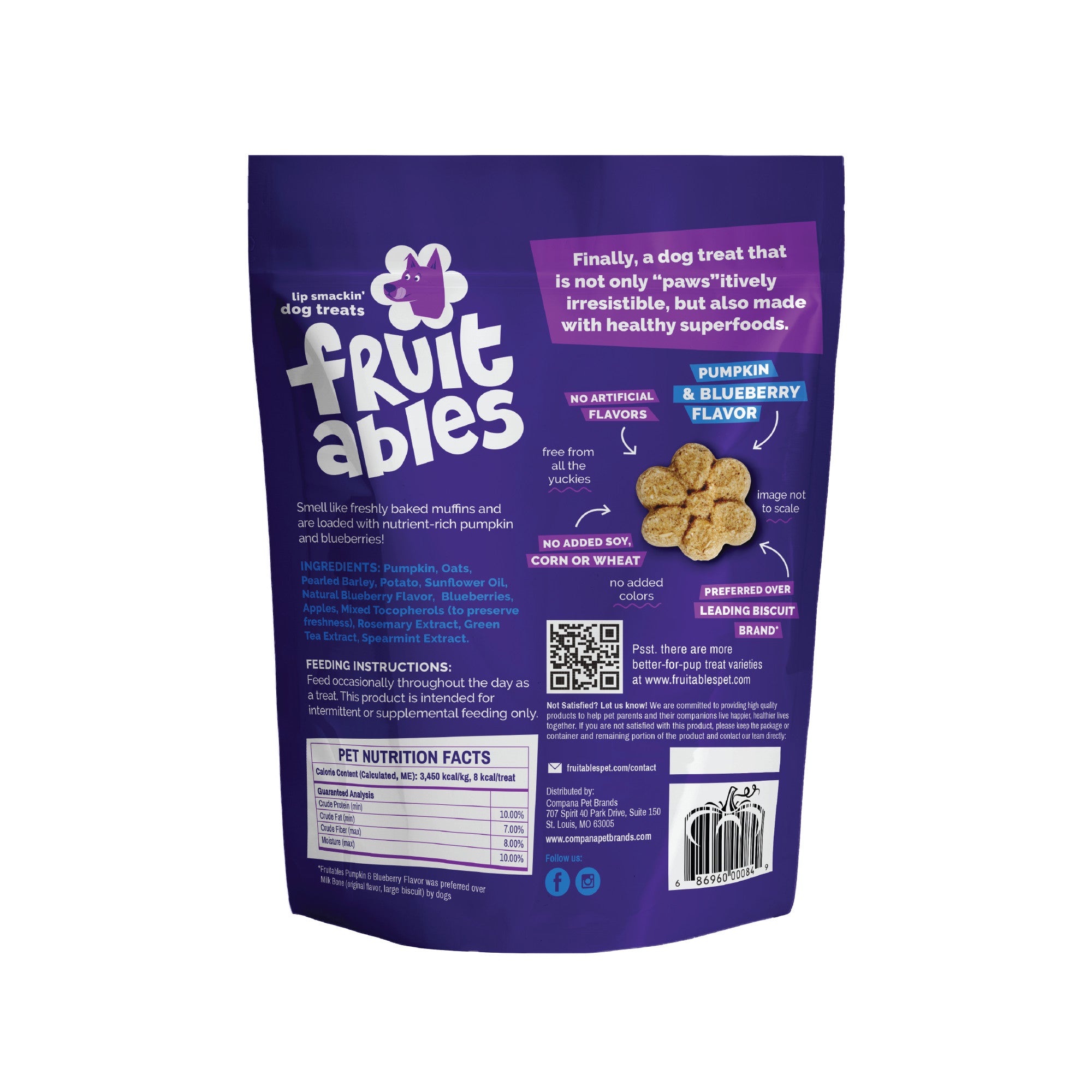 Shop / Products / Fruitables Baked Treats Pumpkin & Blueberry 12oz Fruitables Baked Treats Pumpkin & Blueberry 12oz Fruitables 12oz $6.99 12oz Purchase Options Free In-Store Pick Up Not Available Save 20% on orders $100+ Set your store for inventory and store pickup details Zip Code Search Same-day Delivery* No minimum charge for delivery orders. *Order before 2pm and have it delivered today. Orders placed after 2pm will be delivered the next day. Must be inside delivery radius. Zip Code Unfortunately delivery is not available to this address. In order to ensure the best availability accuracy, changing your selected store will remove all items from your cart. You will need to re-add these items with your newly selected store if you choose to continue. Continue Cancel Ship it to Me Quantity Add To Cart Feeding guide disclaimer ✕ Feeding guides provide a starting point for the amount of food to give your pet each day. We recommend that you keep your pet in ideal body condition and not allow them to become overweight. The amount of food your pet needs can vary based on age, activity level or other food and treats given, so be sure to work with your veterinarian to determine an appropriate weight for your pet, and to make any necessary adjustments to their feeding. Information Fruitables Baked Dog Treats bring a whole new level of flavor and health benefits to dog treats! These delicious, healthy dog treats are baked to perfection with real pumpkin, blueberries, and other wholesome ingredients to create a crunchy texture and aroma that dogs love. Each bite-sized treat is made with simple, natural ingredients, offering a lower-calorie option that fits easily into your pet’s balanced diet. Whether you’re looking for dog treats for medium dogs, dog treats for small dogs, or a general treat for all sizes, these Fruitables treats are perfect for training and rewarding. Designed as dog training treats, each crunchy biscuit is only 8 calories, making them an excellent choice for dog training. With a focus on delivering healthier dog treats, Fruitables are free from artificial fillers, corn, wheat, and soy, making them suitable even for dogs with food sensitivities. These pumpkin dog treats combine quality and flavor, ensuring your dog receives a nutritious and delicious snack. The natural sweetness from fruits like blueberries adds an extra fruity taste, making them irresistible to your furry friend. Proudly made in the USA, Fruitables dog treats are crafted with globally sourced ingredients and adhere to high-quality standards, providing peace of mind with every bite. These tasty dog treats are not only perfect for training sessions but are also an excellent way to show love and care daily. Choose Fruitables Baked Dog Treats for a deliciously crunchy, healthier treat that makes training and rewarding easy, fun, and worry-free for pet owners who want the best for their pets! FEATURES: -HEALTHY DOG TREATS: Crafted with wholesome pumpkin, these dog treats support digestion and deliver delicious flavor, making them a great choice for dog owners who want a nutritious reward for their furry friends! -LOW-CALORIE DOG TREATS: With only 8 calories per treat, these low-calorie treats allow for frequent training rewards or daily treats without adding unnecessary calories, helping maintain a healthy weight and lifestyle for your dog. -PERFECT FOR DOG TRAINING: These treats are designed for training, boasting an irresistible pumpkin and blueberry flavor that captures your dog’s attention and keeps them engaged during sessions, even for the most selective pups. -ALLERGY-FRIENDLY INGREDIENTS: Made without wheat, corn, or soy, these treats cater to dogs with common allergies and sensitivities, ensuring a safe, high-quality treat option that pet parents can feel confident giving.- CRAFTED FOR HEALTHIER CHOICES: With CalorieSmart nutrition, these treats help support healthier snacking by delivering tasty flavors without compromising on quality, so you can give your dog treats with peace of mind. INGREDIENTS: Pumpkin, Oats, Pearled Barley, Potato, Sunflower Oil, Natural Blueberry Flavor, Blueberries, Apples, Mixed Tocopherols (to preserve freshness), Rosemary Extract, Green Tea Extract, Spearmint Extract. GUARANTEED ANAYLSIS: Crude Protein (min) 10.00% Crude Fat (min) 7.00% Crude Fiber (max) 8.00% Moisture (max) 10.00% Customers also liked Customer Reviews