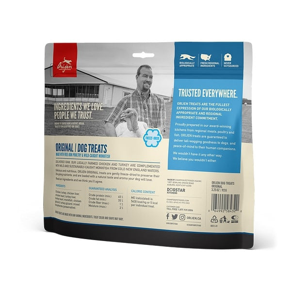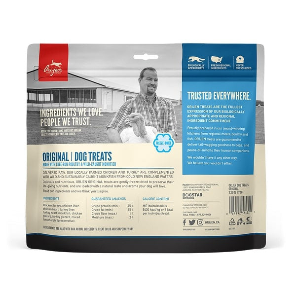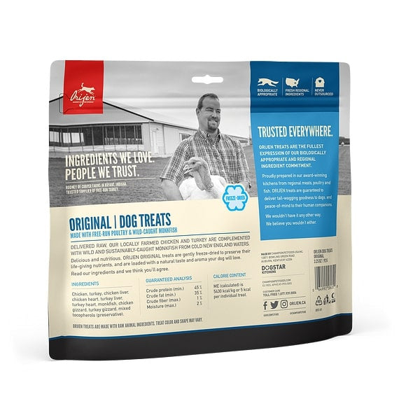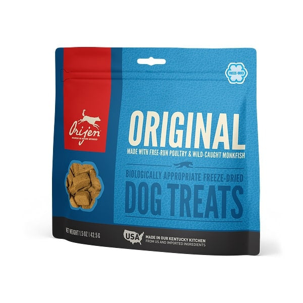 Shop / Products / ORIJEN Freeze Dried Original Dog Treats ORIJEN Freeze Dried Original Dog Treats ORIJEN Weight: 3.25 oz $16.99 3.25-oz Purchase Options Free In-Store Pick Up Not Available Save 10% on orders $49+ Set your store for inventory and store pickup details Zip Code Search Same-day Delivery* No minimum charge for delivery orders. *Order before 2pm and have it delivered today. Orders placed after 2pm will be delivered the next day. Must be inside delivery radius. Zip Code Unfortunately delivery is not available to this address. In order to ensure the best availability accuracy, changing your selected store will remove all items from your cart. You will need to re-add these items with your newly selected store if you choose to continue. Continue Cancel Ship it to Me Quantity Add To Cart Feeding guide disclaimer ✕ Feeding guides provide a starting point for the amount of food to give your pet each day. We recommend that you keep your pet in ideal body condition and not allow them to become overweight. The amount of food your pet needs can vary based on age, activity level or other food and treats given, so be sure to work with your veterinarian to determine an appropriate weight for your pet, and to make any necessary adjustments to their feeding. Information ORIJEN freeze-dried treats are prepared without cooking, so they retain all of the natural goodness of our authentically fresh ingredients. Our freeze-dry kitchens are equipped with nitrogen tunnels which flash-freeze our fresh ingredients at extremely low temperatures (-60°F), locking in their life-giving nutrients. Then an 18-hour freeze-drying process gently converts the water frozen in the ingredients into ice vapour, without creating any liquid. This means only water is removed from our fresh ingredients, leaving behind all their goodness in concentrated form, creating a nourishing taste experience your dog will love. Ingredients Chicken, turkey, turkey giblets (liver, heart, gizzard), chicken liver, flounder, chicken heart, mixed tocopherols (preservative), citric acid (preservative), rosemary extract. Guaranteed Analysis Nutrient Guaranteed Units Crude Protein 45% min Crude Fat 35% min Crude Fiber 1% max Moisture 2% max Customers also liked Customer Reviews