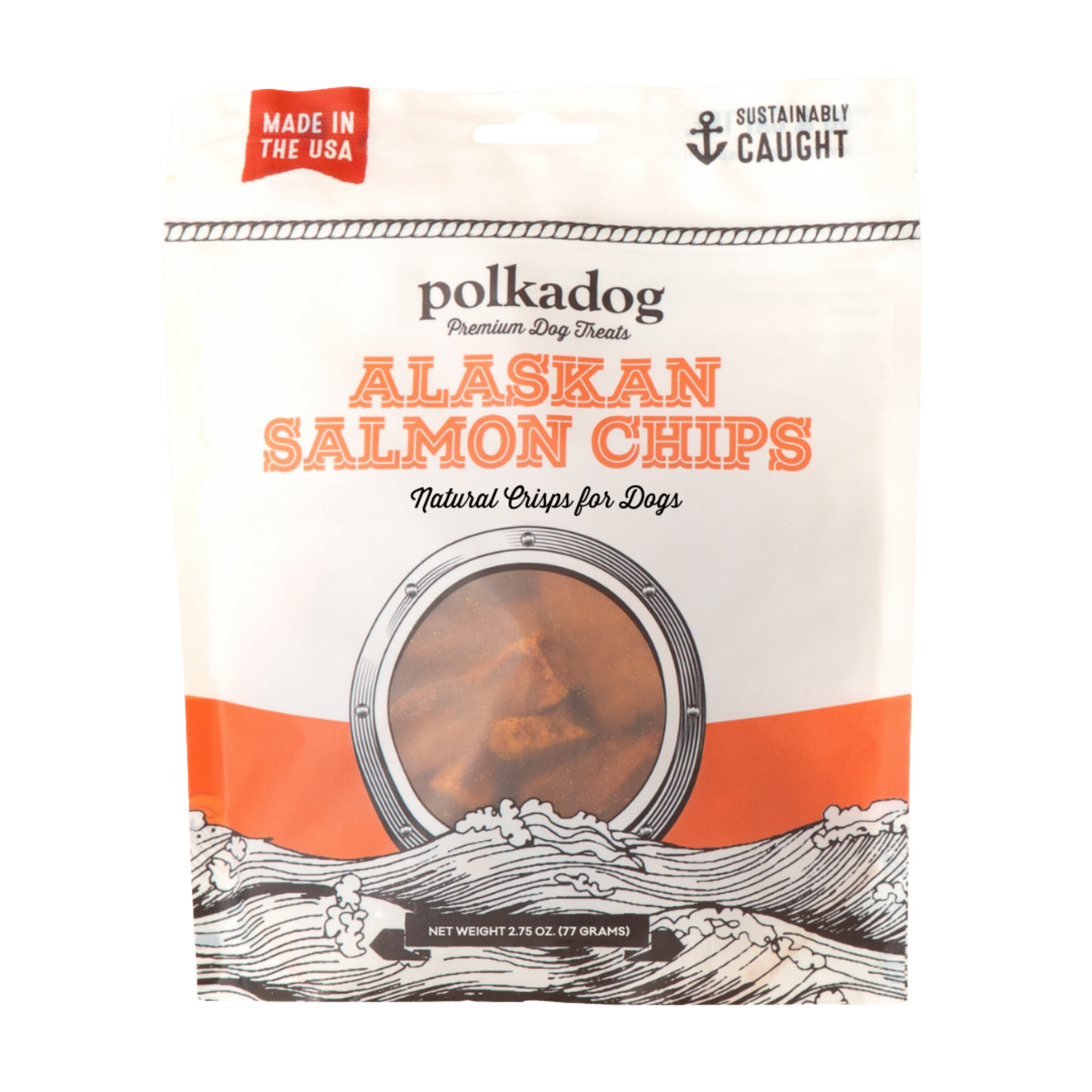 Shop / Products / Polkadog Salmon Chips Polkadog Salmon Chips Polkadog 2.75oz $13.99 2.75oz Purchase Options Free In-Store Pick Up Not Available Save 20% on orders $100+ Set your store for inventory and store pickup details Zip Code Search Same-day Delivery* No minimum charge for delivery orders. *Order before 2pm and have it delivered today. Orders placed after 2pm will be delivered the next day. Must be inside delivery radius. Zip Code Unfortunately delivery is not available to this address. In order to ensure the best availability accuracy, changing your selected store will remove all items from your cart. You will need to re-add these items with your newly selected store if you choose to continue. Continue Cancel Ship it to Me Quantity Add To Cart Feeding guide disclaimer ✕ Feeding guides provide a starting point for the amount of food to give your pet each day. We recommend that you keep your pet in ideal body condition and not allow them to become overweight. The amount of food your pet needs can vary based on age, activity level or other food and treats given, so be sure to work with your veterinarian to determine an appropriate weight for your pet, and to make any necessary adjustments to their feeding. Information Alaskan Salmon Chips are healthy dog treats crafted from 100% wild-caught, sustainably fished salmon from some of the cleanest waters on the globe. Chock full of nutrients and omega fatty acids, these single-ingredient treats are handmade, and as healthy as they are delicious. Ingredients: Salmon. Guaranteed Analysis: Crude Protein (Min) 60%, Crude Fat (Min) 11% Crude Fiber (Max) 1%, Moisture (Max) 18% 3540 kcal/kg 14.16 kcal/treat Customers also liked Customer Reviews