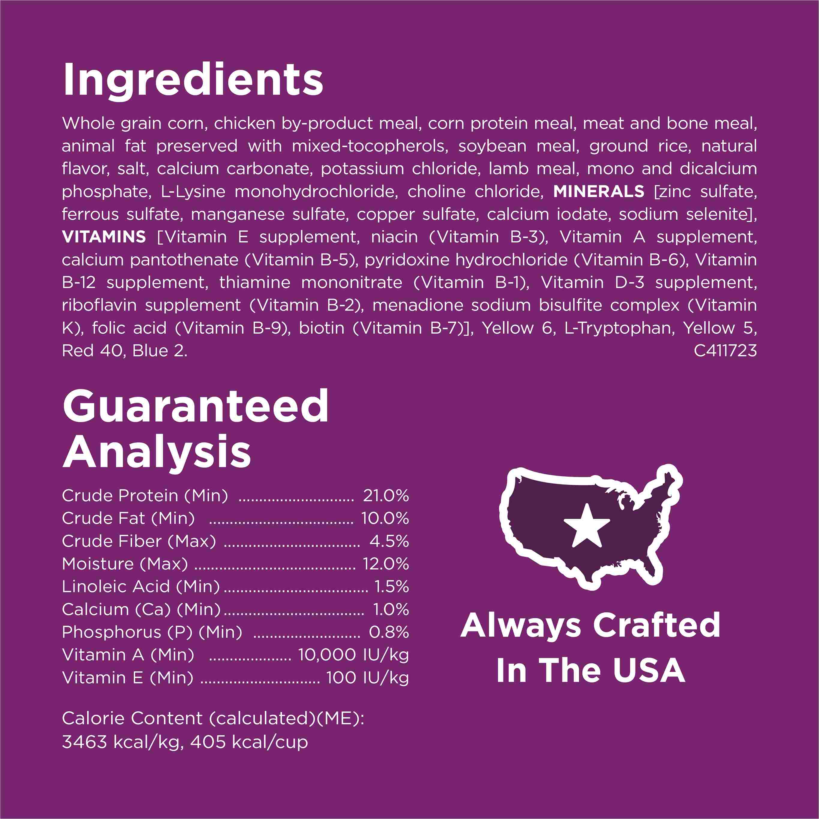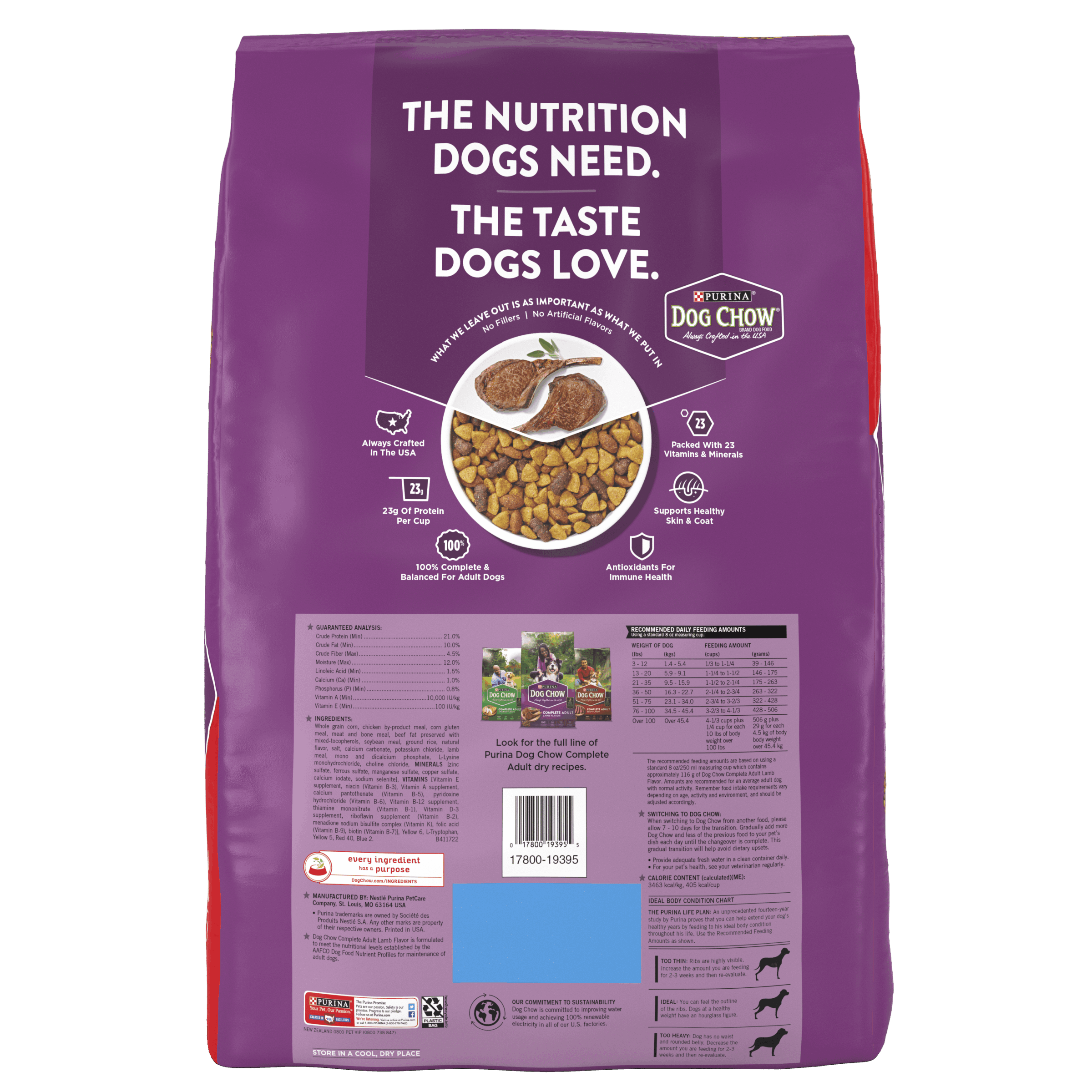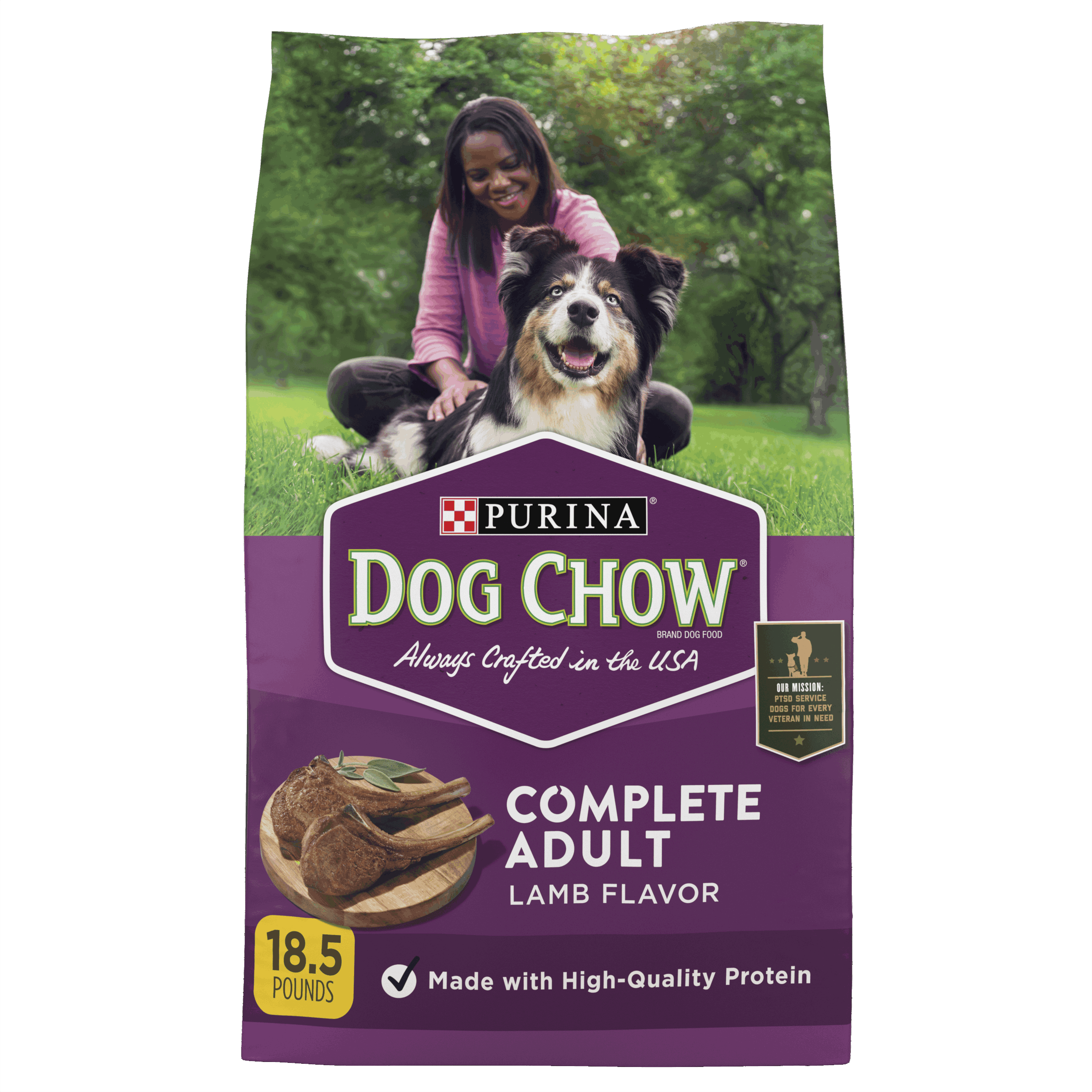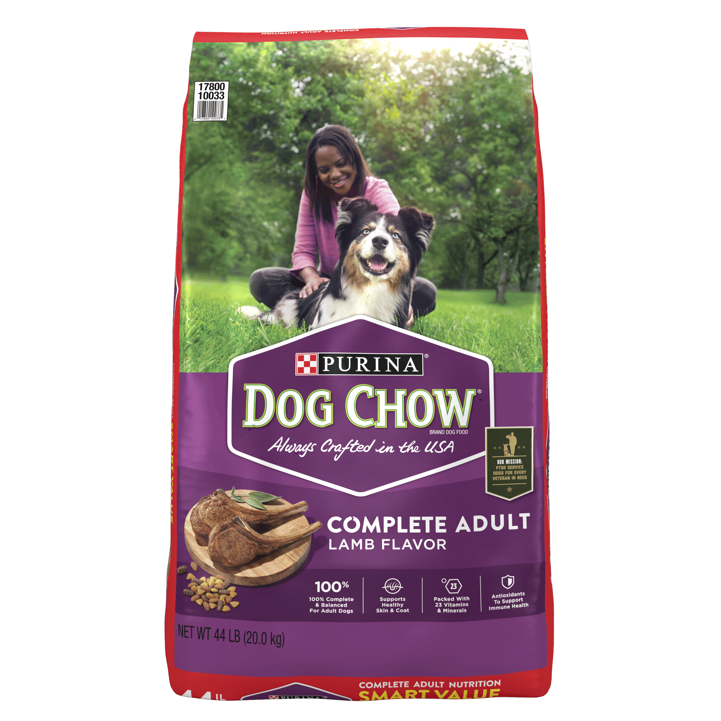 Shop / Products / Purina Dog Chow Complete Adult Dry Dog Food Kibble With Lamb Flavor Purina Dog Chow Complete Adult Dry Dog Food Kibble With Lamb Flavor Purina Dog Chow $18.99 18.5lb 44lb 18.5lb 44lb Purchase Options Free In-Store Pick Up Not Available Save 20% on orders $100+ Set your store for inventory and store pickup details Zip Code Search Same-day Delivery* No minimum charge for delivery orders. *Order before 2pm and have it delivered today. Orders placed after 2pm will be delivered the next day. Must be inside delivery radius. Zip Code Unfortunately delivery is not available to this address. In order to ensure the best availability accuracy, changing your selected store will remove all items from your cart. You will need to re-add these items with your newly selected store if you choose to continue. Continue Cancel Ship it to Me Quantity Add To Cart Feeding guide disclaimer ✕ Feeding guides provide a starting point for the amount of food to give your pet each day. We recommend that you keep your pet in ideal body condition and not allow them to become overweight. The amount of food your pet needs can vary based on age, activity level or other food and treats given, so be sure to work with your veterinarian to determine an appropriate weight for your pet, and to make any necessary adjustments to their feeding. Information Give your dog the taste they love and the nutrition they need with Purina Dog Chow Complete Adult Lamb Flavor dry dog food. We make this premium dog kibble with high-quality protein for dogs to support strong muscles. This adult dry dog food lamb flavor formula is packed with 23 vitamins and minerals to help support a healthy, active life, plus antioxidants to help support immune health. Purina Dog Chow brand kibble dog food provides 100 percent complete and balanced nutrition for adult dogs in a great-tasting dog food recipe. Your adult dog is sure to love every crunchy bite of this Purina dry dog food, and you can be confident you are giving them a wholesome food that fulfills all of their nutritional needs. Purina Dog Chow Complete adult dog food is always crafted in the USA and has been making dogs and their people happy since 1926. Ingredients Whole Grain Corn, Chicken By-Product Meal, Corn Protein Meal, Meat And Bone Meal, Animal Fat Preserved With Mixed-Tocopherols, Soybean Meal, Ground Rice, Natural Flavor, Salt, Calcium Carbonate, Potassium Chloride, Lamb Meal, Mono And Dicalcium Phosphate, L-Lysine Monohydrochloride, Choline Chloride, Minerals [Zinc Sulfate, Ferrous Sulfate, Manganese Sulfate, Copper Sulfate, Calcium Iodate, Sodium Selenite], Vitamins [Vitamin E Supplement, Niacin (Vitamin B-3), Vitamin A Supplement, Calcium Pantothenate (Vitamin B-5), Pyridoxine Hydrochloride (Vitamin B-6), Vitamin B-12 Supplement, Thiamine Mononitrate (Vitamin B-1), Vitamin D-3 Supplement, Riboflavin Supplement (Vitamin B-2), Menadione Sodium Bisulfite Complex (Vitamin K), Folic Acid (Vitamin B-9), Biotin (Vitamin B-7)], Yellow 6, L-Tryptophan, Yellow 5, Red 40, Blue 2. C411723 Guaranteed Analysis Crude Protein (Min)…21.0%, Crude Fat (Min)…10.0%, Crude Fiber (Max)…4.5%, Moisture (Max)…12.0%, Linoleic Acid (Min)…1.5%, Calcium (Ca) (Min)…1.0%, Phosphorus (P) (Min)…0.8%, Vitamin A (Min)…10,000 IU/kg, Vitamin E (Min)..100 IU/kg. Customers also liked Customer Reviews