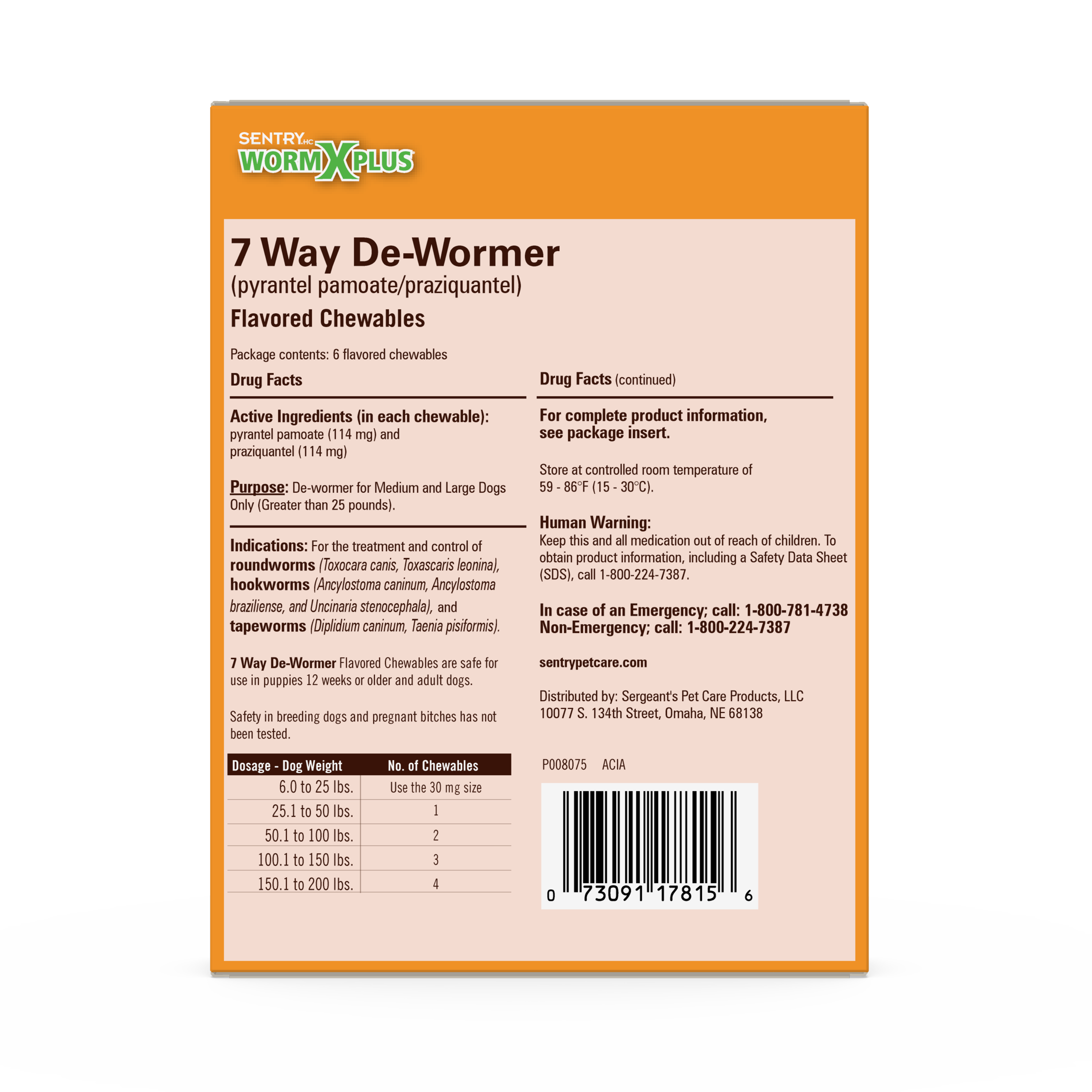Shop / Products / Sentry WormX Plus 7 Way DeWormer Dog Lrg 6CT Sentry WormX Plus 7 Way DeWormer Dog Lrg 6CT Sentry Default Title $49.99 Default Title Purchase Options Free In-Store Pick Up Not Available Save 20% on orders $100+ Set your store for inventory and store pickup details Zip Code Search Same-day Delivery* No minimum charge for delivery orders. *Order before 2pm and have it delivered today. Orders placed after 2pm will be delivered the next day. Must be inside delivery radius. Zip Code Unfortunately delivery is not available to this address. In order to ensure the best availability accuracy, changing your selected store will remove all items from your cart. You will need to re-add these items with your newly selected store if you choose to continue. Continue Cancel Ship it to Me Quantity Add To Cart Information This broad spectrum de-wormer controls two types of tapeworms, two types of roundworms, and three types of hookworms in medium and large sized dogs. SENTRY HC WORM X PLUS 7 Way De-Wormer contains two active ingredients found in veterinary brands: pyrantel pamoate and praziquantel and is available without a prescription. Customers also liked Customer Reviews