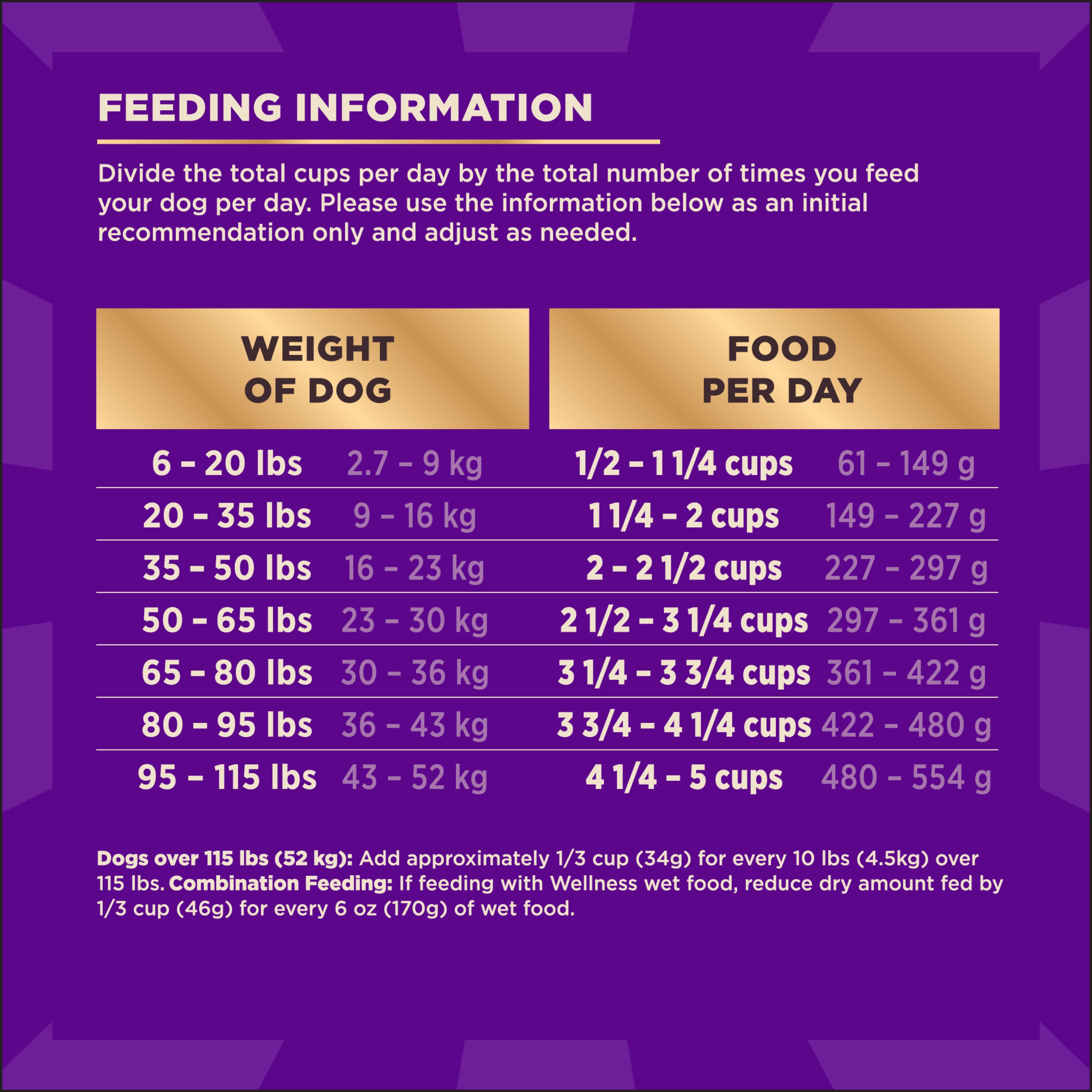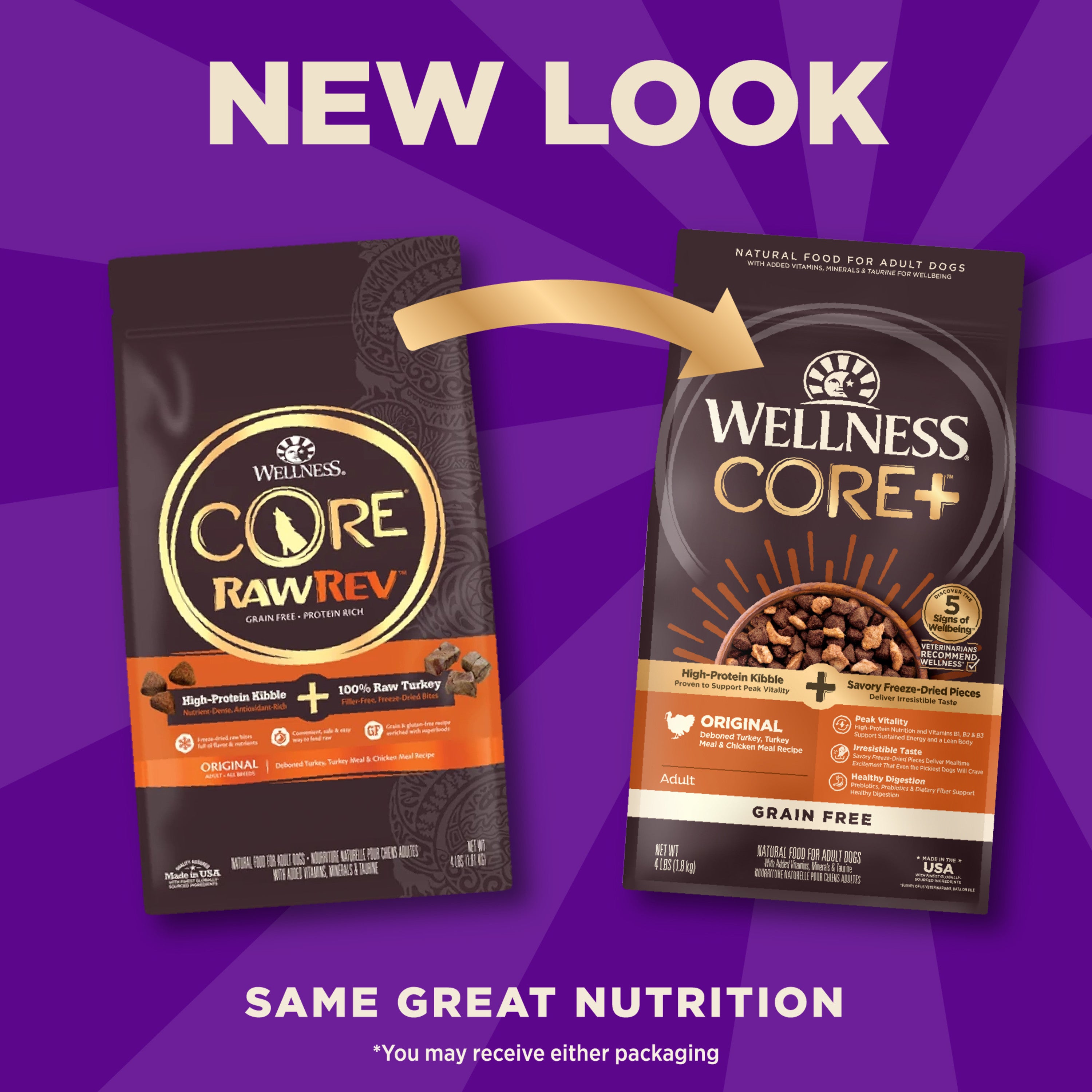 Shop / Products / Wellness CORE+ (Formerly RawRev) Dry Dog Food with Freeze Dried Pieces, Grain Free, High Protein, Natural, Original Turkey & Chicken Recipe, (4-Pound Bag) Wellness CORE+ (Formerly RawRev) Dry Dog Food with Freeze Dried Pieces, Grain Free, High Protein, Natural, Original Turkey & Chicken Recipe, (4-Pound Bag) Wellness 4lbs $23.99 4lbs Purchase Options Free In-Store Pick Up Not Available Save 20% on orders $100+ Set your store for inventory and store pickup details Zip Code Search Same-day Delivery* No minimum charge for delivery orders. *Order before 2pm and have it delivered today. Orders placed after 2pm will be delivered the next day. Must be inside delivery radius. Zip Code Unfortunately delivery is not available to this address. In order to ensure the best availability accuracy, changing your selected store will remove all items from your cart. You will need to re-add these items with your newly selected store if you choose to continue. Continue Cancel Ship it to Me Quantity Add To Cart Feeding guide disclaimer ✕ Feeding guides provide a starting point for the amount of food to give your pet each day. We recommend that you keep your pet in ideal body condition and not allow them to become overweight. The amount of food your pet needs can vary based on age, activity level or other food and treats given, so be sure to work with your veterinarian to determine an appropriate weight for your pet, and to make any necessary adjustments to their feeding. Information At their core, your dog instinctively craves raw animal protein. That’s why our revolutionary CORE+ recipes (formerly RawRev) give your dog the pure protein, natural enzymes and full flavor they need to thrive. We thoughtfully prepare our CORE+ kibble and freeze dried bites to keep the ingredients in their purest form and ensure every mealtime is packed with nourishment and enjoyment. Ingredients Deboned Turkey, Turkey Meal, Chicken Meal (source of Glucosamine and Chondroitin Sulfate), Dried Ground Potatoes, Lentils, Peas, Chicken Fat, Dried Plain Beet Pulp, Flaxseed, Turkey Liver, Turkey Hearts, Natural Flavor, Dried Chicory Root, Salmon Oil, Taurine, Vitamin E Supplement, Choline Chloride, Spinach, Broccoli, Carrots, Parsley, Apples, Blueberries, Kale, Mixed Tocopherols added to preserve freshness, Vitamin B3 (Niacin), Zinc Proteinate, Ferrous Sulfate, Zinc Sulfate, Iron Proteinate, Vitamin A Supplement, Vitamin B1 (Thiamine Mononitrate), d-Calcium Pantothenate, Sodium Selenite, Pyridoxine Hydrochloride, Copper Sulfate, Manganese Sulfate, Vitamin B2 (Riboflavin), Manganese Proteinate, Copper Proteinate, Biotin, Vitamin D3 Supplement, Yucca Schidigera Extract, Vitamin B12 Supplement, Folic Acid, Calcium Iodate, Vitamin C (Ascorbic Acid), Dried Enterococcus faecium Fermentation Product, Dried Bacillus licheniformis Fermentation Product, Dried Bacillus subtilis Fermentation Product, Rosemary Extract, Green Tea Extract, Spearmint Extract. This is a naturally preserved product Manufactured in a facility that also processes grains Guaranteed Analysis Crude Protein Not Less Than 35.0 %Crude Fat Not Less Than 15.0 %Crude Fiber Not More Than 4.50 %Moisture Not More Than 10.0 %Calcium Not Less Than 1.50 %Phosphorus Not Less Than 1.00 %Zinc Not Less Than 100 mg/kgVitamin A Not Less Than 25,000 IU/kgVitamin E Not Less Than 400 IU/kgThiamine Not Less Than 5.00 mg/kgRiboflavin Not Less Than 7.50 mg/kgNiacin Not Less Than 50.0 mg/kgBiotin* Not Less Than 0.10 mg/kgTaurine* Not Less Than 0.20 %Omega-6 Fatty Acids* Not Less Than 3.50 %Omega-3 Fatty Acids* Not Less Than 0.50 %Glucosamine* Not Less Than 1,200 mg/kgChondroitin Sulfate* Not Less Than 700 mg/kgTotal Microorganisms* Not Less Than 100,000,000 CFU/lb(Enterococcus faecium, Bacillus licheniformis, Bacillus subtilis) *Not recognized as an essential nutrient by the AAFCO Dog Food Nutrient Profiles Contains a source of live (viable) naturally occurring microorganisms Customers also liked Customer Reviews