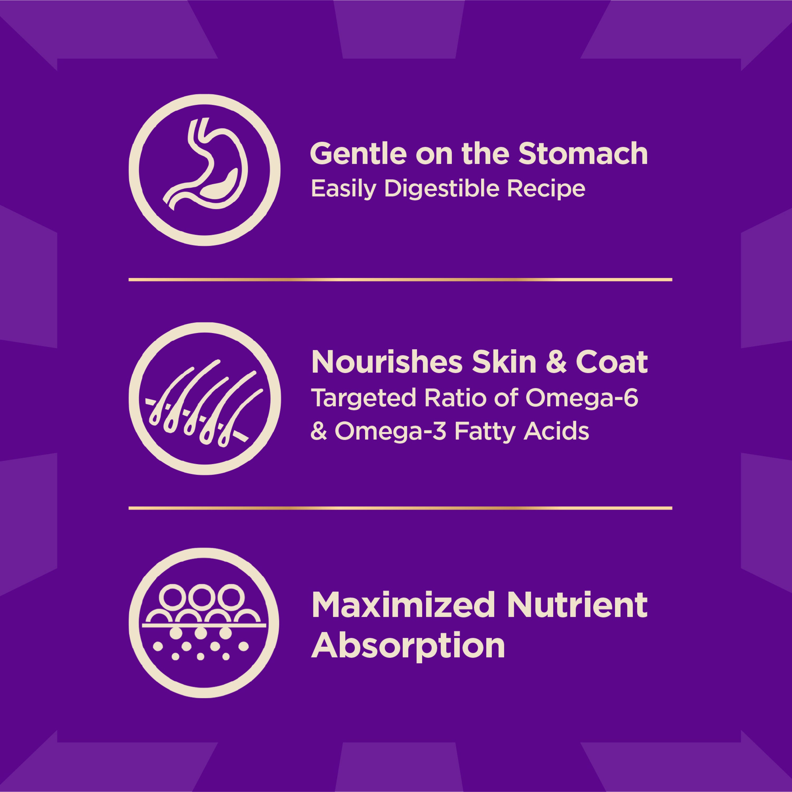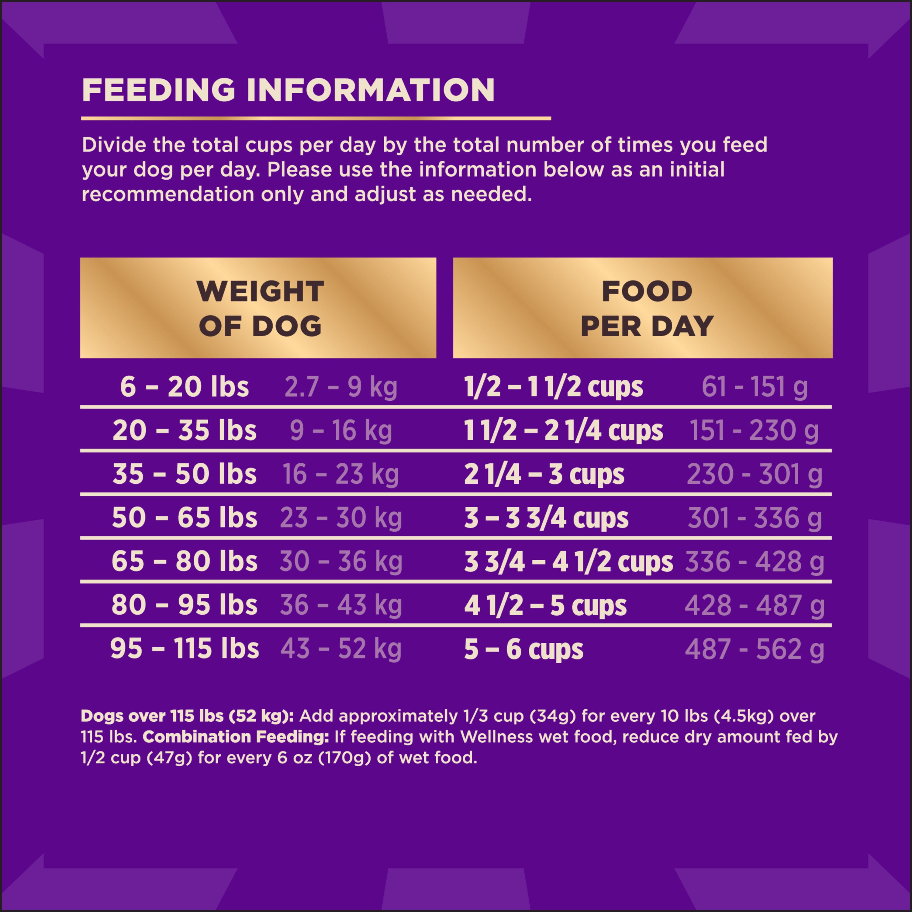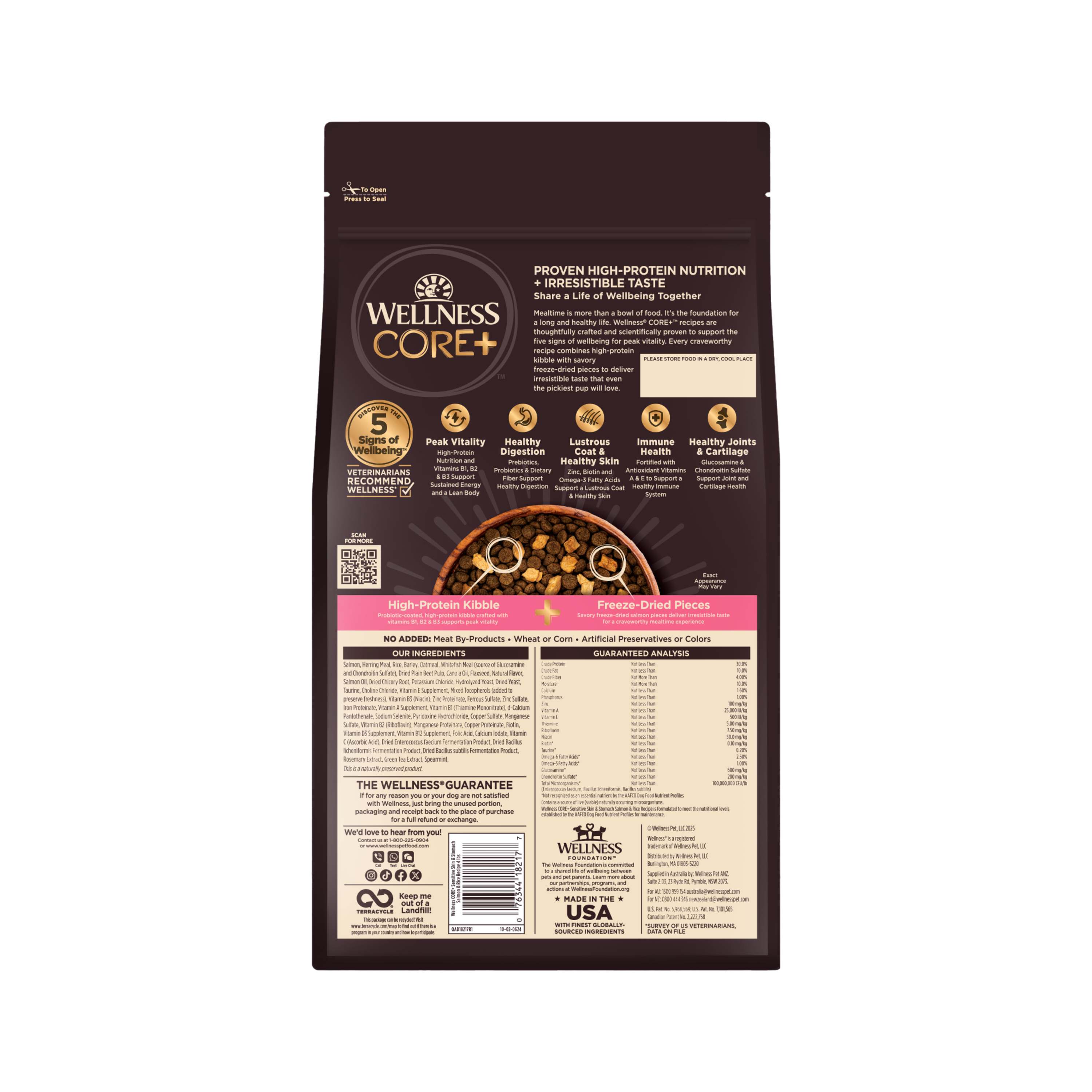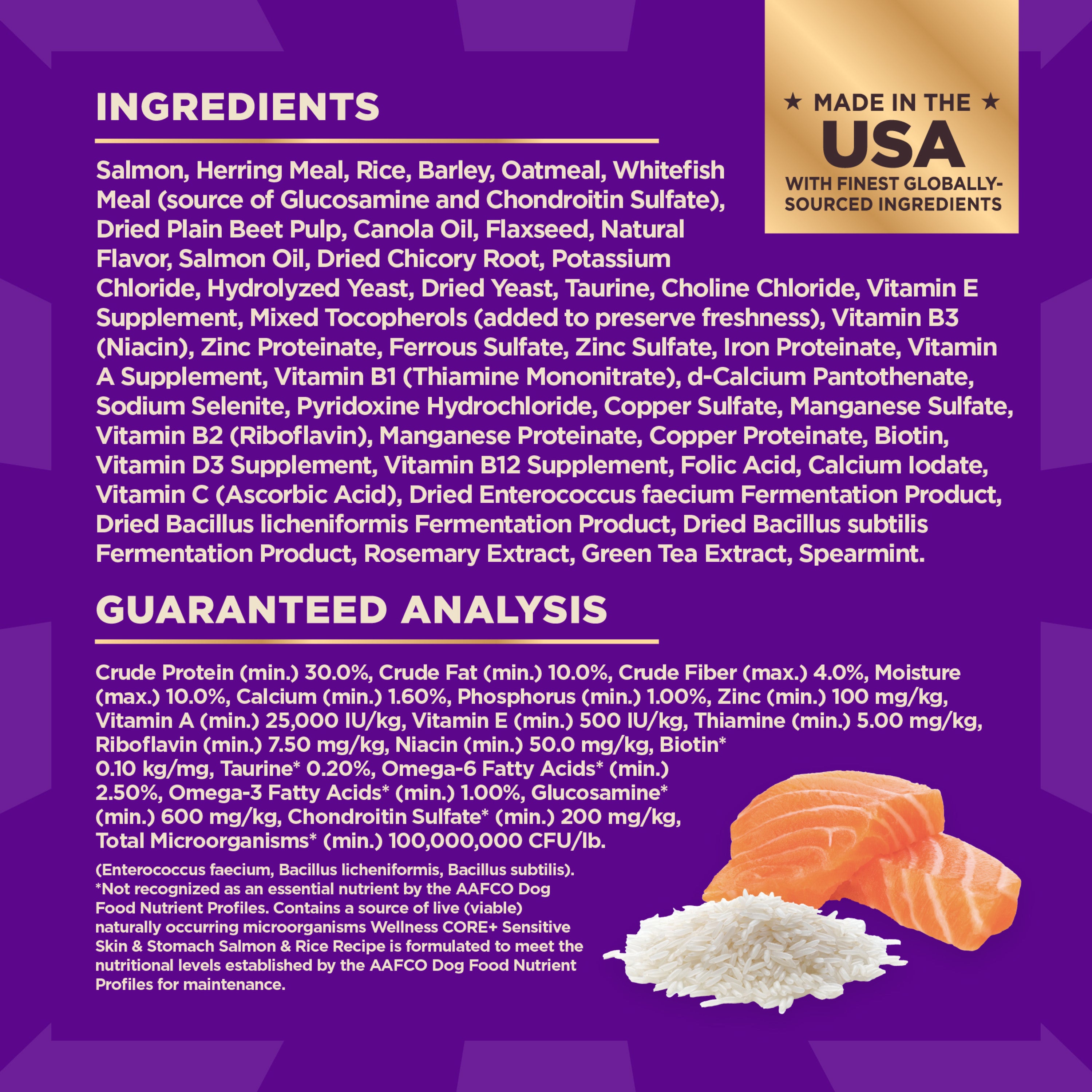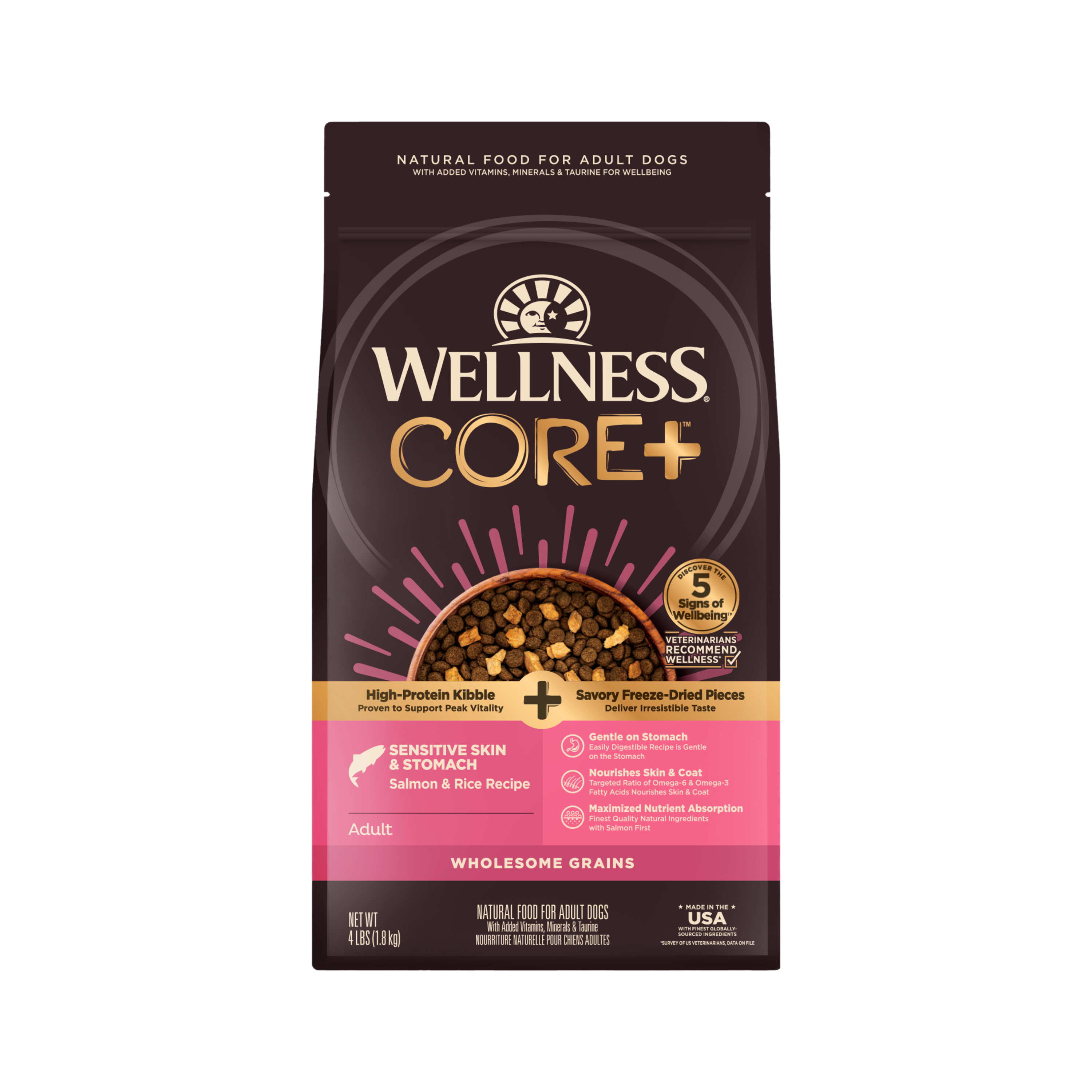 Shop / Products / Wellness CORE+ Sensitive Skin & Stomach Dry Dog Food with Freeze Dried Pieces, Wholesome Grains, High Protein, Natural, Salmon & Rice Recipe, (4-Pound Bag) Wellness CORE+ Sensitive Skin & Stomach Dry Dog Food with Freeze Dried Pieces, Wholesome Grains, High Protein, Natural, Salmon & Rice Recipe, (4-Pound Bag) Wellness 4lbs $23.99 4lbs Purchase Options Free In-Store Pick Up Not Available Save 20% on orders $100+ Set your store for inventory and store pickup details Zip Code Search Same-day Delivery* No minimum charge for delivery orders. *Order before 2pm and have it delivered today. Orders placed after 2pm will be delivered the next day. Must be inside delivery radius. Zip Code Unfortunately delivery is not available to this address. In order to ensure the best availability accuracy, changing your selected store will remove all items from your cart. You will need to re-add these items with your newly selected store if you choose to continue. Continue Cancel Ship it to Me Quantity Add To Cart Feeding guide disclaimer ✕ Feeding guides provide a starting point for the amount of food to give your pet each day. We recommend that you keep your pet in ideal body condition and not allow them to become overweight. The amount of food your pet needs can vary based on age, activity level or other food and treats given, so be sure to work with your veterinarian to determine an appropriate weight for your pet, and to make any necessary adjustments to their feeding. Information At their core, your dog instinctively craves raw animal protein. That’s why our revolutionary CORE+ recipes give your dog the pure protein, natural enzymes and full flavor they need to thrive. We thoughtfully prepare our CORE+ kibble and freeze dried bites to keep the ingredients in their purest form and ensure every mealtime is packed with nourishment and enjoyment. Ingredients Salmon, Herring Meal, Rice, Barley, Oatmeal, Whitefish Meal (source of Glucosamine and Chondroitin Sulfate), Dried Plain Beet Pulp, Canola Oil, Flaxseed, Natural Flavor, Salmon Oil, Dried Chicory Root, Potassium Chloride, Hydrolyzed Yeast, Dried Yeast, Taurine, Choline Chloride, Vitamin E Supplement, Mixed Tocopherols (added to preserve freshness), Vitamin B3 (Niacin), Zinc Proteinate, Ferrous Sulfate, Zinc Sulfate, Iron Proteinate, Vitamin A Supplement, Vitamin B1 (Thiamine Mononitrate), Vitamin B5 (d-Calcium Pantothenate), Sodium Selenite, Vitamin B6 (Pyridoxine Hydrochloride), Copper Sulfate, Manganese Sulfate, Vitamin B2 (Riboflavin), Manganese Proteinate, Copper Proteinate, Vitamin B7 (Biotin), Vitamin D3 Supplement, Vitamin B12 Supplement, Vitamin B9 (Folic Acid), Calcium Iodate, Vitamin C (Ascorbic Acid), Dried Enterococcus faecium Fermentation Product, Dried Bacillus licheniformis Fermentation Product, Dried Bacillus subtilis Fermentation Product, Rosemary Extract, Green Tea Extract, Spearmint Extract. Guaranteed Analysis Crude Protein Not Less Than 30.0 %Crude Fat Not Less Than 10.0 %Crude Fiber Not More Than 4.00 %Moisture Not More Than 10.0 %Calcium Not Less Than 1.60 %Phosphorus Not Less Than 1.00 %Zinc Not Less Than 100 mg/kgVitamin A Not Less Than 25,000 IU/kgVitamin E Not Less Than 500 IU/kgThiamine Not Less Than 5.00 mg/kgRiboflavin Not Less Than 7.50 mg/kgNiacin Not Less Than 50.0 mg/kgBiotin* Not Less Than 0.10 mg/kgTaurine* Not Less Than 0.20 %Omega-6 Fatty Acids* Not Less Than 2.50 %Omega-3 Fatty Acids* Not Less Than 1.00 %Glucosamine* Not Less Than 600 mg/kgChondroitin Sulfate* Not Less Than 200 mg/kgTotal Microorganisms* Not Less Than 100,000,000 CFU/lb(Enterococcus faecium, Bacillus licheniformis, Bacillus subtilis) *Not recognized as an essential nutrient by the AAFCO Dog Food Nutrient Profiles *Not recognized as an essential nutrient by the AAFCO Dog Food Nutrient Profiles *Not recognized as an essential nutrient by the AAFCO Dog Food Nutrient Profiles *Not recognized as an essential nutrient by the AAFCO Dog Food Nutrient Profiles *Not recognized as an essential nutrient by the AAFCO Dog Food Nutrient Profiles *Not recognized as an essential nutrient by the AAFCO Dog Food Nutrient Profiles *Not recognized as an essential nutrient by the AAFCO Dog Food Nutrient Profiles *Not recognized as an essential nutrient by the AAFCO Dog Food Nutrient Profiles *Not recognized as an essential nutrient by the AAFCO Dog Food Nutrient Profiles *Not recognized as an essential nutrient by the AAFCO Dog Food Nutrient ProfilesContains a source of live (viable) naturally occurring microorganisms Customers also liked Customer Reviews