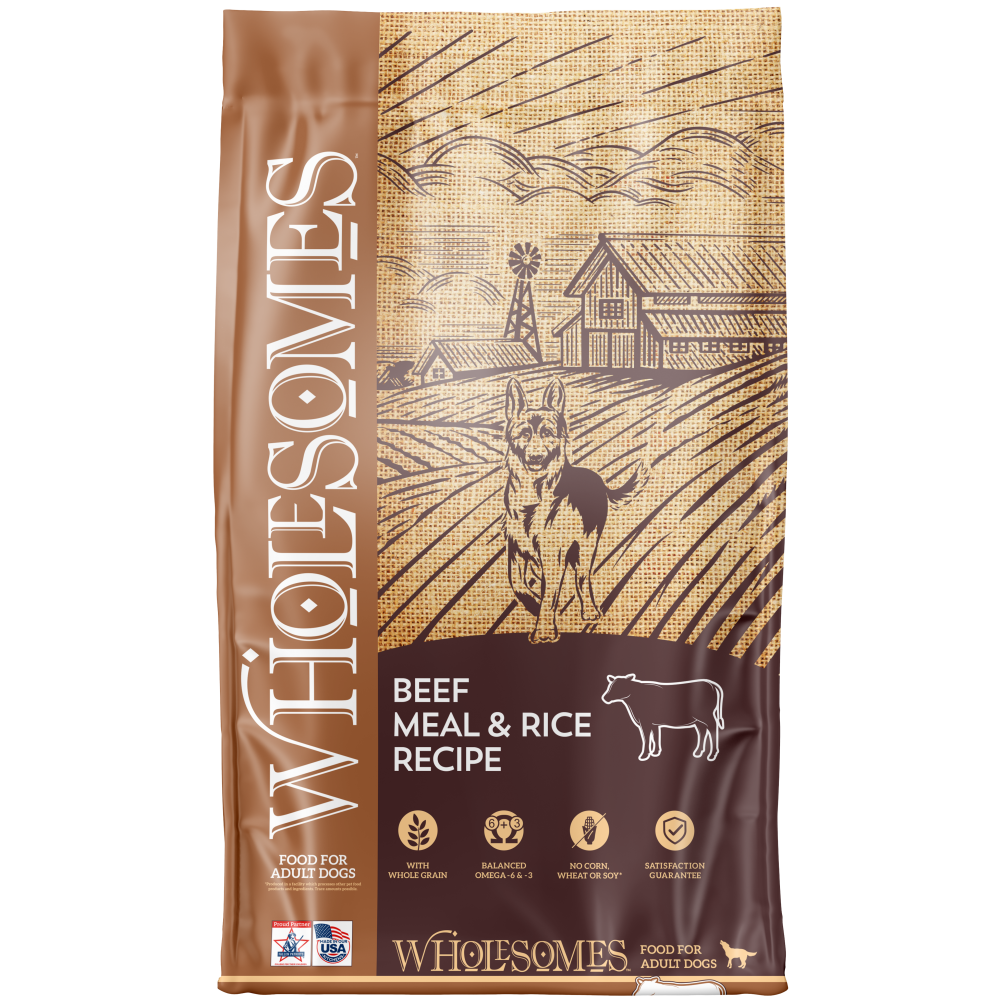 Shop / Products / Wholesomes Beef Meal & Rice Recipe For Adult Dogs Wholesomes Beef Meal & Rice Recipe For Adult Dogs Wholesomes 40 lb $47.99 40 lb Purchase Options Free In-Store Pick Up Not Available Save 20% on orders $100+ Set your store for inventory and store pickup details Zip Code Search Same-day Delivery* No minimum charge for delivery orders. *Order before 2pm and have it delivered today. Orders placed after 2pm will be delivered the next day. Must be inside delivery radius. Zip Code Unfortunately delivery is not available to this address. In order to ensure the best availability accuracy, changing your selected store will remove all items from your cart. You will need to re-add these items with your newly selected store if you choose to continue. Continue Cancel Ship it to Me Quantity Add To Cart Feeding guide disclaimer ✕ Feeding guides provide a starting point for the amount of food to give your pet each day. We recommend that you keep your pet in ideal body condition and not allow them to become overweight. The amount of food your pet needs can vary based on age, activity level or other food and treats given, so be sure to work with your veterinarian to determine an appropriate weight for your pet, and to make any necessary adjustments to their feeding. Information Wholesomes Beef Meal & Rice is a hearty recipe designed with beef meal as the principal source of protein. Wholesomes Beef Meal & Rice is made without high-moisture protein sources or common grains such as corn, wheat or soybeans. Nutritionally balanced Omega-6 and Omega-3 fatty acids, in addition to highly available minerals, help promote healthy skin and hair coat. Wholesomes Beef Meal and Rice supplies your dog with a 100% complete and balanced diet for a healthy, active life. Ingredients Beef Meal, Brown Rice, Peas, Pea Protein, Chicken Fat (Preserved with Mixed Tocopherols), Pea Starch, Rice, Beet Pulp, Flaxseed, Salt, Potassium Chloride, Choline Chloride, DL-Methionine, Vitamin E Supplement, Niacin, Calcium Pantothenate, Vitamin A Supplement, Riboflavin Supplement, Thiamine Mononitrate, Pyridoxine Hydrochloride, Biotin, Vitamin B12 Supplement, Vitamin D3 Supplement, Folic Acid, Zinc Sulfate, Ferrous Sulfate, Copper Sulfate, Manganese Sulfate, Zinc Proteinate, Copper Proteinate, Manganese Proteinate, Sodium Selenite, Calcium Iodate, Cobalt Carbonate, Rosemary Extract. Guaranteed Analysis Nutrient AnalysisCrude Protein 24.0% min.Crude Fat 14.0% min.Crude FIber 5.0% max.Moisture 10.0% max.Omega-6 Fatty Acids* 2.0% min.Omega-3 Fatty Acids* 0.4% min*Not recognized as an essential nutrient by the AAFCO Dog Food Nutrient Profiles. Customers also liked Customer Reviews