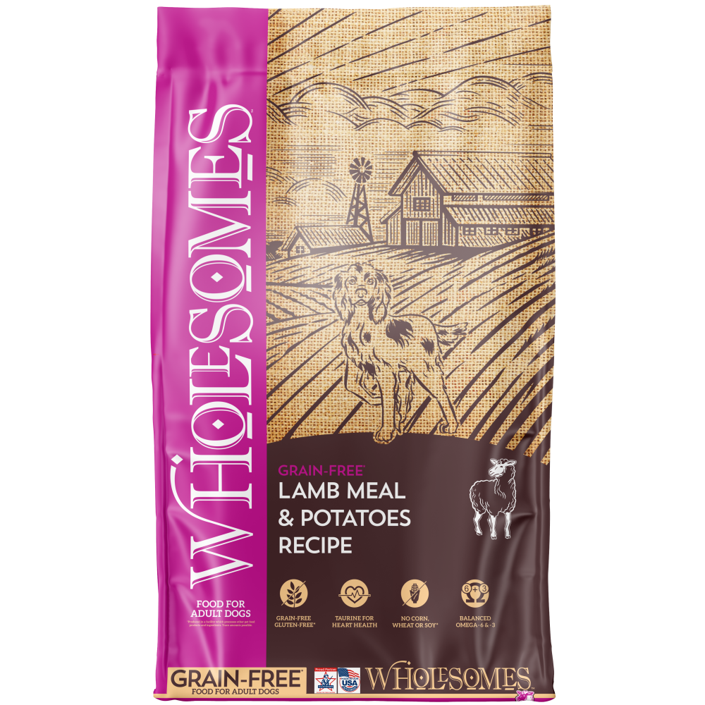Shop / Products / Wholesomes Lamb Meal & Potatoes Recipe For Adult Dogs Wholesomes Lamb Meal & Potatoes Recipe For Adult Dogs Wholesomes 35 lb $49.99 35 lb Purchase Options Free In-Store Pick Up Not Available Save 20% on orders $100+ Set your store for inventory and store pickup details Zip Code Search Same-day Delivery* No minimum charge for delivery orders. *Order before 2pm and have it delivered today. Orders placed after 2pm will be delivered the next day. Must be inside delivery radius. Zip Code Unfortunately delivery is not available to this address. In order to ensure the best availability accuracy, changing your selected store will remove all items from your cart. You will need to re-add these items with your newly selected store if you choose to continue. Continue Cancel Ship it to Me Quantity Add To Cart Feeding guide disclaimer ✕ Feeding guides provide a starting point for the amount of food to give your pet each day. We recommend that you keep your pet in ideal body condition and not allow them to become overweight. The amount of food your pet needs can vary based on age, activity level or other food and treats given, so be sure to work with your veterinarian to determine an appropriate weight for your pet, and to make any necessary adjustments to their feeding. Information Wholesomes Lamb Meal & Potatoes Recipe provides a highly digestible grain-free, gluten-free diet to support your dog’s overall nutrition. Made with the farmland’s finest high-quality protein & farm-grown fruits & vegetables that provide the energy & nutrients needed to maintain excellent health. Balanced Omega-6 & Omega-3 fatty acids promote good skin & hair coat. Wholesomes supplies your pet with a 100% complete & balanced diet for a healthy active life. Ingredients Lamb Meal, Potatoes, Peas, Canola Oil (Preserved with Mixed Tocopherols), Chickpeas, Pea Starch, Sweet Potato, Pea Protein, Pea Fiber, Natural Flavor, Flaxseed, Apples, Blueberries, Cranberries, Carrots, Spinach, Salt, Potassium Chloride, Choline Chloride, DL-Methionine, Taurine, Vitamins (Vitamin E Supplement, Niacin, Calcium Pantothenate, Vitamin A Supplement, Riboflavin Supplement, Thiamine Mononitrate, Pyridoxine Hydrochloride, Biotin, Vitamin B12 Supplement, Vitamin D3 Supplement, Folic Acid), Minerals (Zinc Sulfate, Ferrous Sulfate, Copper Sulfate, Manganese Sulfate, Zinc Proteinate, Copper Proteinate, Manganese Proteinate, Sodium Selenite, Calcium Iodate, Cobalt Carbonate), Rosemary Extract. Guaranteed Analysis Crude Protein, minimum 23.00%Crude Fat, minimum 12.00%Crude Fiber, maximum 5.00%Moisture, maximum 10.00%Taurine, minimum 0.10%*Omega-6 Fatty Acids, minimum 1.5%*Omega-3 Fatty Acids, minimum 0.7%**Not recognized as an essential nutrient by the AAFCO Dog Food Nutrient Profiles. Customers also liked Customer Reviews