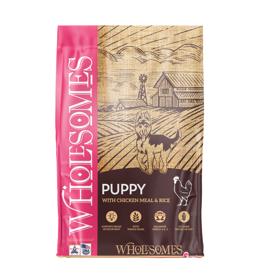 Shop / Products / Wholesomes Puppy Chicken Meal & Rice Recipe For Puppies Wholesomes Puppy Chicken Meal & Rice Recipe For Puppies Wholesomes 16.5 lb $24.99 16.5 lb Purchase Options Free In-Store Pick Up Not Available Save 20% on orders $100+ Set your store for inventory and store pickup details Zip Code Search Same-day Delivery* No minimum charge for delivery orders. *Order before 2pm and have it delivered today. Orders placed after 2pm will be delivered the next day. Must be inside delivery radius. Zip Code Unfortunately delivery is not available to this address. In order to ensure the best availability accuracy, changing your selected store will remove all items from your cart. You will need to re-add these items with your newly selected store if you choose to continue. Continue Cancel Ship it to Me Quantity Add To Cart Feeding guide disclaimer ✕ Feeding guides provide a starting point for the amount of food to give your pet each day. We recommend that you keep your pet in ideal body condition and not allow them to become overweight. The amount of food your pet needs can vary based on age, activity level or other food and treats given, so be sure to work with your veterinarian to determine an appropriate weight for your pet, and to make any necessary adjustments to their feeding. Information Wholesomes Puppy Chicken Meal & Rice recipe is formulated for your puppy’s first year. Puppies need twice the amount of nutrients as an adult dog. This nutritious recipe provides extra calories for energy & growth, & high protein to build muscles, organs & strong bones. Wholesomes is made without high-moisture protein sources like corn, wheat or soybeans. Balanced Omega-6 & Omega-3 fatty acids promote healthy skin & coat. Fibers from vegetables and fruits such as apples, blueberries, cranberries, carrots and spinach help support good digestion. Wholesomes supplies your puppy with a 100% complete & balanced diet for a healthy active life. Ingredients Chicken Meal, Brown Rice, Peas, Chicken Fat (Preserved with Mixed Tocopherols), Whitefish Meal, Beet Pulp, Flaxseed, Apples, Blueberries, Carrots, Cranberries, Spinach, Salt, Potassium Chloride, Choline Chloride, Vitamin E Supplement, Niacin, Calcium Pantothenate, Vitamin A Supplement, Riboflavin Supplement, Thiamine Mononitrate, Pyridoxine Hydrochloride, Biotin, Vitamin B12 Supplement, Vitamin D3 Supplement, Folic Acid, Zinc Sulfate, Ferrous Sulfate, Copper Sulfate, Manganese Sulfate, Zinc Proteinate, Copper Proteinate, Manganese Proteinate, Sodium Selenite, Calcium Iodate, Cobalt Carbonate, Rosemary Extract. Guaranteed Analysis Nutrient AnalysisCrude Protein minimum 30.0%Crude Fat minimum 20.0%Crude Fiber maximum 4.0%Moisture maximum 10.0%Docosahexaenoic Acid (DHA) minimum 0.05%Vitamin E minimum 100 IU/kgOmega-6 Fatty Acids minimum 3.0%*Omega-3 Fatty Acids minimum 0.40%**Not recognized as an essential ingredient by the AAFCO Dog Food Nutrient Profiles. Calorie Content: (M.E. Calc.) 3,810 kcal/kg, 390 kcal/cup. Customers also liked Customer Reviews