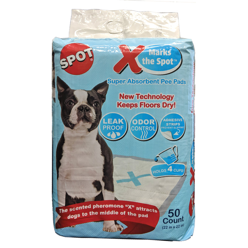 Shop / Best Sellers in stock / Ethical Products SPOT X Marks The Spot Puppy Pads 50 Pack 22"X22" Ethical Products SPOT X Marks The Spot Puppy Pads 50 Pack 22"X22" Ethical Pet Default Title $22.39 Default Title Purchase Options Free In-Store Pick Up Not Available Save 10% on orders $49+ Set your store for inventory and store pickup details Zip Code Search Same-day Delivery* No minimum charge for delivery orders. *Order before 2pm and have it delivered today. Orders placed after 2pm will be delivered the next day. Must be inside delivery radius. Zip Code Unfortunately delivery is not available to this address. In order to ensure the best availability accuracy, changing your selected store will remove all items from your cart. You will need to re-add these items with your newly selected store if you choose to continue. Continue Cancel Ship it to Me Quantity Add To Cart Information X Marks the Spot Suber Absorbent Pee pads have a scented pheromone X that attracts dogs to the middle of the pad. Adhesive strips on each corner pervents slipping an allows you to position the pads at a 90 degree for male dogs to protect both walls and floors. Five layers of absorbency holds up to 4 cups with a leak-proof inner. Customers also liked Customer Reviews
