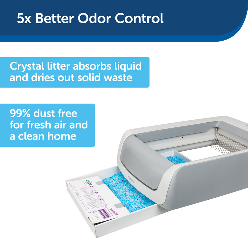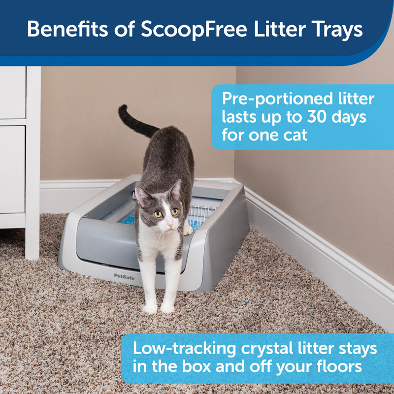 Shop / Best Sellers in stock / PetSafe ScoopFree Replacement Blue Crystal Litter Tray, 3-Pack – Easy Cleanup with Disposable Tray – Includes Leak Protection and Low Tracking Litter – Absorbs Odors on Contact PetSafe ScoopFree Replacement Blue Crystal Litter Tray, 3-Pack – Easy Cleanup with Disposable Tray – Includes Leak Protection and Low Tracking Litter – Absorbs Odors on Contact PetSafe Default Title $73.99 Default Title Purchase Options Free In-Store Pick Up Not Available Save 10% on orders $49+ Set your store for inventory and store pickup details Zip Code Search Same-day Delivery* No minimum charge for delivery orders. *Order before 2pm and have it delivered today. Orders placed after 2pm will be delivered the next day. Must be inside delivery radius. Zip Code Unfortunately delivery is not available to this address. In order to ensure the best availability accuracy, changing your selected store will remove all items from your cart. You will need to re-add these items with your newly selected store if you choose to continue. Continue Cancel Ship it to Me Quantity Add To Cart Information Each ScoopFree® Disposable Crystal Litter Tray is pre-filled with premium blue crystal cat litter, so all you have to do is load the tray in the litter box with no scooping, cleaning or refilling for weeks! Crystal litter absorbs urine and dries solid waste to quickly remove odors 5 times faster than clumping clay litter. Low-tracking crystals don’t stick to your cat’s feet and are 99% dust-free—designed for all the days you don’t want to sweep the floor (again). And the plastic tray lining creates a powerful extra barrier to protect your floors against leaks. When it’s time to clean up, just remove the disposable litter tray and throw it away. It doesn’t get much easier than that! Your pet deserves the best. Trust PetSafe® to help keep your pet healthy, safe and happy. Customers also liked Customer Reviews