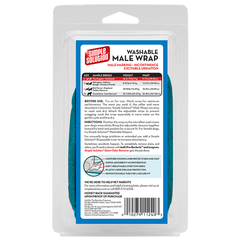 Shop / Best Sellers in stock / Simple Solution Washable Male Wrap Size Small Simple Solution Washable Male Wrap Size Small Simple Solution Small $12.99 Small Purchase Options Free In-Store Pick Up Not Available Save 10% on orders $49+ Set your store for inventory and store pickup details Zip Code Search Same-day Delivery* No minimum charge for delivery orders. *Order before 2pm and have it delivered today. Orders placed after 2pm will be delivered the next day. Must be inside delivery radius. Zip Code Unfortunately delivery is not available to this address. In order to ensure the best availability accuracy, changing your selected store will remove all items from your cart. You will need to re-add these items with your newly selected store if you choose to continue. Continue Cancel Ship it to Me Quantity Add To Cart Information It can be difficult managing a pet with urinary incontinence. Simple Solution Washable Male Wraps will protect your home from pee and restore peace of mind for you and your male dog. The super absorbent microfiber pad at the core of these diapers trap in moisture, while the stretchy waistband, and repositionable fasteners provide a secure fit for the wiggliest of dogs. Customers also liked Customer Reviews