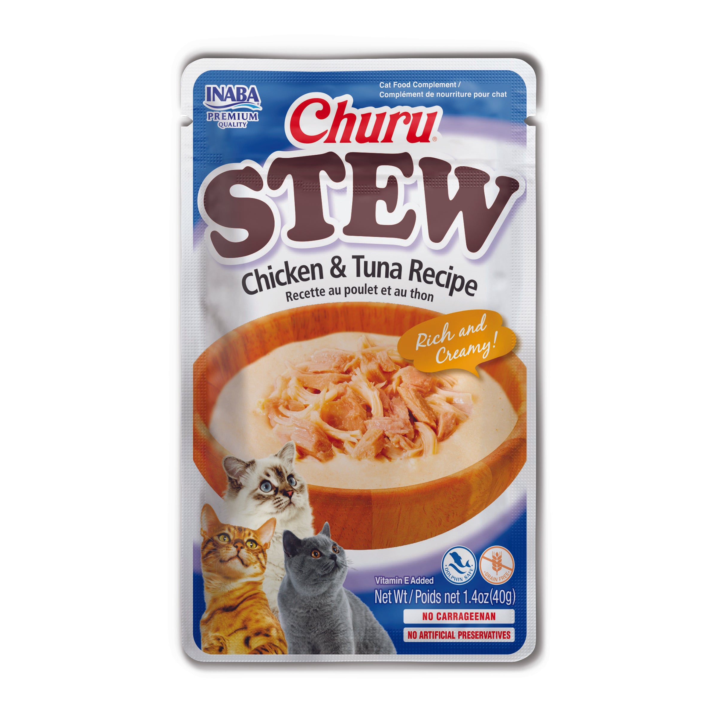 Shop / Buy Online Pickup In Store / Inaba Churu Chicken and Tuna Stew Lickable Cat Treat Inaba Churu Chicken and Tuna Stew Lickable Cat Treat Inaba 1.4oz $1.50 $1.89 1.4oz Purchase Options Free In-Store Pick Up Not Available Save 20% on orders $100+ Set your store for inventory and store pickup details Zip Code Search Same-day Delivery* No minimum charge for delivery orders. *Order before 2pm and have it delivered today. Orders placed after 2pm will be delivered the next day. Must be inside delivery radius. Zip Code Unfortunately delivery is not available to this address. In order to ensure the best availability accuracy, changing your selected store will remove all items from your cart. You will need to re-add these items with your newly selected store if you choose to continue. Continue Cancel Ship it to Me Quantity Add To Cart Feeding guide disclaimer ✕ Feeding guides provide a starting point for the amount of food to give your pet each day. We recommend that you keep your pet in ideal body condition and not allow them to become overweight. The amount of food your pet needs can vary based on age, activity level or other food and treats given, so be sure to work with your veterinarian to determine an appropriate weight for your pet, and to make any necessary adjustments to their feeding. Information Churu Stew is a rich and creamy purée like original Churu lickable cat treats, but with a thicker consistency and shreds of farm-raised chicken that’s perfect to serve as a side dish. Each pouch has 86% moisture and only 18.8 calories, so you can feel good about adding this luscious treat to your cat’s bowl of bland kibble. These convenient individual pouches make a purr-fect side-dish or complement to your furbaby’s meal. Ingredients: Tuna Broth, Chicken, Tuna, Tapioca Starch, Natural Flavors, Guar Gum, Agar-Agar, Vitamin E Supplement. Guaranteed Analysis: Crude Protein (min) 7.00% Crude Fat (min) 0.20% Crude Fiber (max) 0.30% Moisture (max) 91.00% Vitamin E (min) 50 IU/kg Customers also liked Customer Reviews