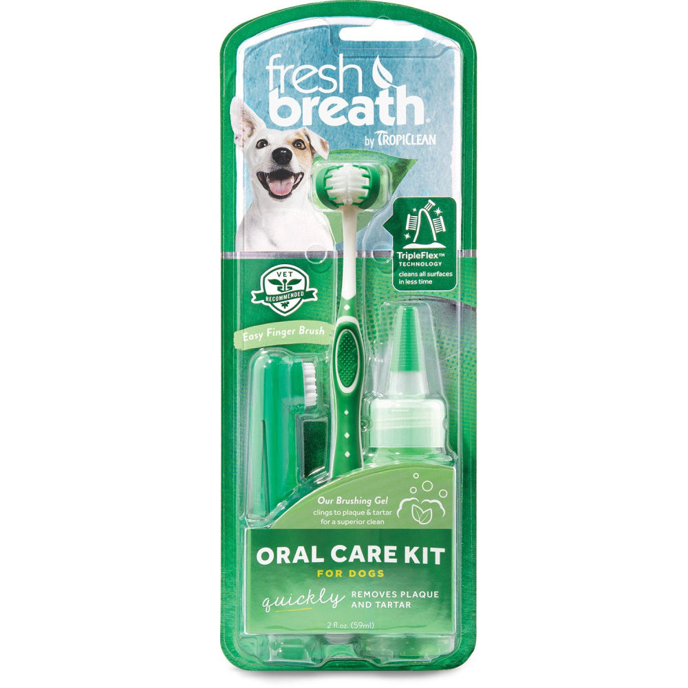 Shop / Buy Online Pickup In Store / Tropiclean Fresh Breath Oral Care Kit for Dogs Tropiclean Fresh Breath Oral Care Kit for Dogs TropiClean Small Save 20% on Tropiclean Dental Discount will apply in cart $15.99 Small Purchase Options Free In-Store Pick Up Not Available Save 10% on orders $49+ Set your store for inventory and store pickup details Zip Code Search Same-day Delivery* No minimum charge for delivery orders. *Order before 2pm and have it delivered today. Orders placed after 2pm will be delivered the next day. Must be inside delivery radius. Zip Code Unfortunately delivery is not available to this address. In order to ensure the best availability accuracy, changing your selected store will remove all items from your cart. You will need to re-add these items with your newly selected store if you choose to continue. Continue Cancel Ship it to Me Quantity Add To Cart Information FRESH BREATH ORAL CARE KITS for a thorough clean Superior clean for the traditionalist. Our Fresh Breath line is built on the concept of making pet dental easier by removing the toothbrush. We congratulate those of you who have “braved the jaws” and incorporated brushing into your pet care routine. Using a toothbrush will only speed up the plaque and tartar removal process. That is why we created the Oral Care Kit for our friends, who we like to call “Traditionalists.” Our kit includes specially formulated mint gel, QuickFinger brush and TripleFlex toothbrush. These cutting edge tools help remove plaque and tartar and freshen your pets’ breath, cleaning all surfaces in less time. Ingredients Purified Water, Natural Derived Alcohol, Natural Mint, Glycerin, Natural Cleanser, Carbopol, Chlorophyllin, Green Tea Leaf Extract. Customers also liked Customer Reviews