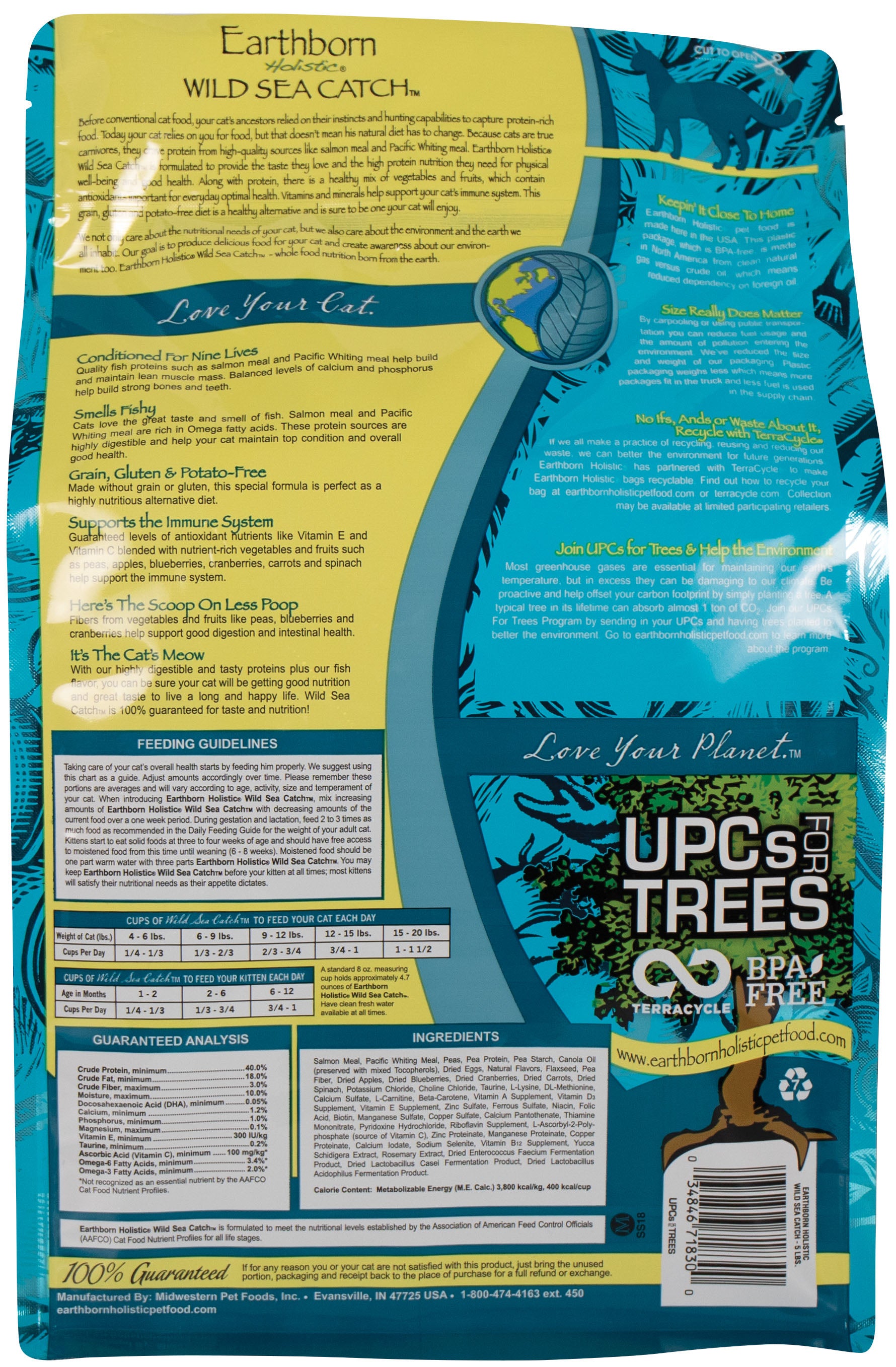 Shop / CAT FOOD / Earthborn Holistic Wild Sea Catch Grain-Free Dry Cat Food 5 lb Earthborn Holistic Wild Sea Catch Grain-Free Dry Cat Food 5 lb Earthborn Holistic 5lb $18.99 5lb Purchase Options Free In-Store Pick Up Not Available Save 20% on orders $100+ Set your store for inventory and store pickup details Zip Code Search Same-day Delivery* No minimum charge for delivery orders. *Order before 2pm and have it delivered today. Orders placed after 2pm will be delivered the next day. Must be inside delivery radius. Zip Code Unfortunately delivery is not available to this address. In order to ensure the best availability accuracy, changing your selected store will remove all items from your cart. You will need to re-add these items with your newly selected store if you choose to continue. Continue Cancel Ship it to Me Quantity Add To Cart Feeding guide disclaimer ✕ Feeding guides provide a starting point for the amount of food to give your pet each day. We recommend that you keep your pet in ideal body condition and not allow them to become overweight. The amount of food your pet needs can vary based on age, activity level or other food and treats given, so be sure to work with your veterinarian to determine an appropriate weight for your pet, and to make any necessary adjustments to their feeding. Information Wild Sea Catch is made without grain or gluten, making it a perfect grain-free alternative diet. With tasty, highly digestible proteins like salmon meal and Pacific Whiting meal, your cat is sure to enjoy the natural aroma and fish flavor. Along with protein, Wild Sea Catch offers overall health benefits from balanced levels of calcium and phosphorus, essential antioxidants like Vitamin E and Vitamin C and wholesome, nutrient-rich fruits and veggies. Ingredients Ingredients: Salmon Meal, Pacific Whiting Meal, Peas, Pea Protein, Pea Starch, Canola Oil (preserved with mixed Tocopherols), Dried Eggs, Natural Flavors, Flaxseed, Pea Fiber, Dried Apples, Dried Blueberries, Dried Cranberries, Dried Carrots, Dried Spinach, Potassium Chloride, Choline Chloride, Taurine, L-Lysine, DL-Methionine, Calcium Sulfate, L-Carnitine, Beta-Carotene, Vitamin A Supplement, Vitamin D3 Supplement, Vitamin E Supplement, Zinc Sulfate, Ferrous Sulfate, Niacin, Folic Acid, Biotin, Manganese Sulfate, Copper Sulfate, Calcium Pantothenate, Thiamine Mononitrate, Pyridoxine Hydrochloride, Riboflavin Supplement, L-Ascorbyl-2-Polyphosphate (Source of Vitamin C), Zinc Proteinate, Manganese Proteinate, Copper Proteinate, Calcium Iodate, Sodium Selenite, Vitamin B12 Supplement, Yucca Schidigera Extract, Rosemary Extract, Dried Enterococcus Faecium Fermentation Product, Dried Lactobacillus Casei Fermentation Product, Dried Lactobacillus Acidophilus Fermentation Product. Guaranteed Analysis Guaranteed Analysis: Crude Protein (min) 40%, Crude Fat (min) 18%, Crude Fiber (max) 3%, Moisture 10%, Docosahexaenoic Acid (DHA) (min) 0.05%, Calcium (min) 1.2%, Phosphorus (min) 1.0%, Magnesium (max) 0.10%, Vitamin E (min.) 300 IU/kg, Taurine (min) 0.20%, Ascorbic Acid (Vitamin C) (min) 100 mg/kg, Omega-6 Fatty Acids (min) 3.4%, Omega-3 Fatty Acids (min) 2.00% Customers also liked Customer Reviews
