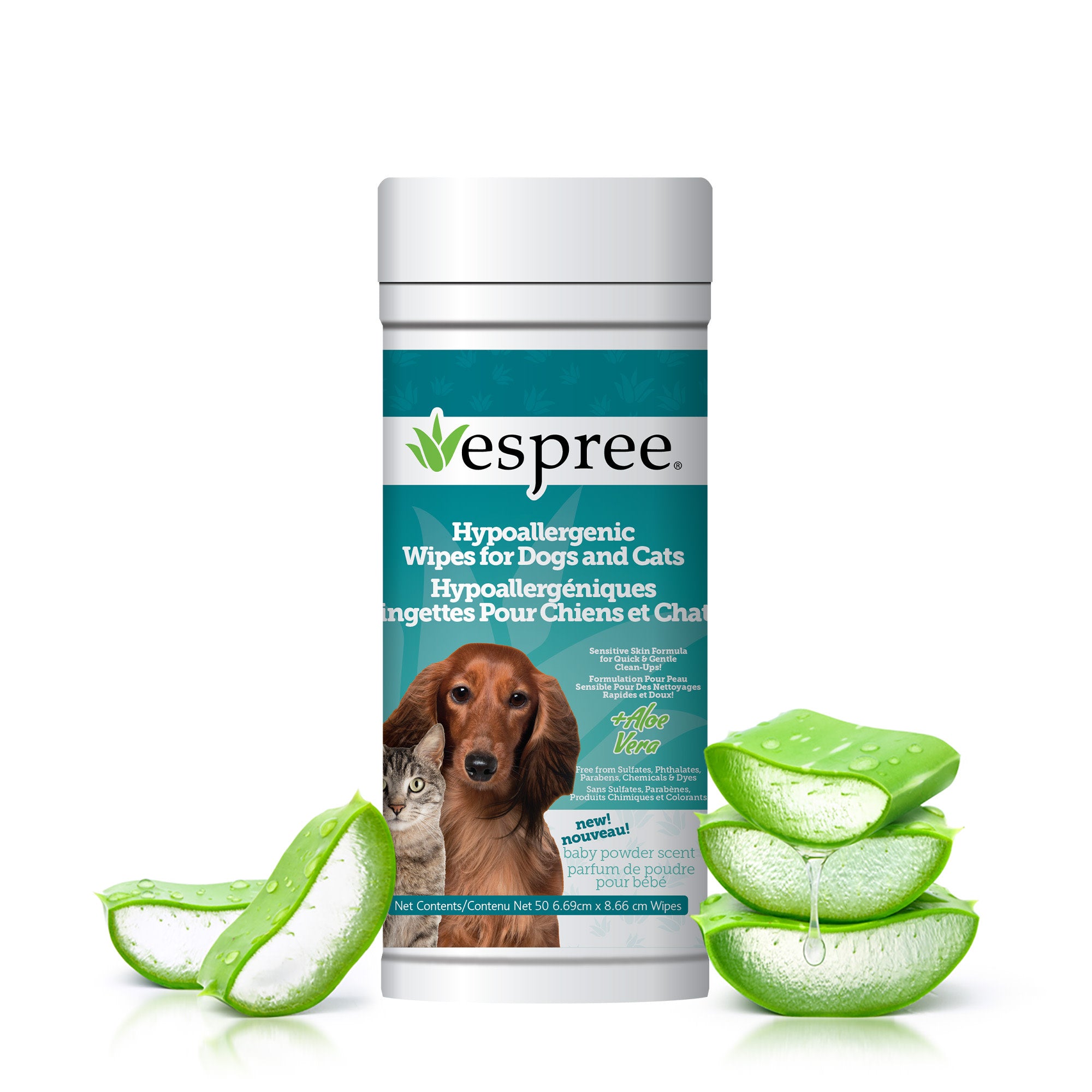 Shop / CAT / Espree Dog & Cat Hypoallergenic Aloe Wipes, 50ct Espree Dog & Cat Hypoallergenic Aloe Wipes, 50ct Espree 50ct $10.99 50ct Purchase Options Free In-Store Pick Up Not Available Save 20% on orders $100+ Set your store for inventory and store pickup details Zip Code Search Same-day Delivery* No minimum charge for delivery orders. *Order before 2pm and have it delivered today. Orders placed after 2pm will be delivered the next day. Must be inside delivery radius. Zip Code Unfortunately delivery is not available to this address. In order to ensure the best availability accuracy, changing your selected store will remove all items from your cart. You will need to re-add these items with your newly selected store if you choose to continue. Continue Cancel Ship it to Me Quantity Add To Cart Information Espree Dog & Cat Hypoallergenic Aloe Wipes are specially designed to offer a gentle, refreshing clean for your pet’s sensitive skin. Infused with soothing aloe and globally sourced ingredients, these high-quality, pre-moistened wipes help remove dirt, dander, and odors while leaving your pet’s coat soft, fluffy, and touchably fresh. Perfect for daily touch-ups or between baths, Espree Aloe Wipes are hypoallergenic, free from harsh chemicals, fragrances, and dyes, making them ideal for pets with allergies or sensitive skin. The convenient, easy-to-use wipes simplify dog and cat grooming, allowing you to quickly clean paws, face, and coat wherever you are. Ideal as cat cleaning wipes or dog grooming wipes, they help maintain a healthy, shiny coat. Please note that some pets may be sensitive to any formula, so we recommend trying this on a small area initially. Trusted by professional groomers, Espree’s hypoallergenic wipes provide a reliable, gentle solution to keep your pet clean, comfortable, and beautifully maintained without irritation. FEATURES: -HIGH-QUALITY WIPES: Crafted from premium, durable materials, our aloe pet wipes offer a gentle, effective clean without tearing or fraying; Infused with soothing aloe, each wipe ensures your pet’s skin and coat are gently refreshed and well-cared for. -EASY TO USE WIPE: These convenient, pre-moistened wipes make cleanup quick and hassle-free; Simply pull, wipe, and toss for a fast and effective way to keep your pet’s paws, face, and coat fresh between baths—made for on-the-go grooming and everyday use. -SENSITIVE SKIN: Designed with sensitive skin in mind, our wipes are free from harsh chemicals, fragrances, and dyes; Our hypoallergenic formula is safe for pets with allergies and skin sensitivities, helping reduce irritation and keeping skin calm. -FRESH & SOFT COAT: Infused with natural jojoba, our wipes leave your dog and cat's coats feeling soft, fluffy, and refreshed after each use; Perfect for in-between baths, these gentle wipes ensure a clean, touchable coat without stripping natural oils. -TRUSTED FOR 40 YEARS: Espree was created in 1989 in partnership with grooming professionals to provide pet care that is as gentle and safe as Mother Nature intended. INGREDIENTS: Purified Water, Aloe Vera Juice, Humectants, Emulsifier, Coconut Derived Cleanser, Oat Protein, Preservatives, Pro-Vitamin B5, Odor Neutralizer, EDTA, Fragrance, Citric Acid. Customers also liked Customer Reviews