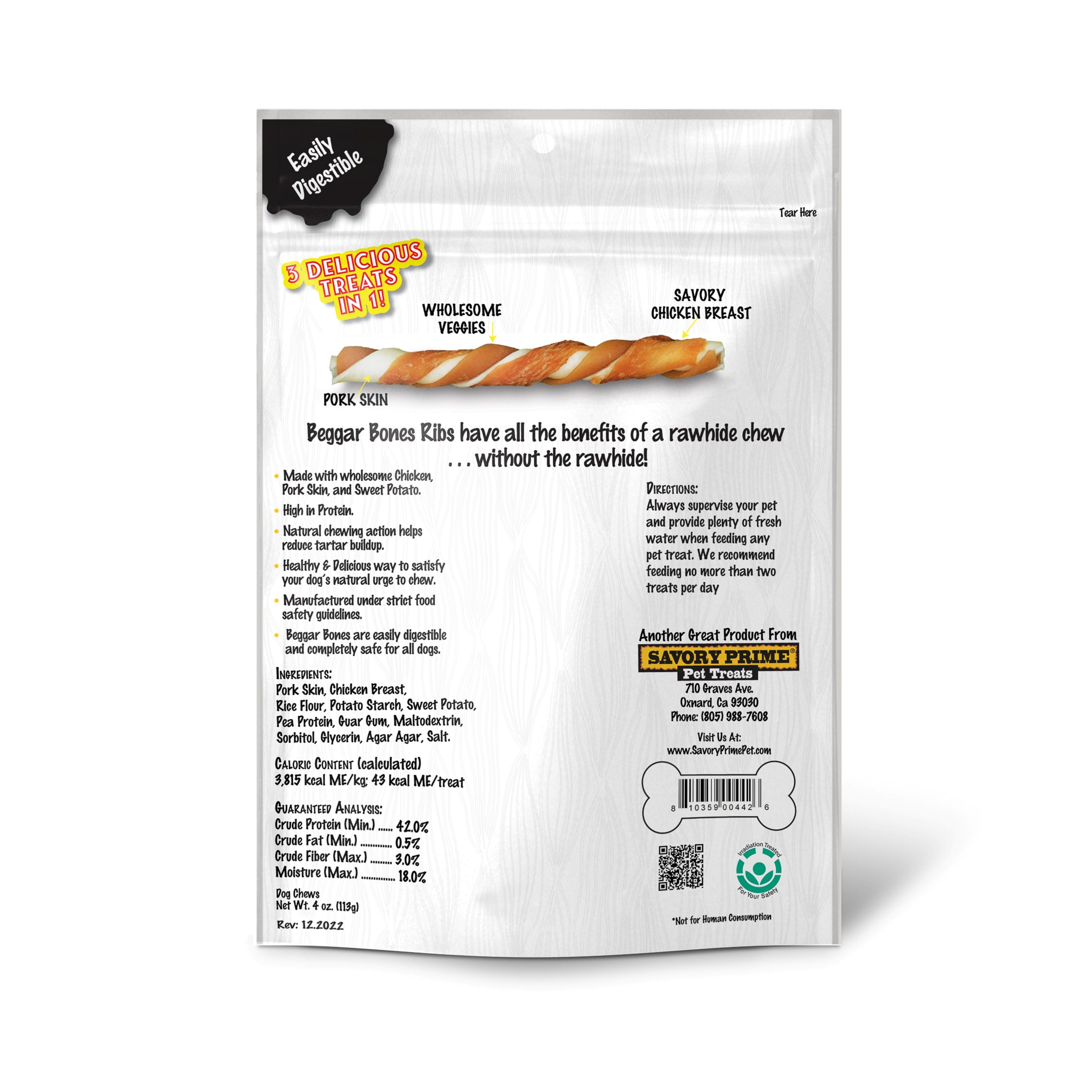 Shop / Celebrate Your Pet / Savory Prime Beggar Bones 3 in 1 Flavor Twist Stick Savory Prime Beggar Bones 3 in 1 Flavor Twist Stick Savory Prime Pet Treats $6.99 10ct 20ct 10ct 20ct Purchase Options Free In-Store Pick Up Not Available Save 10% on orders $49+ Set your store for inventory and store pickup details Zip Code Search Same-day Delivery* No minimum charge for delivery orders. *Order before 2pm and have it delivered today. Orders placed after 2pm will be delivered the next day. Must be inside delivery radius. Zip Code Unfortunately delivery is not available to this address. In order to ensure the best availability accuracy, changing your selected store will remove all items from your cart. You will need to re-add these items with your newly selected store if you choose to continue. Continue Cancel Ship it to Me Quantity Add To Cart Feeding guide disclaimer ✕ Feeding guides provide a starting point for the amount of food to give your pet each day. We recommend that you keep your pet in ideal body condition and not allow them to become overweight. The amount of food your pet needs can vary based on age, activity level or other food and treats given, so be sure to work with your veterinarian to determine an appropriate weight for your pet, and to make any necessary adjustments to their feeding. Information Support your dog's natural urge to chew with Beggar Bones Twist Sticks. Beggar Bones have all the benefits of a rawhide chew…without the rawhide! Beggar Bones are 99% digestible and completely safe for all dogs. We use use wholesome chicken, pork skin and sweet potato in our Beggar Bones Twist Sticks so your dog will love the great taste! Ingredients: Pork Skin, Chicken Breast, Rice Flour, Potato Starch, Sweet Potato, Pea Protein, Guar Gum, Maltodextrin, Sorbitol, Glycerin, Agar-Agar, Salt. Guaranteed Analysis: Crude Protein (min): 42.0% Crude Fat (min): 0.5% Crude Fiber (max): 3.0% Moisture (max): 18.0% Customers also liked Customer Reviews