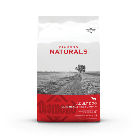 Shop / Diamond / Diamond Naturals Adult Dry Dog Food Lamb Meal & Rice Formula Diamond Naturals Adult Dry Dog Food Lamb Meal & Rice Formula Diamond 6lb $18.99 6lb Purchase Options Free In-Store Pick Up Not Available Save 10% on orders $49+ Set your store for inventory and store pickup details Zip Code Search Same-day Delivery* No minimum charge for delivery orders. *Order before 2pm and have it delivered today. Orders placed after 2pm will be delivered the next day. Must be inside delivery radius. Zip Code Unfortunately delivery is not available to this address. In order to ensure the best availability accuracy, changing your selected store will remove all items from your cart. You will need to re-add these items with your newly selected store if you choose to continue. Continue Cancel Ship it to Me Quantity Add To Cart Feeding guide disclaimer ✕ Feeding guides provide a starting point for the amount of food to give your pet each day. We recommend that you keep your pet in ideal body condition and not allow them to become overweight. The amount of food your pet needs can vary based on age, activity level or other food and treats given, so be sure to work with your veterinarian to determine an appropriate weight for your pet, and to make any necessary adjustments to their feeding. Information Lamb protein and moderate levels of fat help support a healthy body condition while providing the nutrients your dog needs to stay active day after day. Guaranteed levels of zinc, selenium and vitamin E ensure that your dog receives proper antioxidant nutrition, while omega-6 and omega-3 fatty acids from superfoods help maintain healthy skin and a shiny coat. Ingredients Lamb meal, ground white rice, cracked pearled barley, grain sorghum, egg product, dried yeast, rice bran, chicken fat (preserved with mixed tocopherols), oatmeal, dried beet pulp, natural flavor, flaxseed, potassium chloride, salt, DL-Methionine, choline chloride, taurine, dried chicory root, kale, chia seed, pumpkin, blueberries, oranges, quinoa, dried kelp, coconut, spinach, carrots, papaya, yucca schidigera extract, L-Carnitine, dried Lactobacillus plantarum fermentation product, dried Bacillus subtilis fermentation product, dried Lactobacillus acidophilus fermentation product, dried Enterococcus faecium fermentation product, dried Bifidobacterium animalis fermentation product, vitamin E supplement, beta carotene, iron proteinate, zinc proteinate, copper proteinate, ferrous sulfate, zinc sulfate, manganese sulfate, copper sulfate, potassium iodide, thiamine mononitrate, manganese proteinate, ascorbic acid, vitamin A supplement, biotin, niacin, calcium pantothenate, sodium selenite, pyridoxine hydrochloride, vitamin B12 supplement, riboflavin, vitamin D3 supplement, folic acid.Contains a source of live (viable), naturally occurring microorganisms.The facility in which this food is made also makes food that may contain other ingredients. Guaranteed Analysis Crude Protein 23.0% MinimumCrude Fat 14.0% MinimumCrude Fiber 4.0% MaximumMoisture 10.0% MaximumZinc 150 mg/kg MinimumSelenium 0.35 mg/kg MinimumVitamin A 10,000 IU/kg MinimumVitamin E 150 IU/kg MinimumTaurine* 0.12% MinimumL-Carnitine* 100 mg/kg MinimumOmega-6 Fatty Acids* 2.2% MinimumOmega-3 Fatty Acids* 0.4% MinimumTotal Microorganisms* Not Less Than 80,000,000 CFU/lb(Lactobacillus plantarum, Bacillus subtilis, Lactobacillus acidophilus, Enterococcus faecium, Bifidobacterium animalis) *Not recognized as an essential nutrient by the AAFCO Dog Food Nutrient Profiles." Customers also liked Customer Reviews