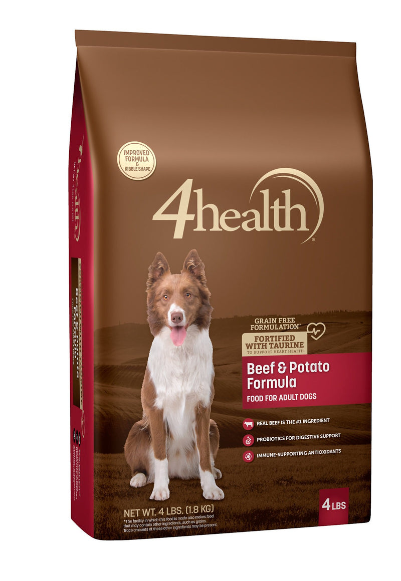 Shop / DOG FOOD / 4health Grain Free Beef & Potato Dry Dog Food 4health Grain Free Beef & Potato Dry Dog Food 4health $14.99 4 lb 30 lb 4-lb 30-lb Purchase Options Free In-Store Pick Up Not Available Save 10% on orders $49+ Set your store for inventory and store pickup details Zip Code Search Same-day Delivery* No minimum charge for delivery orders. *Order before 2pm and have it delivered today. Orders placed after 2pm will be delivered the next day. Must be inside delivery radius. Zip Code Unfortunately delivery is not available to this address. In order to ensure the best availability accuracy, changing your selected store will remove all items from your cart. You will need to re-add these items with your newly selected store if you choose to continue. Continue Cancel Ship it to Me Quantity Add To Cart Feeding guide disclaimer ✕ Feeding guides provide a starting point for the amount of food to give your pet each day. We recommend that you keep your pet in ideal body condition and not allow them to become overweight. The amount of food your pet needs can vary based on age, activity level or other food and treats given, so be sure to work with your veterinarian to determine an appropriate weight for your pet, and to make any necessary adjustments to their feeding. Information Zero Additives + Zero Fillers = Genuine LoveMeal time is family time and your pet knows when they're missing out. So does their body. That's why 4health has created this wholesome and delicious grain-free recipe to meet all of your pet's nutritional needs.Made with Real Beef & PotatoYou wouldn't eat chemically enhanced food, so why should your dog? This formula uses real beef to offer full nutrition and a taste your dog will cherish. Beef, a high-quality source of protein, nourishes dogs by helping build, heal and maintain body tissues, and by protecting the immune system. This formula also has potato to ensure a balanced diet.TaurineTaurine-fortified to help support a healthy heartWe Love Your Dog Too (and we know just what their body needs)Who better to make food for pets than farmers? At Tractor Supply Company, we bring our deep passion for land and animals to the forefront of our products and services. By sourcing the best local produce, utilizing superior water purification processes and thoroughly testing our formulas, we guarantee excellent quality food for your pets.Species Specific ProbioticsEach bag of 4health dog food formula provides species specific probiotics to specifically aid digestion and modulate the immune system of canines.No Corn No Wheat No SoyAll 4health wet & dry formulas have minimal ingredients that may cause allergic reactions and upset stomachs in pets. By removing corn, wheat and soy from their pet's diet, owners that choose 4health notice an improvement in their pet's coat, stool consistency, teeth, weight, and overall health.About This Formula4health Grain-Free Beef & Potato Formula Dog Food is a premium quality dry dog food, developed specifically to meet the nutritional needs of dogs that have grain restrictions in their diet. Using real beef as the main ingredient, this recipe offers a high-quality source of protein that aids the body to heal tissue, grow hair and maintain a smooth skin and coat. Customers also liked Customer Reviews
