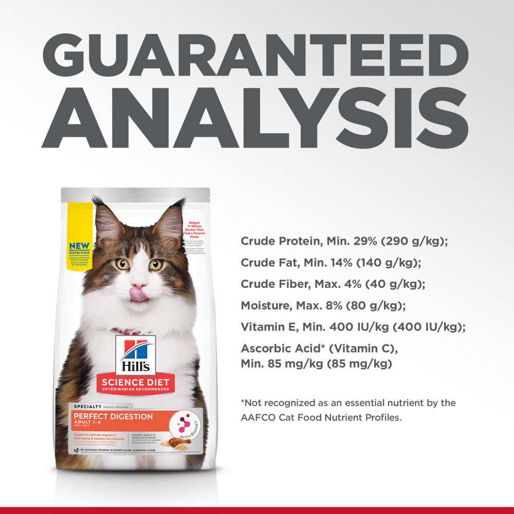 Shop / DOG FOOD / Hill's Science Diet Adult Perfect Digestion Chicken, Barley, & Whole Oats Recipe Dry Cat Food Hill's Science Diet Adult Perfect Digestion Chicken, Barley, & Whole Oats Recipe Dry Cat Food Hill's Science Diet $24.99 3.5 lb 6 lb 13 lb 3.5-lb 6-lb 13-lb Purchase Options Free In-Store Pick Up Not Available Save 20% on orders $100+ Set your store for inventory and store pickup details Zip Code Search Same-day Delivery* No minimum charge for delivery orders. *Order before 2pm and have it delivered today. Orders placed after 2pm will be delivered the next day. Must be inside delivery radius. Zip Code Unfortunately delivery is not available to this address. In order to ensure the best availability accuracy, changing your selected store will remove all items from your cart. You will need to re-add these items with your newly selected store if you choose to continue. Continue Cancel Ship it to Me Quantity Add To Cart Feeding guide disclaimer ✕ Feeding guides provide a starting point for the amount of food to give your pet each day. We recommend that you keep your pet in ideal body condition and not allow them to become overweight. The amount of food your pet needs can vary based on age, activity level or other food and treats given, so be sure to work with your veterinarian to determine an appropriate weight for your pet, and to make any necessary adjustments to their feeding. Information Every cat has an entire ecosystem living within them — the gut microbiome, full of billions of desirable and undesirable bacteria unique to your pet. With the right nutrients to help balance their microbiome, you can actually affect not only their digestive health, but their overall well-being. That’s why we developed Science Diet Perfect Digestion dry cat food with our ActivBiome+ Technology ingredient blend of prebiotics. It’s a breakthrough nutrition that supports each cat’s unique gut microbiome for healthy digestion and balanced nutrition that helps your cat feel their best.Why We Love It Supports ultimate digestive well-being and a healthy microbiome Premium cat food that promotes regularity and healthy stools — perfect poop in 7 days Contains ActivBiome+ Technology, an exclusive blend of prebiotics, whole grain oats and pumpkin High quality chicken is the #1 ingredient Clinically proven antioxidants, Vitamin C & E, for a healthy immune system About Hill's Science DietWe believe quality care for pets includes optimal nutrition, veterinary health care, daily exercise and an enriching environment with lots of love. All pets at Hill's® Pet Nutrition live in such an environment. We only use compassionate, noninvasive methods necessary to develop nutritional technology so dogs and cats around the world live long, healthy lives. Our breakthroughs in pet nutrition are unmatched in the pet food industry, and we've built our business and reputation on always practicing the highest ethical standards. Every day we prove that quality scientific technology and compassionate animal care go hand-in-hand to improve pets' healthy lives. This is why Hill's only supports and exercises the responsible, caring and humane treatment of dogs and cats. Ingredients Chicken, Cracked Pearled Barley, Corn Gluten Meal, Chicken Fat, Whole Grain Oats, Whole Grain Corn, Chicken Meal, Egg Product, Chicken Liver flavour, Ground Pecan Shells, Lactic Acid, Calcium Sulfate, Potassium Chloride, Flaxseed, Dried Beet Pulp, Dried Citrus Pulp, L-Lysine, Soybean Oil, Iodized Salt, Choline Chloride, Pressed Cranberries, Taurine, Pumpkin, vitamins (Vitamin E Supplement, L-Ascorbyl-2-Polyphosphate (source of Vitamin C), Niacin Supplement, Thiamine Mononitrate, Vitamin A Supplement, Calcium Pantothenate, Riboflavin Supplement, Biotin, Vitamin B12 Supplement, Pyridoxine Hydrochloride, Folic Acid, Vitamin D3 Supplement), Fish Oil, Calcium Carbonate, DL-Methionine, minerals (Ferrous Sulfate, Zinc Oxide, Copper Sulfate, Manganous Oxide, Calcium Iodate, Sodium Selenite), Mixed Tocopherols for freshness, Natural flavours, Beta-Carotene. Guaranteed Analysis Nutrient Guaranteed Units Crude Protein 35 % Crude Fat 18 % Crude Fiber 2 % Carbohydrates 38.3 % Calcium 0.97 % Phosphorus 0.78 % Potassium 0.85 % Sodium 0.45 % Magnesium 0.088 % Taurine 0.3 % Vitamin C 118 ppm Vitamin E 485 IU/kg Omega-3 Fatty Acids 0.45 % Omega-6 Fatty Acids 3.92 % Customers also liked Customer Reviews