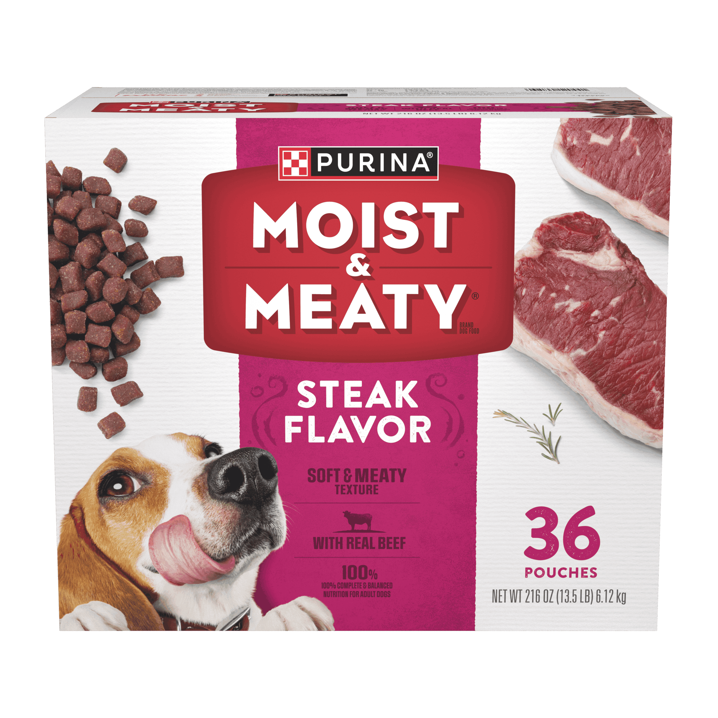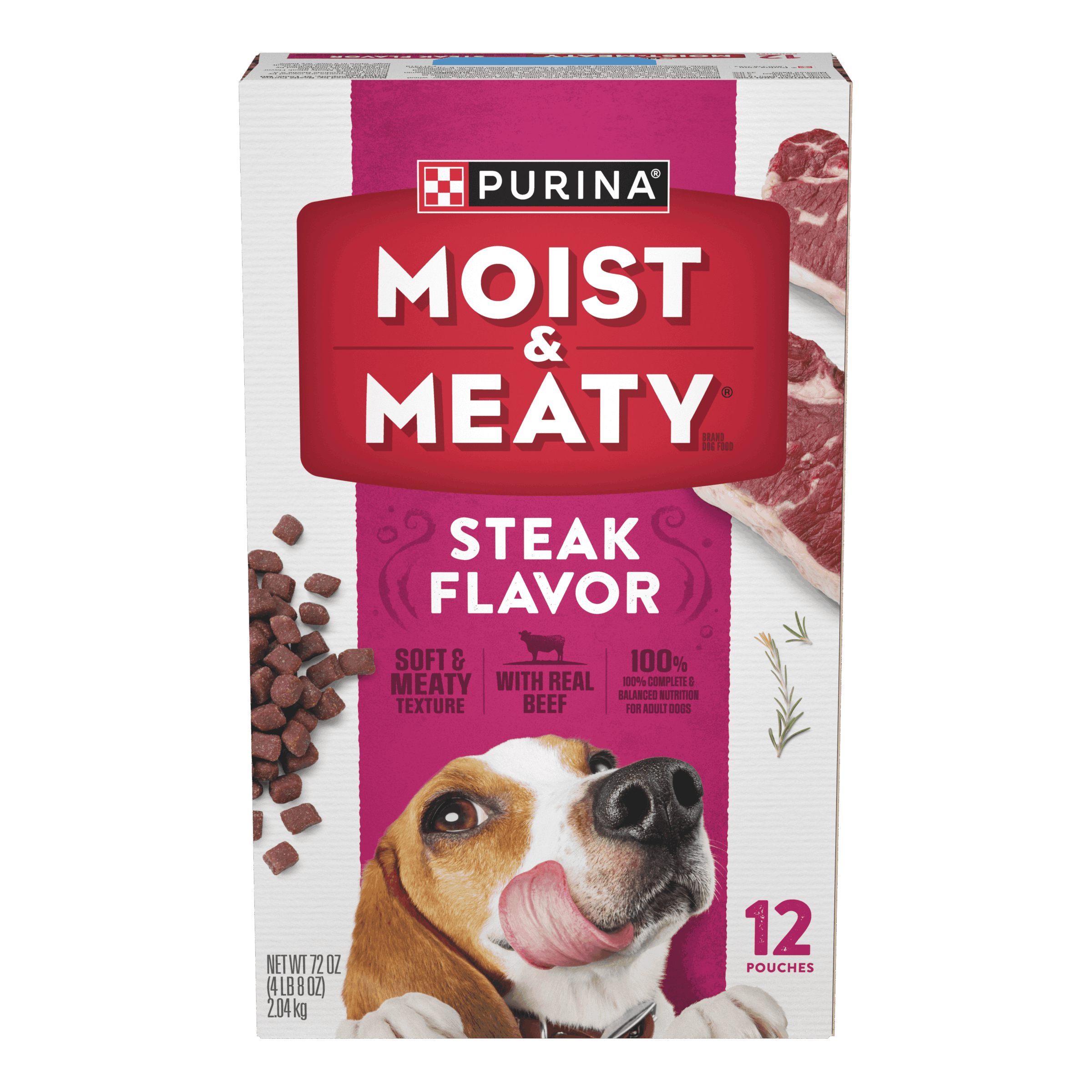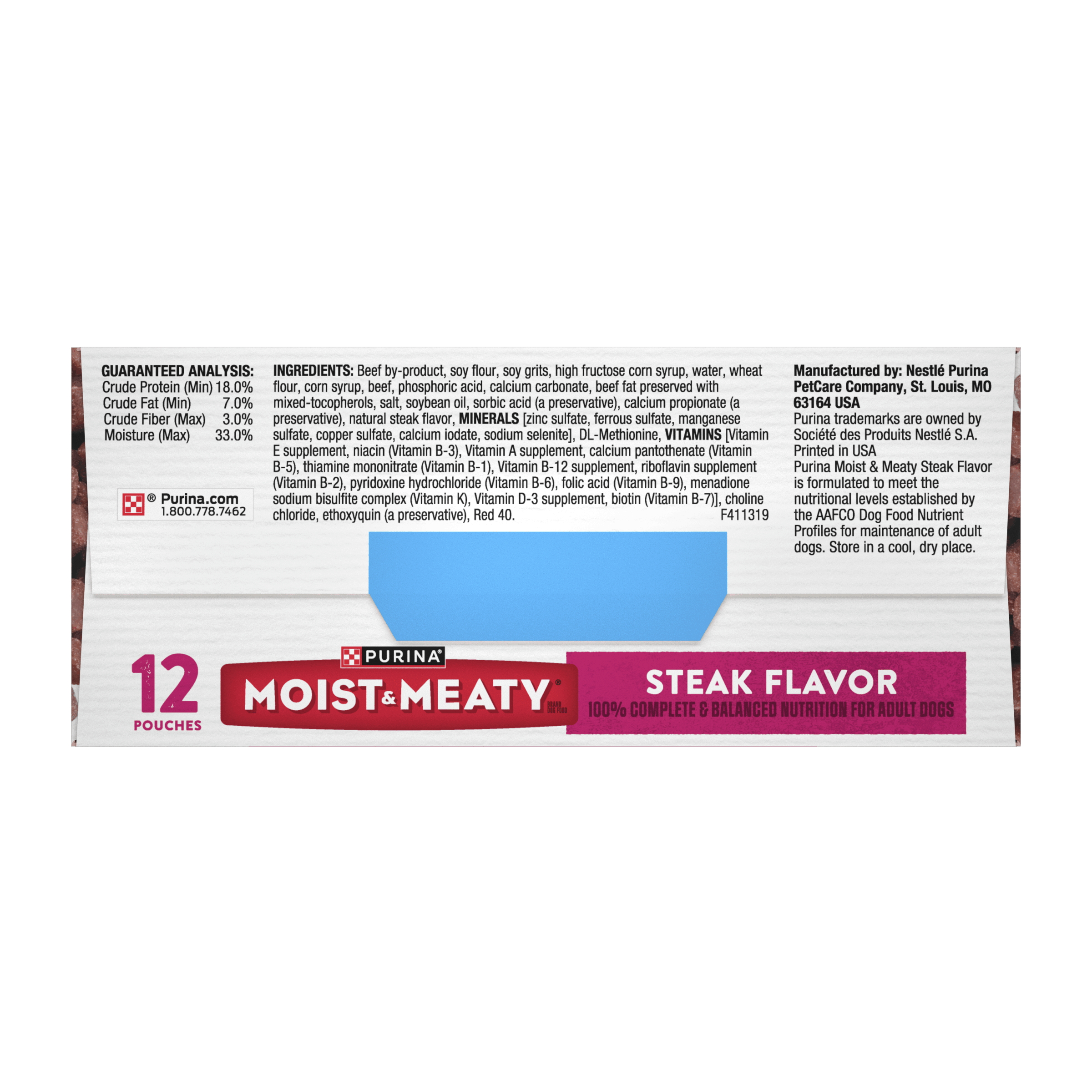 Shop / DOG FOOD / Purina Moist and Meaty Steak Flavor Soft Dog Food Pouches Purina Moist and Meaty Steak Flavor Soft Dog Food Pouches Purina Moist & Meaty $8.19 12ct 36ct 12ct 36ct Purchase Options Free In-Store Pick Up Not Available Save 20% on orders $100+ Set your store for inventory and store pickup details Zip Code Search Same-day Delivery* No minimum charge for delivery orders. *Order before 2pm and have it delivered today. Orders placed after 2pm will be delivered the next day. Must be inside delivery radius. Zip Code Unfortunately delivery is not available to this address. In order to ensure the best availability accuracy, changing your selected store will remove all items from your cart. You will need to re-add these items with your newly selected store if you choose to continue. Continue Cancel Ship it to Me Quantity Add To Cart Feeding guide disclaimer ✕ Feeding guides provide a starting point for the amount of food to give your pet each day. We recommend that you keep your pet in ideal body condition and not allow them to become overweight. The amount of food your pet needs can vary based on age, activity level or other food and treats given, so be sure to work with your veterinarian to determine an appropriate weight for your pet, and to make any necessary adjustments to their feeding. Information Serve up the smiles for your dog with Purina Moist and Meaty Steak Flavor adult dog food. The convenient individual Purina Moist and Meaty dog food pouches make it easy to fill their bowl with a 100 percent complete and balanced meal for adult dogs, offering the real meat dog food taste and soft texture dogs crave. Stay-fresh pouches keep every bite tender and full of mouthwatering beef dog food flavor. We make this semi moist dog food with real beef, with each serving supplying the high-quality protein he needs for strong muscles. Use these soft dry dog food pouches as single-serve meals, snacks, or dog meal toppers sprinkled over his wet or dry food to make his meals twice as exciting. Don’t keep your dog waiting; serve Purina Moist and Meaty Steak Flavor pouches. There’s no cleanup for you, and the delectable meaty bites made with real beef in our soft and moist dog food pouches might just convince him he’s ordering off the people menu. Ingredients Beef By-Product, Soy Flour, Soy Grits, High Fructose Corn Syrup, Water, Wheat Flour, Corn Syrup, Beef, Phosphoric Acid, Calcium Carbonate, Beef Fat Preserved With Mixed-Tocopherols, Salt, Soybean Oil, Sorbic Acid (A Preservative), Calcium Propionate (A Preservative), Natural Steak Flavor, Minerals [Zinc Sulfate, Ferrous Sulfate, Manganese Sulfate, Copper Sulfate, Calcium Iodate, Sodium Selenite], Dl-Methionine, Vitamins [Vitamin E Supplement, Niacin (Vitamin B-3), Vitamin A Supplement, Calcium Pantothenate (Vitamin B-5), Thiamine Mononitrate (Vitamin B-1), Vitamin B-12 Supplement, Riboflavin Supplement (Vitamin B-2), Pyridoxine Hydrochloride (Vitamin B-6), Folic Acid (Vitamin B-9), Menadione Sodium Bisulfite Complex (Vitamin K), Vitamin D-3 Supplement, Biotin (Vitamin B-7)], Choline Chloride, Ethoxyquin (A Preservative), Red 40. F411319 Guaranteed Analysis Crude Protein (Min)…18.0%, Crude Fat (Min)…7.0%, Crude Fiber (Max)…3.0%, Moisture (Max)…33.0%. Customers also liked Customer Reviews