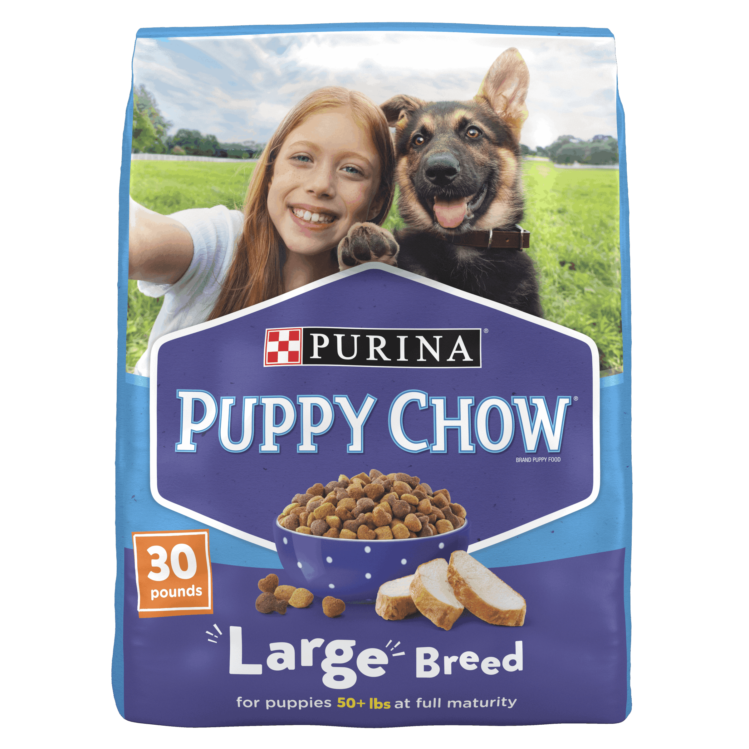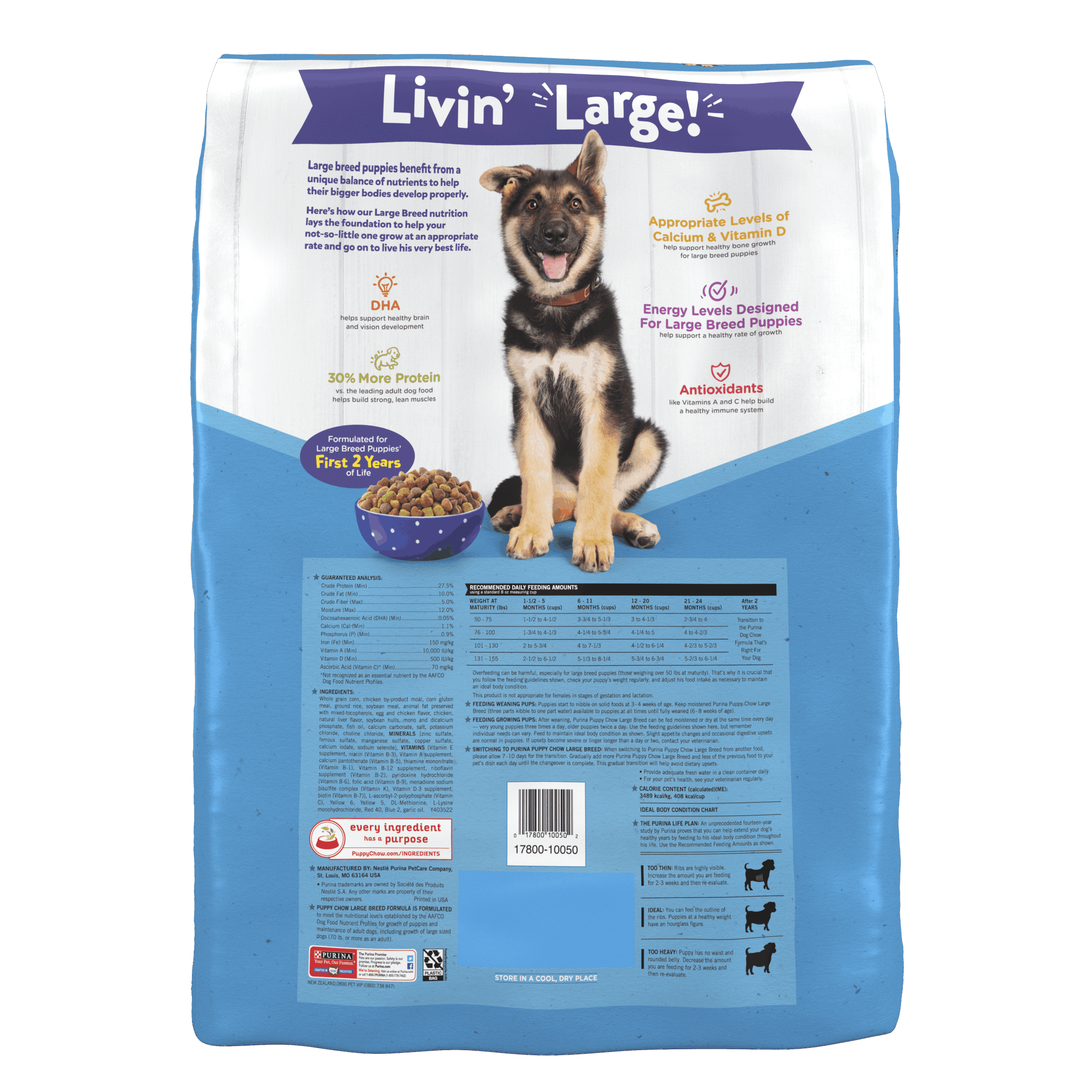Shop / DOG FOOD / Purina Puppy Chow High Protein Large Breed Puppy Food Dry With Real Chicken Purina Puppy Chow High Protein Large Breed Puppy Food Dry With Real Chicken Purina Puppy Chow 30lb $32.99 30lb Purchase Options Free In-Store Pick Up Not Available Save 20% on orders $100+ Set your store for inventory and store pickup details Zip Code Search Same-day Delivery* No minimum charge for delivery orders. *Order before 2pm and have it delivered today. Orders placed after 2pm will be delivered the next day. Must be inside delivery radius. Zip Code Unfortunately delivery is not available to this address. In order to ensure the best availability accuracy, changing your selected store will remove all items from your cart. You will need to re-add these items with your newly selected store if you choose to continue. Continue Cancel Ship it to Me Quantity Add To Cart Feeding guide disclaimer ✕ Feeding guides provide a starting point for the amount of food to give your pet each day. We recommend that you keep your pet in ideal body condition and not allow them to become overweight. The amount of food your pet needs can vary based on age, activity level or other food and treats given, so be sure to work with your veterinarian to determine an appropriate weight for your pet, and to make any necessary adjustments to their feeding. Information Give your puppy the nutrition he needs to grow into his big paws with Purina Puppy Chow Large Breed Formula dry dog kibble. Your adorable, playful puppy has unique nutritional needs during the first two years of his life, and this large breed dog food is formulated to meet those needs and to support him from the inside out. Each serving of crunchy high protein dog food comes packed with 30 percent more protein than the leading adult formula for his growing muscles, and it is carefully crafted to help support your puppy through those early years of development. With antioxidants like Vitamin C, 100 percent of essential nutrients, including DHA, and a Puppy Chow dog food taste puppies love, this recipe lets you care for his overall health and happiness in one convenient dry dog food large breed recipe. Feed your growing large breed puppy according to the serving instructions based on his weight and give him the foundation he needs to lead a healthy, active life with you by his side. Ingredients Whole Grain Corn, Chicken By-product Meal, Corn Gluten Meal, Ground Rice, Soybean Meal, Animal Fat Preserved With Mixed-tocopherols, Egg And Chicken Flavor, Chicken, Natural Liver Flavor, Soybean Hulls, Mono And Dicalcium Phosphate, Fish Oil, Calcium Carbonate, Salt, Potassium Chloride, Choline Chloride, MINERALS?[Zinc Sulfate, Ferrous Sulfate, Manganese Sulfate, Copper Sulfate, Calcium Iodate, Sodium Selenite], VITAMINS [Vitamin E Supplement, Niacin (Vitamin B-3), Vitamin A Supplement, Calcium Pantothenate (Vitamin B-5), Thiamine Mononitrate (Vitamin B-1), Vitamin B-12 Supplement, Riboflavin Supplement (Vitamin B-2), Pyridoxine Hydrochloride (Vitamin B-6), Folic Acid (Vitamin B-9), Menadione Sodium Bisulfite Complex (Vitamin K), Vitamin D-3 Supplement, Biotin (Vitamin B-7)], L-ascorbyl-2-polyphosphate (Vitamin C), Yellow 6, Yellow 5, Dl-methionine, L-lysine Monohydrochloride, Red 40, Blue 2, Garlic Oil. Y403522 Guaranteed Analysis Crude Protein (Min)...27.5%, Crude Fat (Min)...10.0%, Crude Fiber (Max)...5.0%,Moisture (Max)...12.0%, Docosahexaenoic Acid (DHA) (Min)...0.05%, Calcium (Ca) (Min)...1.1%, Phosphorus (P) (Min)...0.9%, Iron (Fe) (Min)...150 mg/kg, Vitamin A (Min)...10,000 IU/kg, Vitamin D (Min)...500 IU/kg, Ascorbic Acid (Vitamin C)* (Min)...70 mg/kg. *Not recognized as an essential nutrient by the AAFCO Dog Food Nutrient Profiles. Customers also liked Customer Reviews