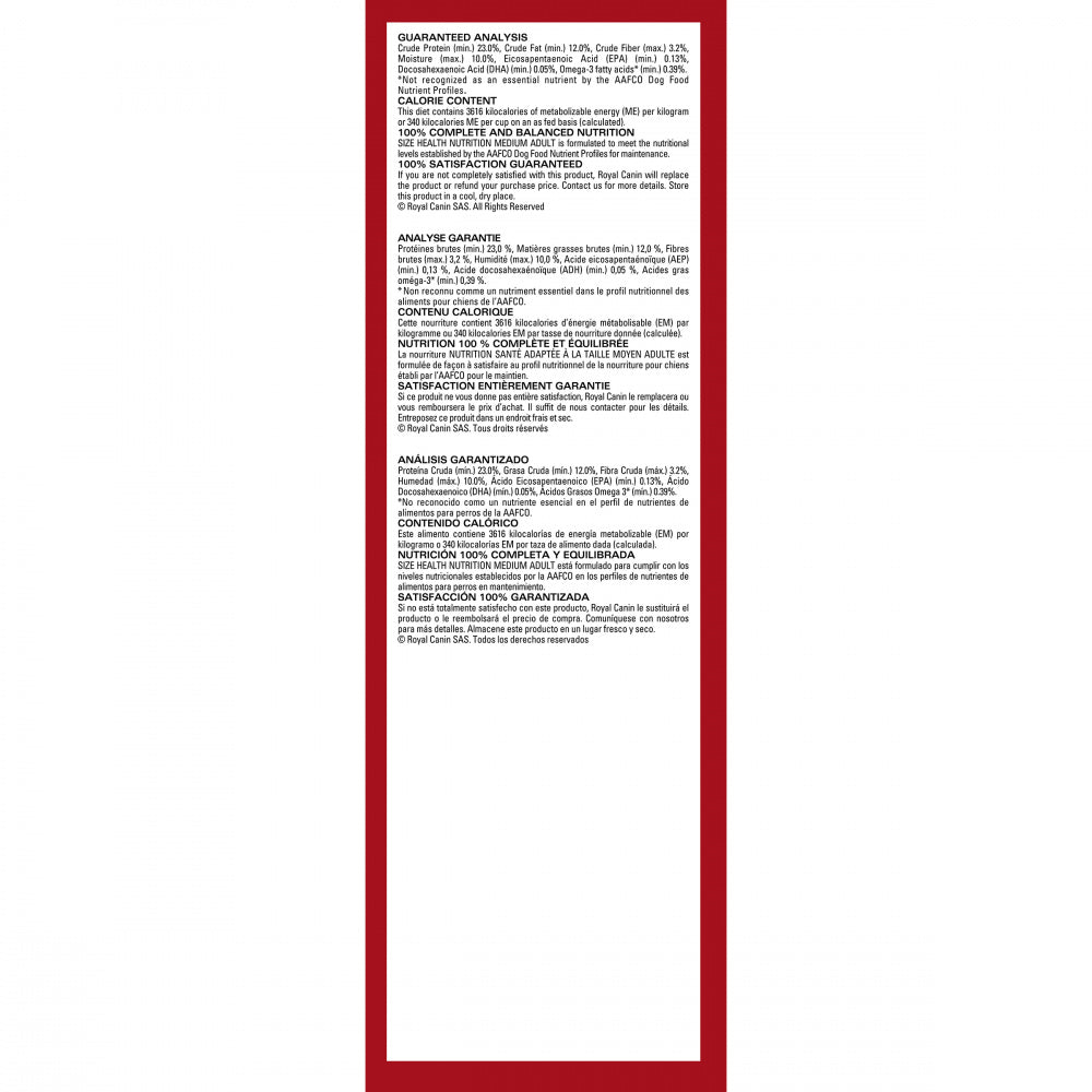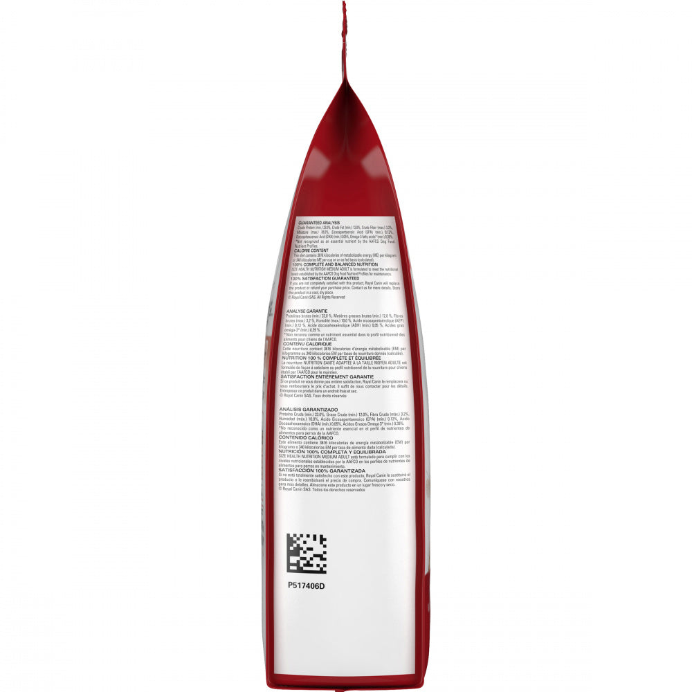 Shop / DOG FOOD / Royal Canin Size Health Nutrition Medium Adult Dry Dog Food Royal Canin Size Health Nutrition Medium Adult Dry Dog Food Royal Canin Weight: 17 lb $65.99 17-lb Purchase Options Free In-Store Pick Up Not Available Save 20% on orders $100+ Set your store for inventory and store pickup details Zip Code Search Same-day Delivery* No minimum charge for delivery orders. *Order before 2pm and have it delivered today. Orders placed after 2pm will be delivered the next day. Must be inside delivery radius. Zip Code Unfortunately delivery is not available to this address. In order to ensure the best availability accuracy, changing your selected store will remove all items from your cart. You will need to re-add these items with your newly selected store if you choose to continue. Continue Cancel Ship it to Me Quantity Add To Cart Feeding guide disclaimer ✕ Feeding guides provide a starting point for the amount of food to give your pet each day. We recommend that you keep your pet in ideal body condition and not allow them to become overweight. The amount of food your pet needs can vary based on age, activity level or other food and treats given, so be sure to work with your veterinarian to determine an appropriate weight for your pet, and to make any necessary adjustments to their feeding. Information Most medium-sized dogs are known for their seemingly endless energy. Whether their favorite thing is swimming, exploring, or lots of walks, they're always on the go. These pets need special nutritional support to help keep them running, jumping, and playing all day, every day. Royal Canin Medium Adult dry dog food is a tailored diet made to feed your dog's high-energy lifestyle. An exclusive mix of antioxidants and prebiotics helps support natural defenses so they can keep on going strong. Omega-3 fatty acids, like EPA and DHA, nourish your dog's skin and coat health to help them stay vibrant. An optimal balance of highly digestible proteins and fibers helps your dog digest and absorb nutrients. Not only that, the exclusive kibble is highly palatable, and will keep them coming back to their bowl every meal. Add variety to their bowl with Royal Canin Adult wet dog food. And when your dog reaches their later years, there's Royal Canin Medium Adult 7+ and Medium Aging Adult 10+ dry dog food to help keep them happy and healthy as they age. Ingredients Brewers rice, chicken by-product meal, oat groats, wheat, corn gluten meal, chicken fat, natural flavors, dried plain beet pulp, fish oil, calcium carbonate, vegetable oil, potassium chloride, salt, monocalcium phosphate, choline chloride, hydrolyzed yeast, vitamins [DL-alpha tocopherol acetate (source of vitamin E), L-ascorbyl-2-polyphosphate (source of vitamin C), biotin, D-calcium pantothenate, vitamin A acetate, niacin supplement, pyridoxine hydrochloride (vitamin B6), thiamine mononitrate (vitamin B1), vitamin B12 supplement, riboflavin supplement, vitamin D3 supplement, folic acid], L-lysine, trace minerals [zinc proteinate, zinc oxide, ferrous sulfate, manganese proteinate, manganous oxide, copper sulfate, calcium iodate, sodium selenite, copper proteinate], magnesium oxide, rosemary extract, preserved with mixed tocopherols and citric acid. Guaranteed Analysis Nutrient Guaranteed Units Crude Protein 23% min Crude Fat 12% min Crude Fiber 3.2% max Moisture 10% max Customers also liked Customer Reviews
