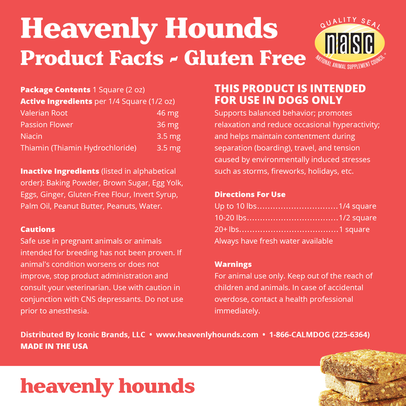 Shop / Dog Treats & Chews / Heavenly Hounds Peanut Butter Relaxation Square Calming Treat for Dogs Heavenly Hounds Peanut Butter Relaxation Square Calming Treat for Dogs Iconic Brands Default Title $5.49 Default Title Purchase Options Free In-Store Pick Up Not Available Save 10% on orders $49+ Set your store for inventory and store pickup details Zip Code Search Same-day Delivery* No minimum charge for delivery orders. *Order before 2pm and have it delivered today. Orders placed after 2pm will be delivered the next day. Must be inside delivery radius. Zip Code Unfortunately delivery is not available to this address. In order to ensure the best availability accuracy, changing your selected store will remove all items from your cart. You will need to re-add these items with your newly selected store if you choose to continue. Continue Cancel Ship it to Me Quantity Add To Cart Feeding guide disclaimer ✕ Feeding guides provide a starting point for the amount of food to give your pet each day. We recommend that you keep your pet in ideal body condition and not allow them to become overweight. The amount of food your pet needs can vary based on age, activity level or other food and treats given, so be sure to work with your veterinarian to determine an appropriate weight for your pet, and to make any necessary adjustments to their feeding. Information • WHOLESOME & NATURAL INGREDIENTS: Heavenly Hounds uses wholesome ingredients with added vitamins and minerals that do not contain hemp to help naturally support relief of dog anxiety. • HELPS SUPPORT DOG ANXIETY RELIEF: This tasty dog snack supports anxiety relief for dogs with a fear of storms, fireworks, pet owner separation, boarding, grooming and travel. These calming treats are also great for supporting relief of hyperactivity, restlessness and car sickness in dogs. • EASES AGGRESSION & HYPERACTIVITY: A blend of vitamins and minerals promotes a mood-boosting calm. Passion flower promotes an uplifted mood while a combination of valerian root, niacin and thiamin work to ease destructive behavior, aggression and hyperactivity. • GREAT TASTING: Single serving peanut butter flavored squares that dogs LOVE! To prolong freshness, refrigerate any unused portion. • MADE IN THE USA: Heavenly Hounds is made right here in the USA. Supports naturally balanced behavior in your canine friend. NO soy, NO wheat, NO corn and NO hemp. Ingredients Peanut Butter, Passion Fruit, Valerian Root, Niacin, Thiamin Customers also liked Customer Reviews