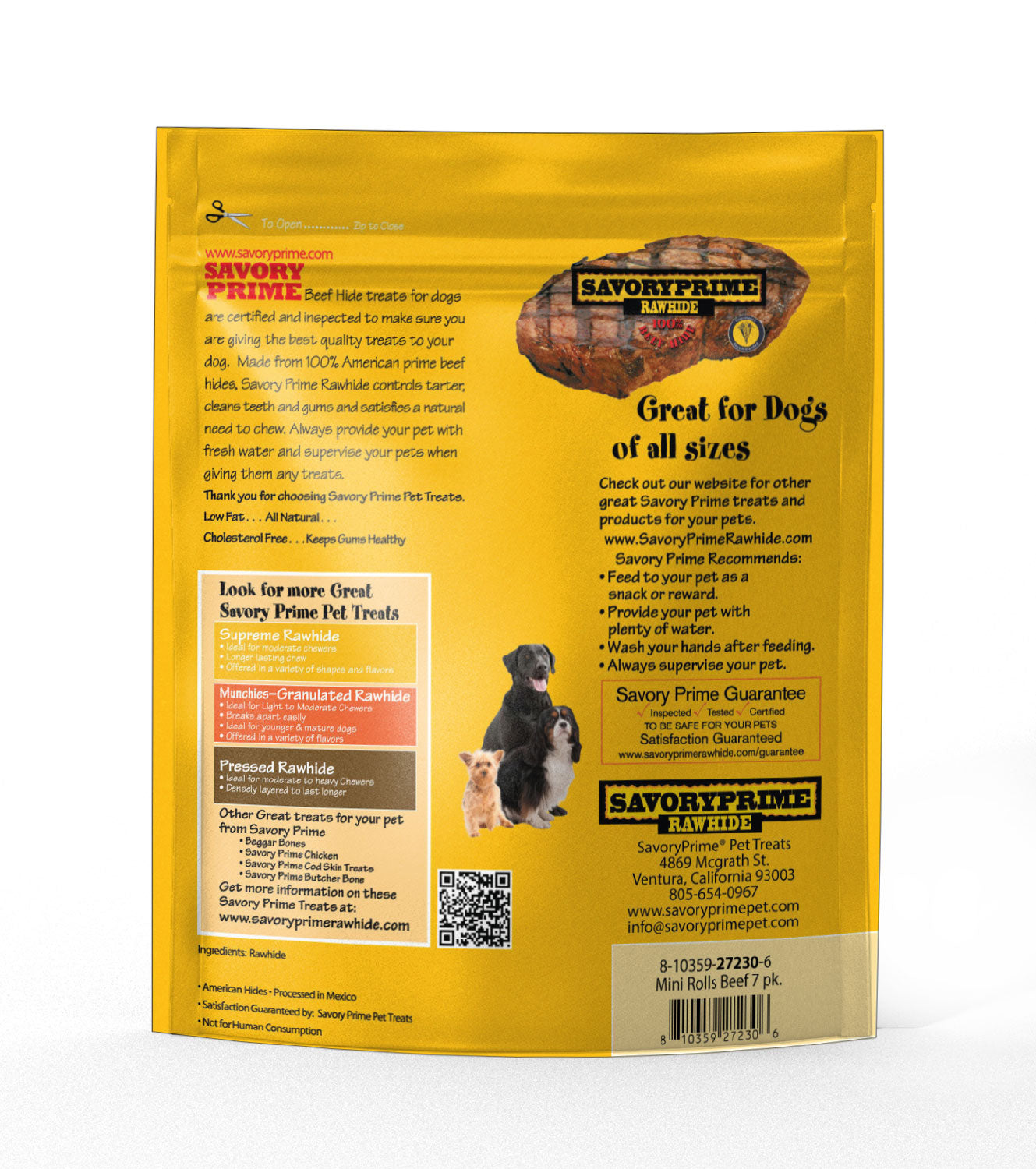Shop / Dog Treats & Chews / Savory Prime AMERICAN Mini Beef Retriever Rolls for Dogs - 7 pk Savory Prime AMERICAN Mini Beef Retriever Rolls for Dogs - 7 pk Savory Prime 7 pack $5.49 7 pack Purchase Options Free In-Store Pick Up Not Available Save 10% on orders $49+ Set your store for inventory and store pickup details Zip Code Search Same-day Delivery* No minimum charge for delivery orders. *Order before 2pm and have it delivered today. Orders placed after 2pm will be delivered the next day. Must be inside delivery radius. Zip Code Unfortunately delivery is not available to this address. In order to ensure the best availability accuracy, changing your selected store will remove all items from your cart. You will need to re-add these items with your newly selected store if you choose to continue. Continue Cancel Ship it to Me Quantity Add To Cart Feeding guide disclaimer ✕ Feeding guides provide a starting point for the amount of food to give your pet each day. We recommend that you keep your pet in ideal body condition and not allow them to become overweight. The amount of food your pet needs can vary based on age, activity level or other food and treats given, so be sure to work with your veterinarian to determine an appropriate weight for your pet, and to make any necessary adjustments to their feeding. Information Dogs love Savory Prime Retriever Rolls. These rawhide chews come from 100% American prime beef hides, oven dried to perfection in our very own certified plant located in Mexico. All of our products are inspected and tested, following strict GFSI food quality standards, and come with a satisfaction guarantee. Savory Prime Rawhide controls tartar, helps clean teeth and gums, and satisfies your dog's natural need to chew. Ingredient: Rawhide Customers also liked Customer Reviews