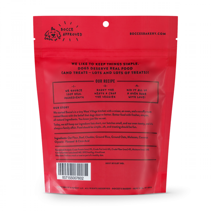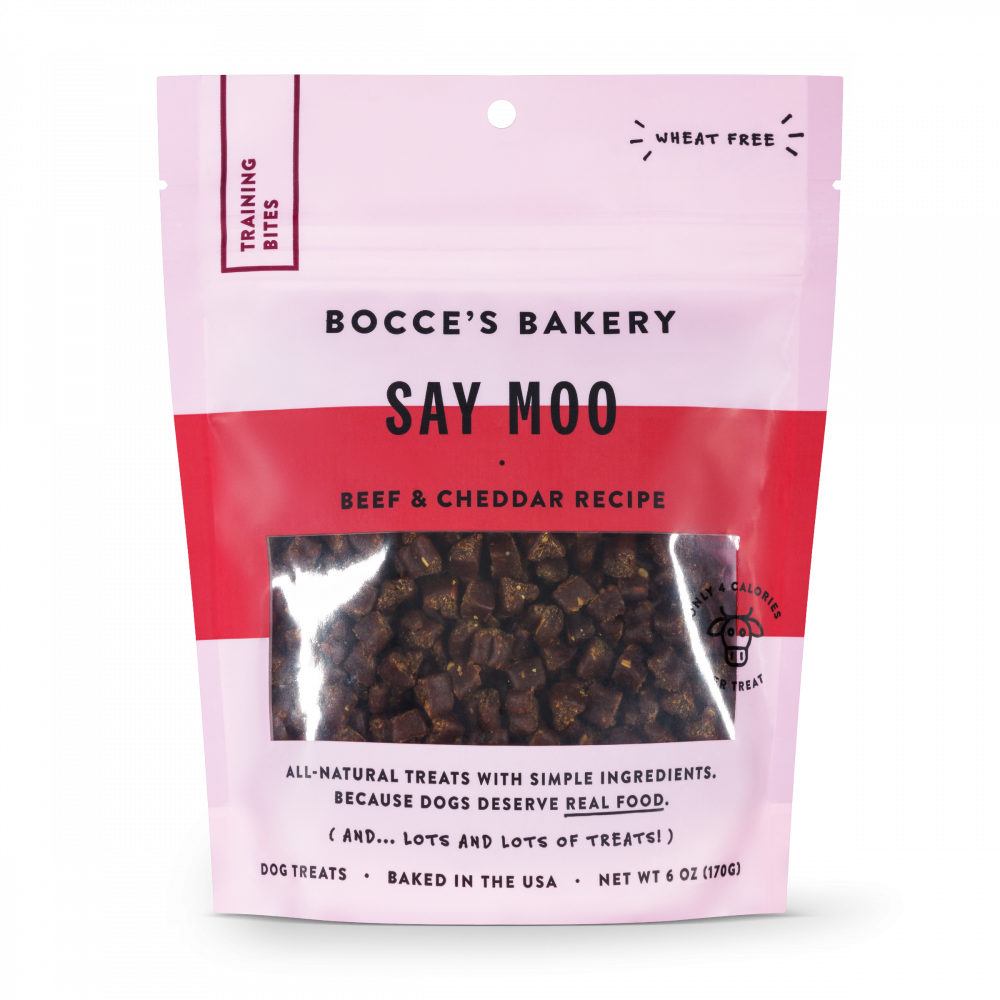 Shop / DOG / Bocce's Bakery Every Day Say Moooo Training Bites Dog Treats Bocce's Bakery Every Day Say Moooo Training Bites Dog Treats Bocces Bakery Weight: 6 oz $7.99 6-oz Purchase Options Free In-Store Pick Up Not Available Save 10% on orders $49+ Set your store for inventory and store pickup details Zip Code Search Same-day Delivery* No minimum charge for delivery orders. *Order before 2pm and have it delivered today. Orders placed after 2pm will be delivered the next day. Must be inside delivery radius. Zip Code Unfortunately delivery is not available to this address. In order to ensure the best availability accuracy, changing your selected store will remove all items from your cart. You will need to re-add these items with your newly selected store if you choose to continue. Continue Cancel Ship it to Me Quantity Add To Cart Feeding guide disclaimer ✕ Feeding guides provide a starting point for the amount of food to give your pet each day. We recommend that you keep your pet in ideal body condition and not allow them to become overweight. The amount of food your pet needs can vary based on age, activity level or other food and treats given, so be sure to work with your veterinarian to determine an appropriate weight for your pet, and to make any necessary adjustments to their feeding. Information Perfectly sized training bites to reward all those sitting pups, those instagram posing mutts, and the slightly naughtier puppies who need a little daily bribing. Why We Love It Wheat-Free 100% Real Ingredients Baked in the USA About Bocce's BakeryBocce is a 5 year old mutt with one scruffy hairdo and a tail that won’t stop wagging! At a doctor’s checkup, Bocce’s was told that he was carrying a few extra pounds. Oh my! So I started looking into what he was eating. I was shocked with the amount of preservatives, and ingredients that I had never heard of in his food ...and treats. We decided to make a change. I combined my love of cooking using organic, seasonal ingredients, with Bocce’s love of biscuits. And Bocce’s Bakery was born! We’ve come up with all-natural biscuits, in delectable flavors, all doggies are sure to love. Still baked by hand, in small batches, with the freshest ingredients we can find. We hope you enjoy our treats. Andrea & Bocce PS: Oh...and Bocce is now at his ideal weight, but we have yet to find a cure for his frizzy hair! Ingredients Oat Flour, Beef, Cheddar, Ground Rice, Ground Oats, Molasses, Coconut Glycerin, Flaxseed, Citric Acid..that's it! Guaranteed Analysis Nutrient Guaranteed Units Crude Protein 9% min Crude Fat 6% min Crude Fiber 4% max Crude Moisture 24% max Customers also liked Customer Reviews