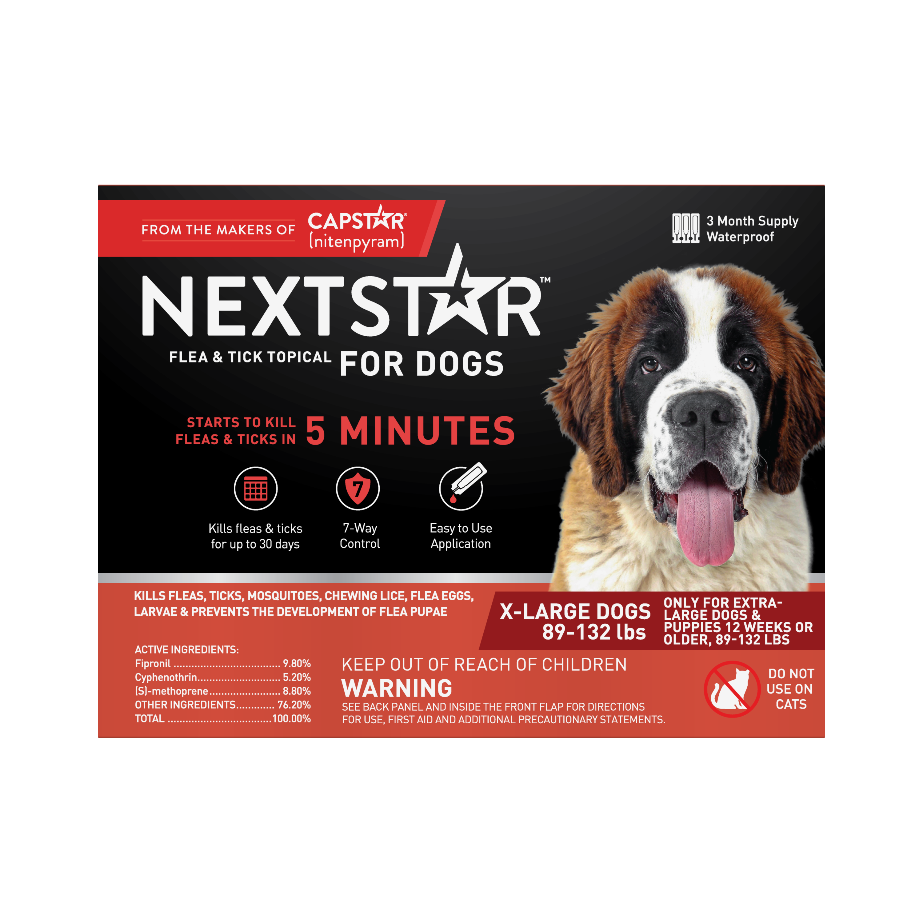 Shop / DOG / Nextstar Flea & Tick Topical Dog 89-132LB 3CT Nextstar Flea & Tick Topical Dog 89-132LB 3CT CapStar Default Title $39.99 Default Title Purchase Options Free In-Store Pick Up Not Available Save 20% on orders $100+ Set your store for inventory and store pickup details Zip Code Search Same-day Delivery* No minimum charge for delivery orders. *Order before 2pm and have it delivered today. Orders placed after 2pm will be delivered the next day. Must be inside delivery radius. Zip Code Unfortunately delivery is not available to this address. In order to ensure the best availability accuracy, changing your selected store will remove all items from your cart. You will need to re-add these items with your newly selected store if you choose to continue. Continue Cancel Ship it to Me Quantity Add To Cart Information NextStar® is the fastest-acting 30-day topical protection available* to help your pet fight off fleas and ticks. Our formula provides a monthly fast-acting, long-lasting solution to continue to protect your pet from fleas and ticks. NextStar® is an easy-to-use, waterproof topical that kills and protects against fleas and ticks through contact with no bite required. Apply NextStar® directly onto your pet’s skin for protection that starts working against fleas & ticks in 5 minutes, full nose-to-tail protection can take up to 24 – 48 hours after initial application. Customers also liked Customer Reviews