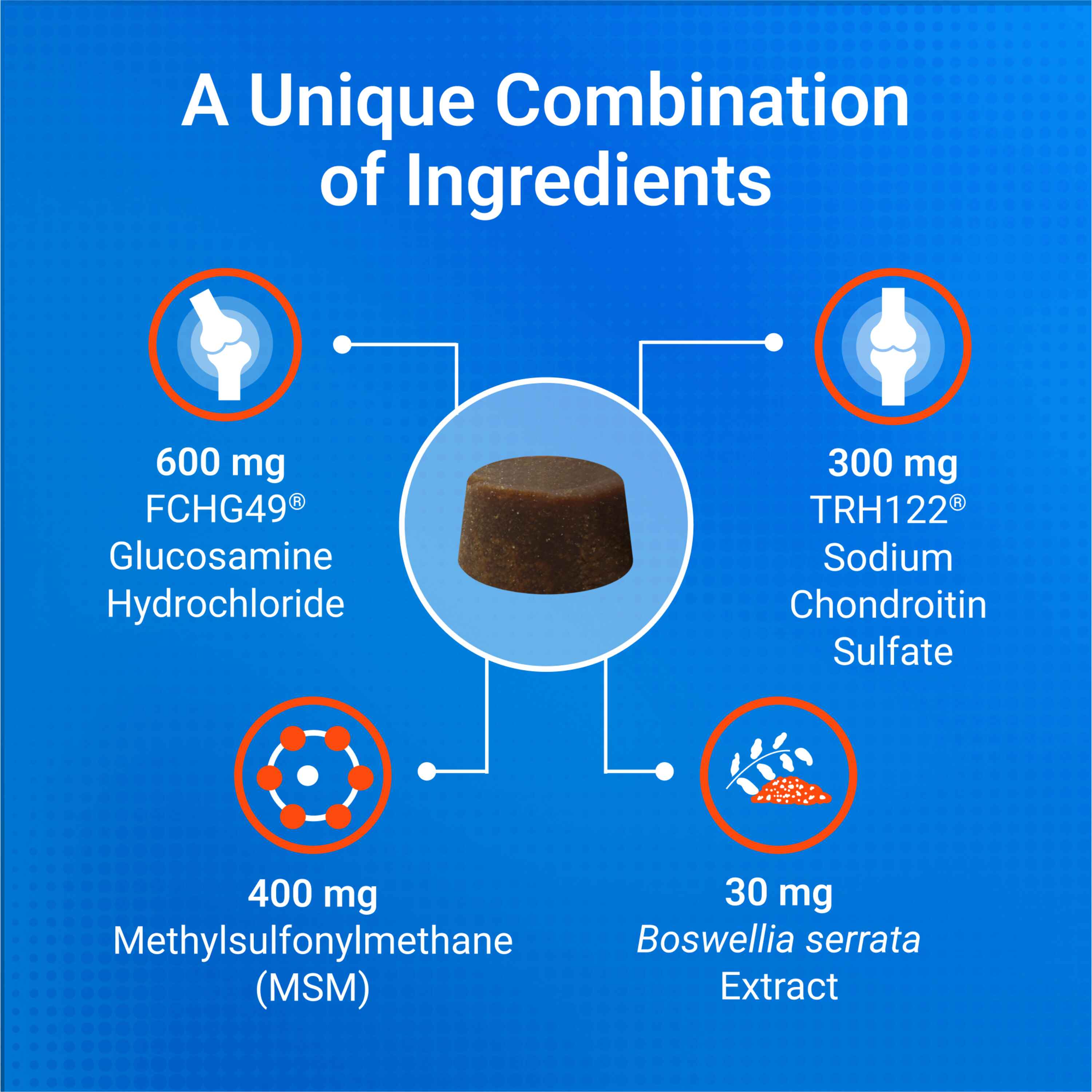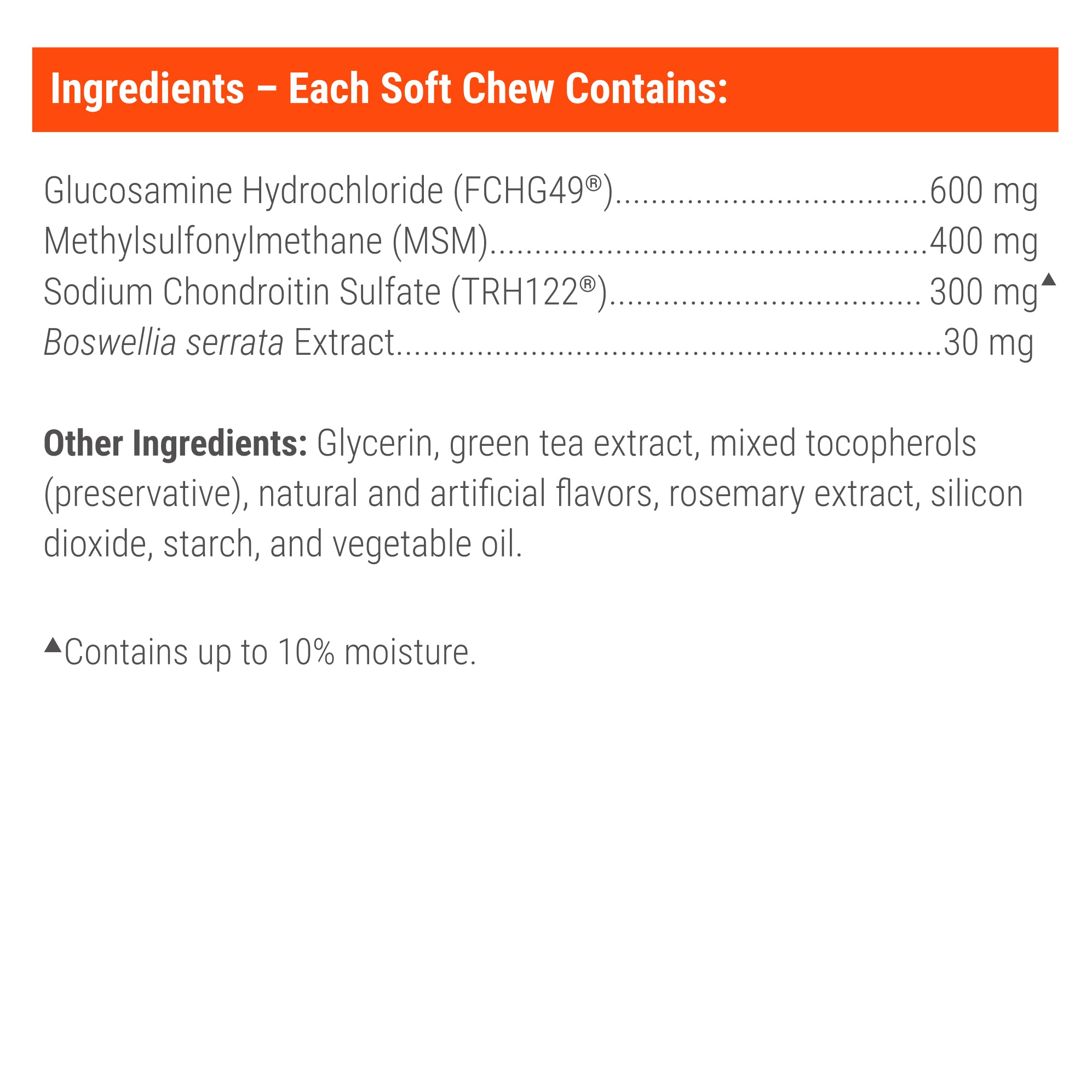 Shop / DOG / Nutramax Cosequin DS Plus MSM Professional Line for Dogs, 60 Soft Chews Nutramax Cosequin DS Plus MSM Professional Line for Dogs, 60 Soft Chews Nutramax Laboratories 60 $44.99 60 Purchase Options Free In-Store Pick Up Not Available Save 20% on orders $100+ Set your store for inventory and store pickup details Zip Code Search Same-day Delivery* No minimum charge for delivery orders. *Order before 2pm and have it delivered today. Orders placed after 2pm will be delivered the next day. Must be inside delivery radius. Zip Code Unfortunately delivery is not available to this address. In order to ensure the best availability accuracy, changing your selected store will remove all items from your cart. You will need to re-add these items with your newly selected store if you choose to continue. Continue Cancel Ship it to Me Quantity Add To Cart Information Cosequin DS Plus MSM Professional Line Plus contains glucosamine hydrochloride, sodium chondroitin sulfate, and methylsulfonylmethane (MSM). This combination of ingredients help support healthy cartilage. Cosequin joint health supplements are brought to you by Nutramax Laboratories Veterinary Sciences, the #1 veterinarian recommended supplement company. Ingredients: Glucosamine Hydrochloride 600 mg , Methylsulfonylmethane (MSM) 400 mg, Sodium Chondroitin Sulfate (Derived from bovine cartilage) 300 mg, Boswellia Serrata Extract 30 mg. Other Ingredients: Glycerin, green tea extract, mixed tocopherols (preservative), natural flavor, rosemary extract, silicon dioxide, starch, and vegetable oil. Customers also liked Customer Reviews