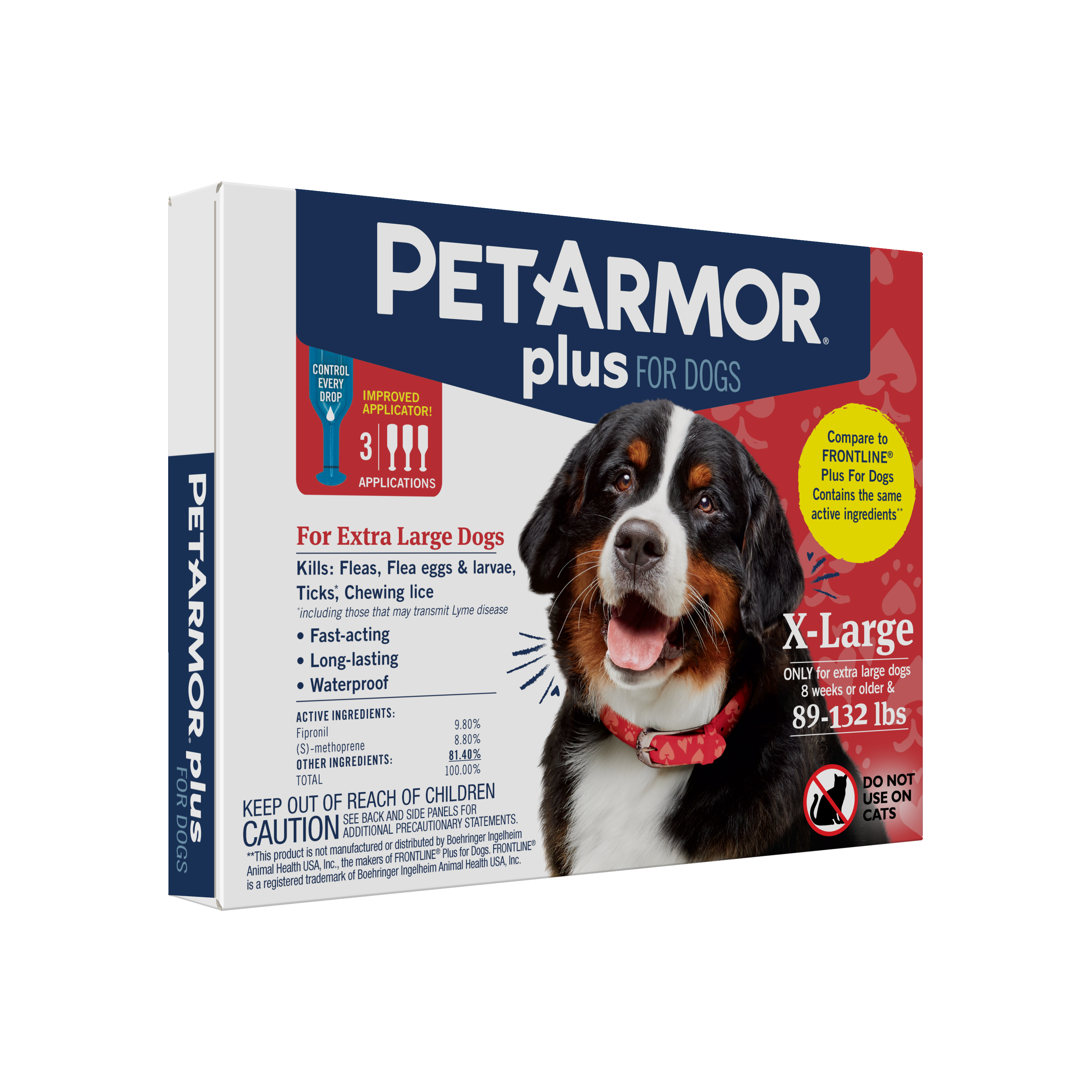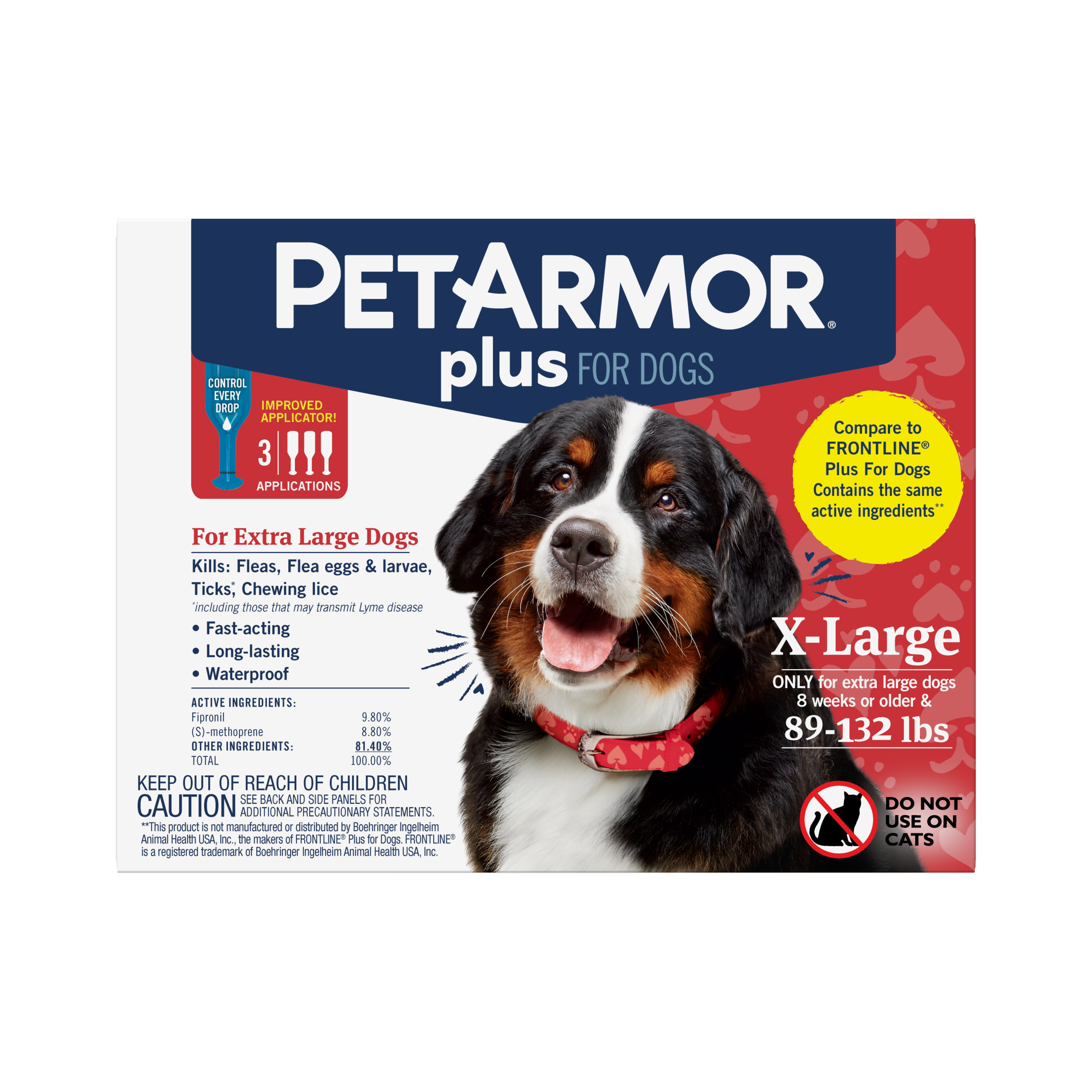 Shop / DOG / PetArmor Plus Flea & Tick Topical Dog 89-132LB 3CT PetArmor Plus Flea & Tick Topical Dog 89-132LB 3CT PetArmor Default Title $24.99 Default Title Purchase Options Free In-Store Pick Up Not Available Save 20% on orders $100+ Set your store for inventory and store pickup details Zip Code Search Same-day Delivery* No minimum charge for delivery orders. *Order before 2pm and have it delivered today. Orders placed after 2pm will be delivered the next day. Must be inside delivery radius. Zip Code Unfortunately delivery is not available to this address. In order to ensure the best availability accuracy, changing your selected store will remove all items from your cart. You will need to re-add these items with your newly selected store if you choose to continue. Continue Cancel Ship it to Me Quantity Add To Cart Information This fast-acting, quality flea and tick control for dogs starts killing fleas, ticks, and chewing lice within 24-48 hours. PETARMOR Plus effectively kills fleas and ticks. This waterproof topical flea and tick treatment kills and prevents fleas, flea eggs, flea larvae, ticks, and chewing lice for up to 30 days. Customers also liked Customer Reviews