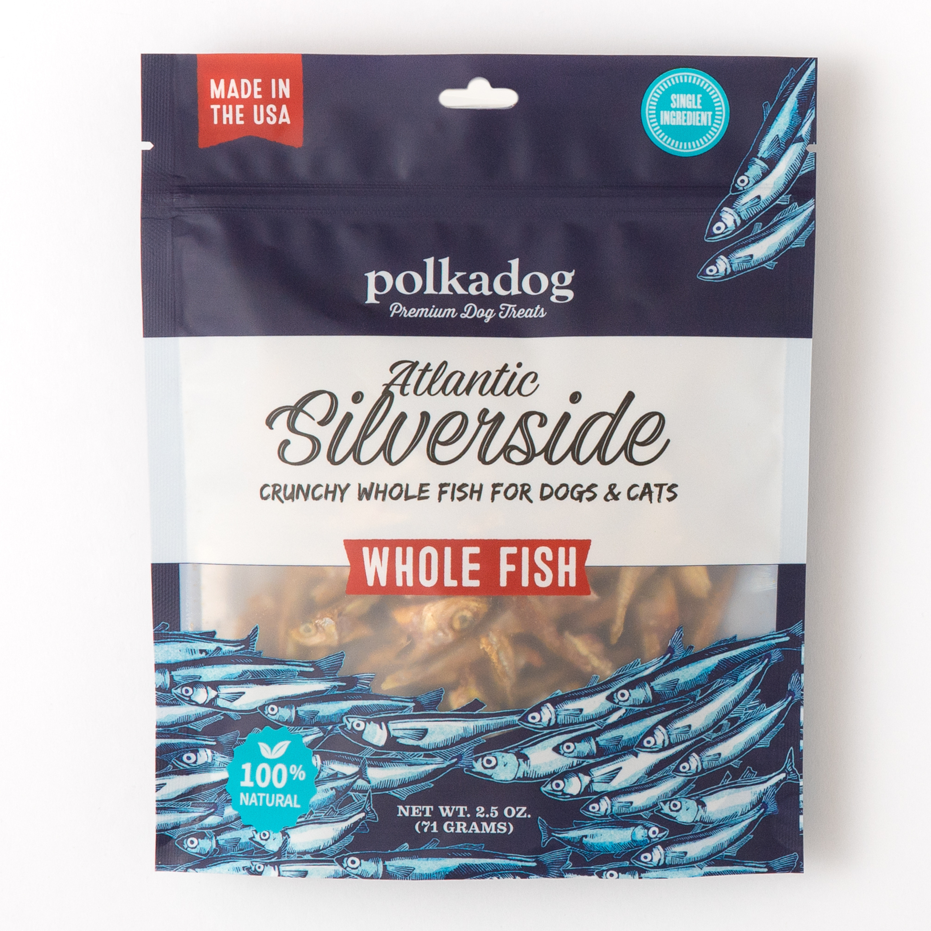 Shop / DOG / Polkadog Atlantic Silverside Polkadog Atlantic Silverside Polkadog 2.5oz $13.99 2.5oz Purchase Options Free In-Store Pick Up Not Available Save 20% on orders $100+ Set your store for inventory and store pickup details Zip Code Search Same-day Delivery* No minimum charge for delivery orders. *Order before 2pm and have it delivered today. Orders placed after 2pm will be delivered the next day. Must be inside delivery radius. Zip Code Unfortunately delivery is not available to this address. In order to ensure the best availability accuracy, changing your selected store will remove all items from your cart. You will need to re-add these items with your newly selected store if you choose to continue. Continue Cancel Ship it to Me Quantity Add To Cart Feeding guide disclaimer ✕ Feeding guides provide a starting point for the amount of food to give your pet each day. We recommend that you keep your pet in ideal body condition and not allow them to become overweight. The amount of food your pet needs can vary based on age, activity level or other food and treats given, so be sure to work with your veterinarian to determine an appropriate weight for your pet, and to make any necessary adjustments to their feeding. Information Atlantic Silverside are what single ingredient dog and cat treat dreams are made of! They are high in Omega-3s, low in fats, and grain and gluten free. Talk about a great catch. Ingredients: Atlantic Silverside. Guaranteed Analysis: Crude Protein (Min) 71%, Crude Fat (Min) 12%, Crude Fiber (Max) 1%, Moisture (Max) 4% 3630 kcal/kg 3.6 kcal/treat Customers also liked Customer Reviews