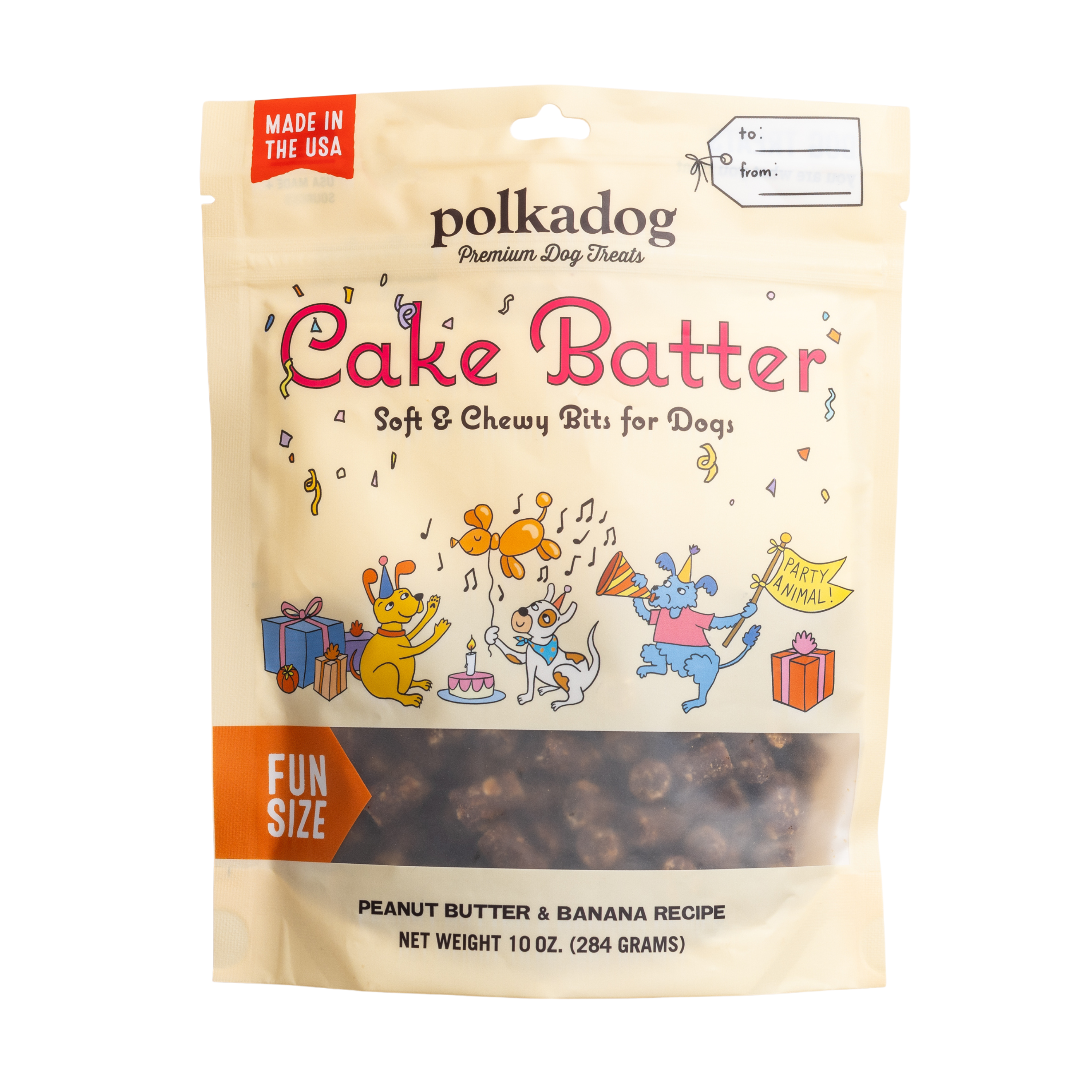 Shop / DOG / Polkadog Cake Batter Polkadog Cake Batter Polkadog 10oz $13.99 10oz Purchase Options Free In-Store Pick Up Not Available Save 20% on orders $100+ Set your store for inventory and store pickup details Zip Code Search Same-day Delivery* No minimum charge for delivery orders. *Order before 2pm and have it delivered today. Orders placed after 2pm will be delivered the next day. Must be inside delivery radius. Zip Code Unfortunately delivery is not available to this address. In order to ensure the best availability accuracy, changing your selected store will remove all items from your cart. You will need to re-add these items with your newly selected store if you choose to continue. Continue Cancel Ship it to Me Quantity Add To Cart Feeding guide disclaimer ✕ Feeding guides provide a starting point for the amount of food to give your pet each day. We recommend that you keep your pet in ideal body condition and not allow them to become overweight. The amount of food your pet needs can vary based on age, activity level or other food and treats given, so be sure to work with your veterinarian to determine an appropriate weight for your pet, and to make any necessary adjustments to their feeding. Information Have your Cake [Batter] and eat it too! You’ll have the most popular pup at the party if you show up with our soft & chewy peanut butter and banana Cake Batter bits! Whether it’s your furry friend’s birthday, gotcha day, or any other day of the week that ends in the letter “y”, these are the perfect, fun size treat for any occasion! Ingredients: Barley Flour, Vegetable Glycerin, Rolled Oats, Unsalted Peanut Butter, Cane Molasses, Dehydrated Banana Powder. Guaranteed Analysis: Crude Protein (Min) 12%, Crude Fat (Min) 13%, Crude Fiber (Max) 2%, Moisture (Max) 11% 3,740 kcal/kg 5.6 kcal/treat Customers also liked Customer Reviews