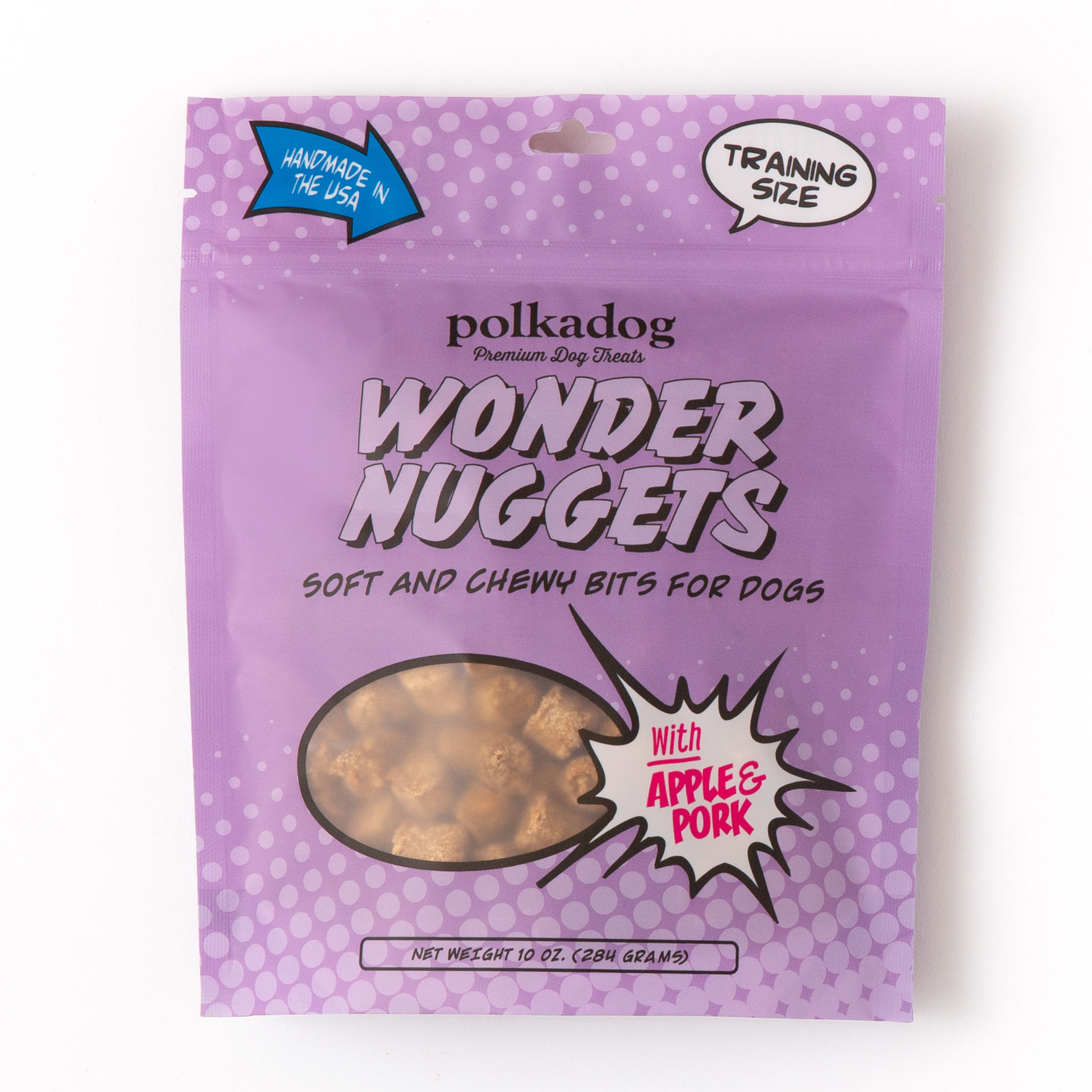 Shop / DOG / Polkadog Pork & Apple Wonder Nuggets Polkadog Pork & Apple Wonder Nuggets Polkadog 10oz $13.99 10oz Purchase Options Free In-Store Pick Up Not Available Save 20% on orders $100+ Set your store for inventory and store pickup details Zip Code Search Same-day Delivery* No minimum charge for delivery orders. *Order before 2pm and have it delivered today. Orders placed after 2pm will be delivered the next day. Must be inside delivery radius. Zip Code Unfortunately delivery is not available to this address. In order to ensure the best availability accuracy, changing your selected store will remove all items from your cart. You will need to re-add these items with your newly selected store if you choose to continue. Continue Cancel Ship it to Me Quantity Add To Cart Feeding guide disclaimer ✕ Feeding guides provide a starting point for the amount of food to give your pet each day. We recommend that you keep your pet in ideal body condition and not allow them to become overweight. The amount of food your pet needs can vary based on age, activity level or other food and treats given, so be sure to work with your veterinarian to determine an appropriate weight for your pet, and to make any necessary adjustments to their feeding. Information Succulent buttery pork chop, we will never let you down. We will not ask what you do for us. What can we do for you? We will not forget you crave apples both tart and sweet, so juicy, so bright. O Pork! O Apple! Pork & Apple Wonder Nugget you shall be! Pork, at US farms we will find you, and in our Boston Fish Pier kitchen we will craft you, fulfilling our duty as makers of the finest pet treats in all the lands of the earth. O soft gentle bites: the Dog howls with gratitude! Ingredients: Rolled Oats, Vegetable Glycerin, Barley Flour, Dried Apples, Dried Pork Liver. Guaranteed Analysis: Crude Protein (Min) 8%, Crude Fat (Min) 3%, Crude Fiber (Max) 1%, Moisture (Max) 12% 3200 kcal/kg 4.8 kcal/treat Customers also liked Customer Reviews