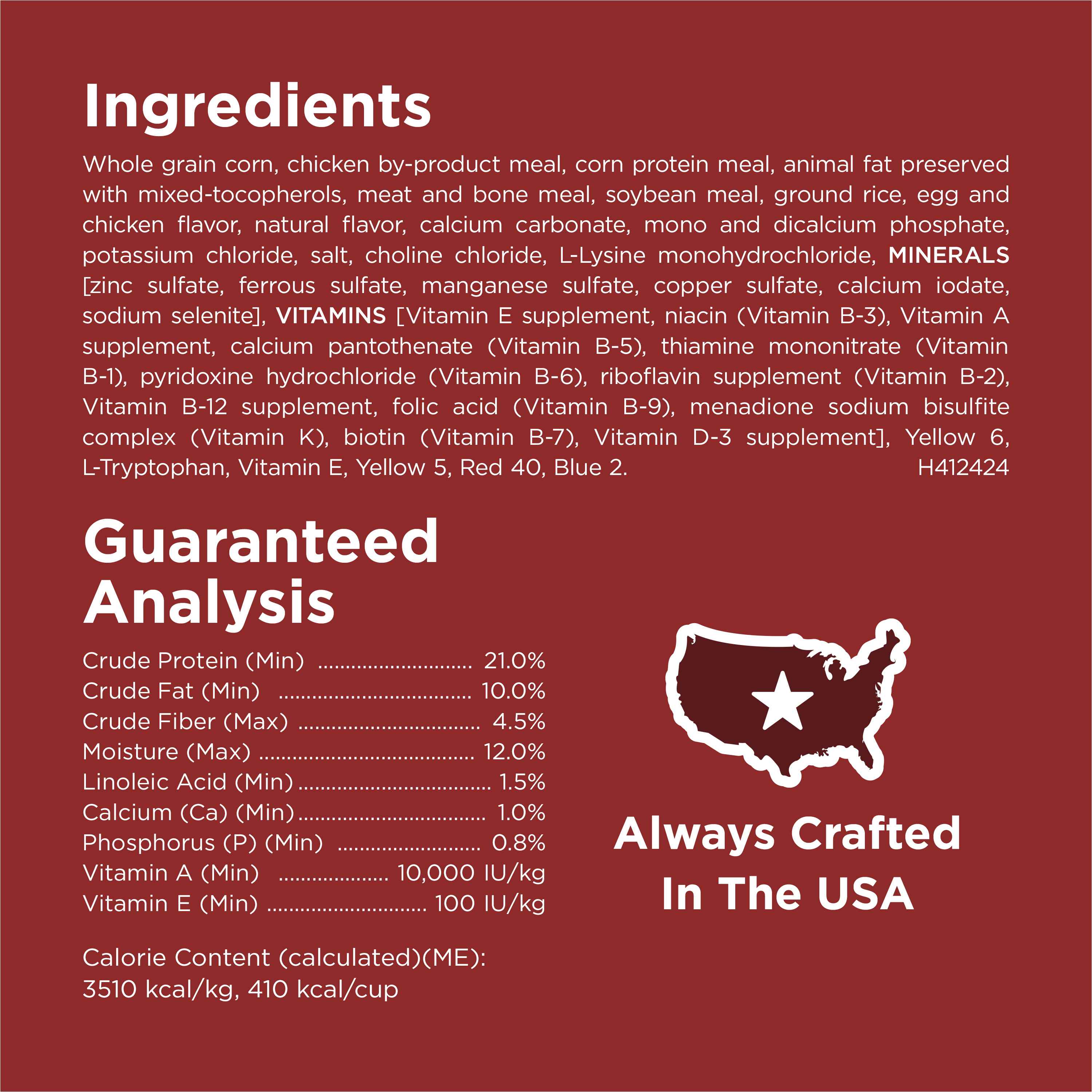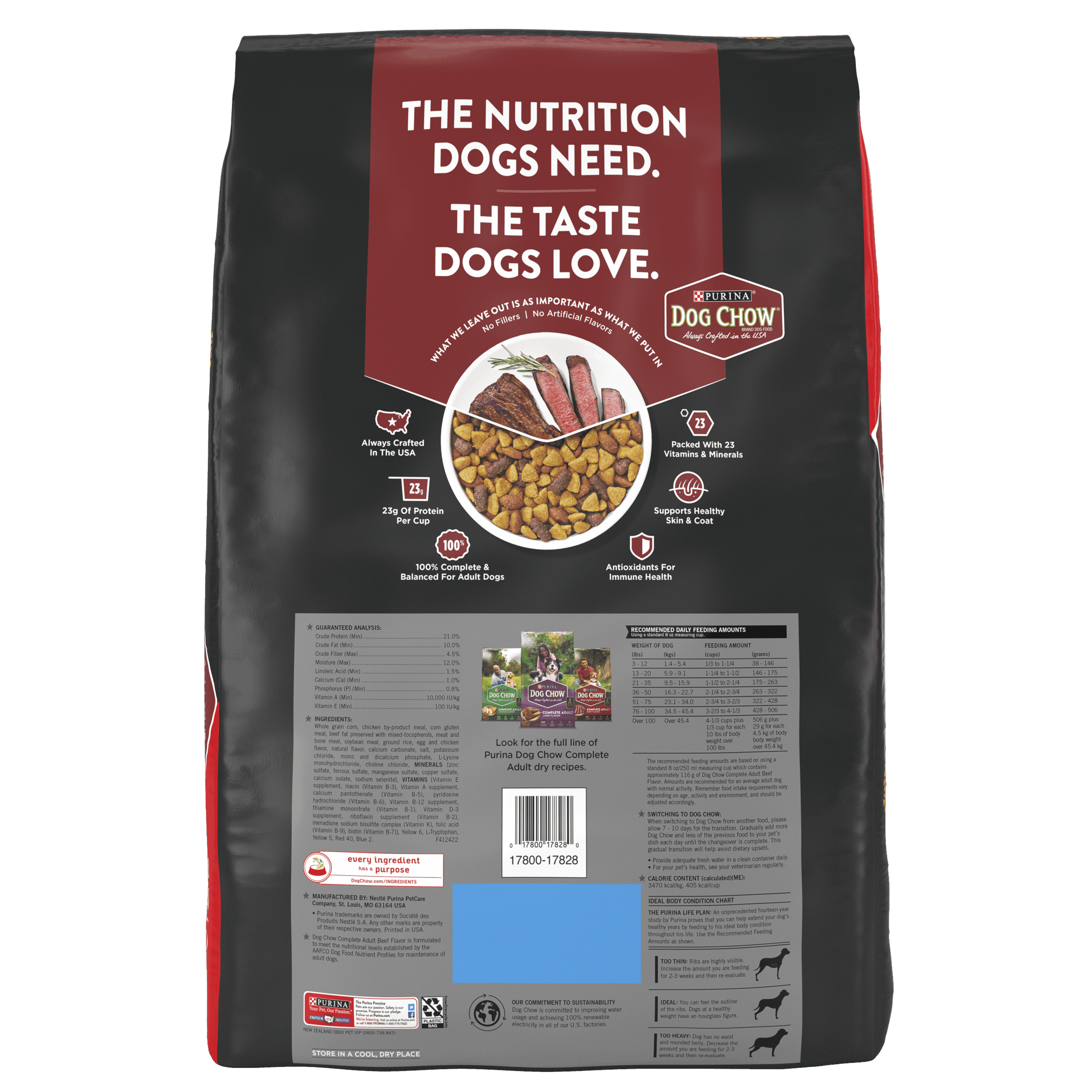 Shop / DOG / Purina Dog Chow Complete Adult Dry Dog Food Kibble Beef Flavor Purina Dog Chow Complete Adult Dry Dog Food Kibble Beef Flavor Purina Dog Chow $32.99 44lb 18.5lb 44lb 18.5lb Purchase Options Free In-Store Pick Up Not Available Save 20% on orders $100+ Set your store for inventory and store pickup details Zip Code Search Same-day Delivery* No minimum charge for delivery orders. *Order before 2pm and have it delivered today. Orders placed after 2pm will be delivered the next day. Must be inside delivery radius. Zip Code Unfortunately delivery is not available to this address. In order to ensure the best availability accuracy, changing your selected store will remove all items from your cart. You will need to re-add these items with your newly selected store if you choose to continue. Continue Cancel Ship it to Me Quantity Add To Cart Feeding guide disclaimer ✕ Feeding guides provide a starting point for the amount of food to give your pet each day. We recommend that you keep your pet in ideal body condition and not allow them to become overweight. The amount of food your pet needs can vary based on age, activity level or other food and treats given, so be sure to work with your veterinarian to determine an appropriate weight for your pet, and to make any necessary adjustments to their feeding. Information Give your dog the nutrition they need with the taste they love by serving Purina Dog Chow Complete Adult Beef Flavor dry dog food. This delicious adult dog food recipe is made with high-quality ingredients, giving them a wholesome dog food meal option that you can both feel good about. With 23 essential vitamins and minerals in every serving, this kibble dog food helps support your dog's overall health and wellness. Crafted without artificial flavors, this Purina dry dog food recipe provides 100 percent complete and balanced nutrition that adult dogs need and supports immune health. High-quality protein for dogs in every serving helps support your dog's strong muscles to maintain an active lifestyle. This Purina Dog Chow Complete adult dog food is carefully crafted by employees who trust it enough to feed it to their own dogs. Tempt your dog to their dish with the delightful flavors found in this dry dog kibble recipe, and rest easy knowing they’re getting a nutritious meal. Ingredients Whole Grain Corn, Chicken By-Product Meal, Corn Protein Meal, Animal Fat Preserved With Mixed-Tocopherols, Meat And Bone Meal, Soybean Meal, Ground Rice, Egg And Chicken Flavor, Natural Flavor, Calcium Carbonate, Mono And Dicalcium Phosphate, Potassium Chloride, Salt, Choline Chloride, L-Lysine Monohydrochloride, MINERALS [Zinc Sulfate, Ferrous Sulfate, Manganese Sulfate, Copper Sulfate, Calcium Iodate, Sodium Selenite], VITAMINS [Vitamin E Supplement, Niacin (Vitamin B-3), Vitamin A Supplement, Calcium Pantothenate (Vitamin B-5), Thiamine Mononitrate (Vitamin B-1), Pyridoxine Hydrochloride (Vitamin B-6), Riboflavin Supplement (Vitamin B-2), Vitamin B-12 Supplement, Folic Acid (Vitamin B-9), Menadione Sodium Bisulfite Complex (Vitamin K), Biotin (Vitamin B-7), Vitamin D-3 Supplement], Yellow 6, L-Tryptophan, Vitamin E, Yellow 5, Red 40, Blue 2. H412424 Guaranteed Analysis Crude Protein (min)…21.0%, Crude Fat (min)…10.0%, Crude Fiber (max)…4.5%, Moisture (max)…12.0%, Linoleic Acid (min)… 1.5%, Calcium (Ca) (min)… 1.0%, Phosphorus (P)(min)… 0.8%, Vitamin A (min)… 10000 IU/kg, Vitamin E (min)… 100 IU/kg. Customers also liked Customer Reviews