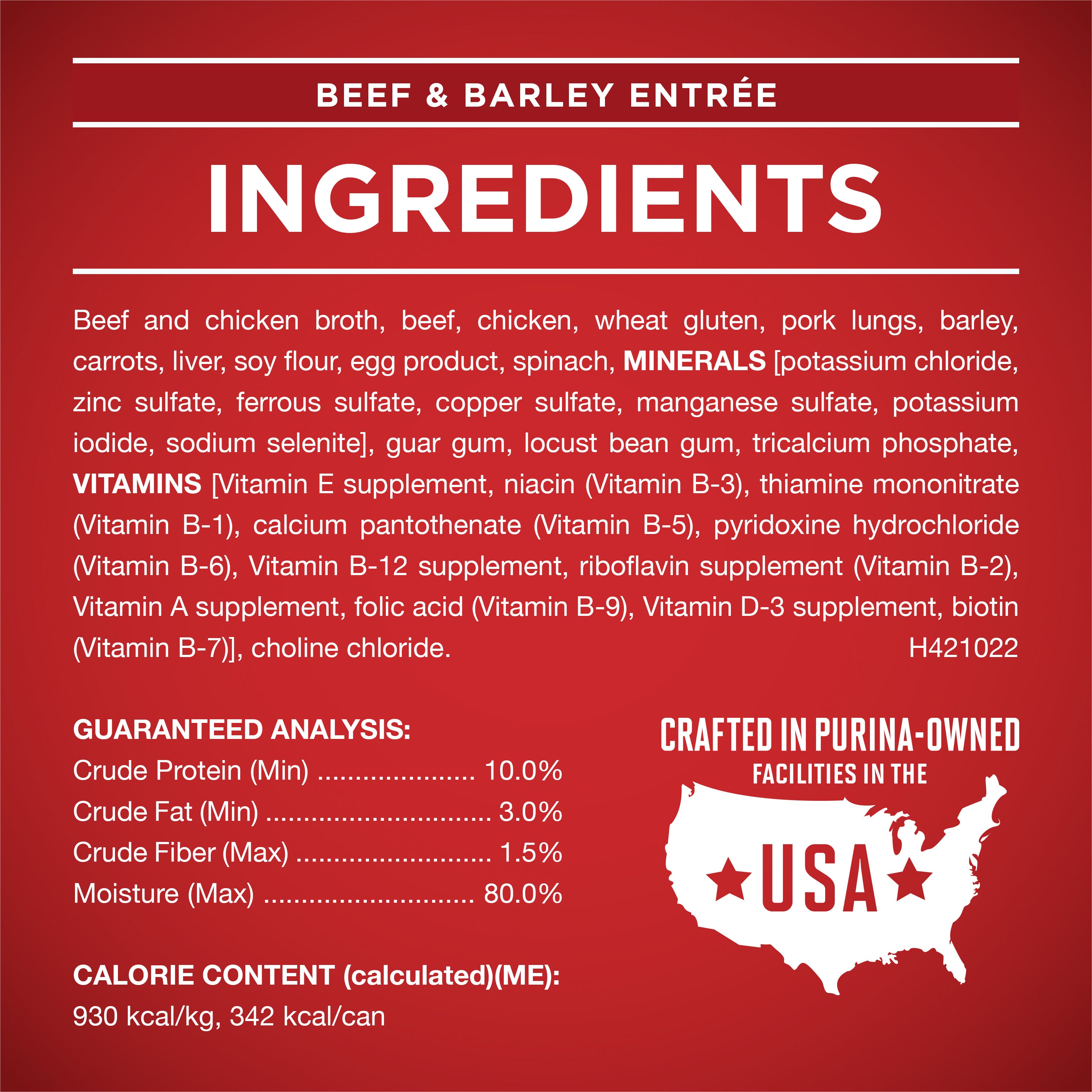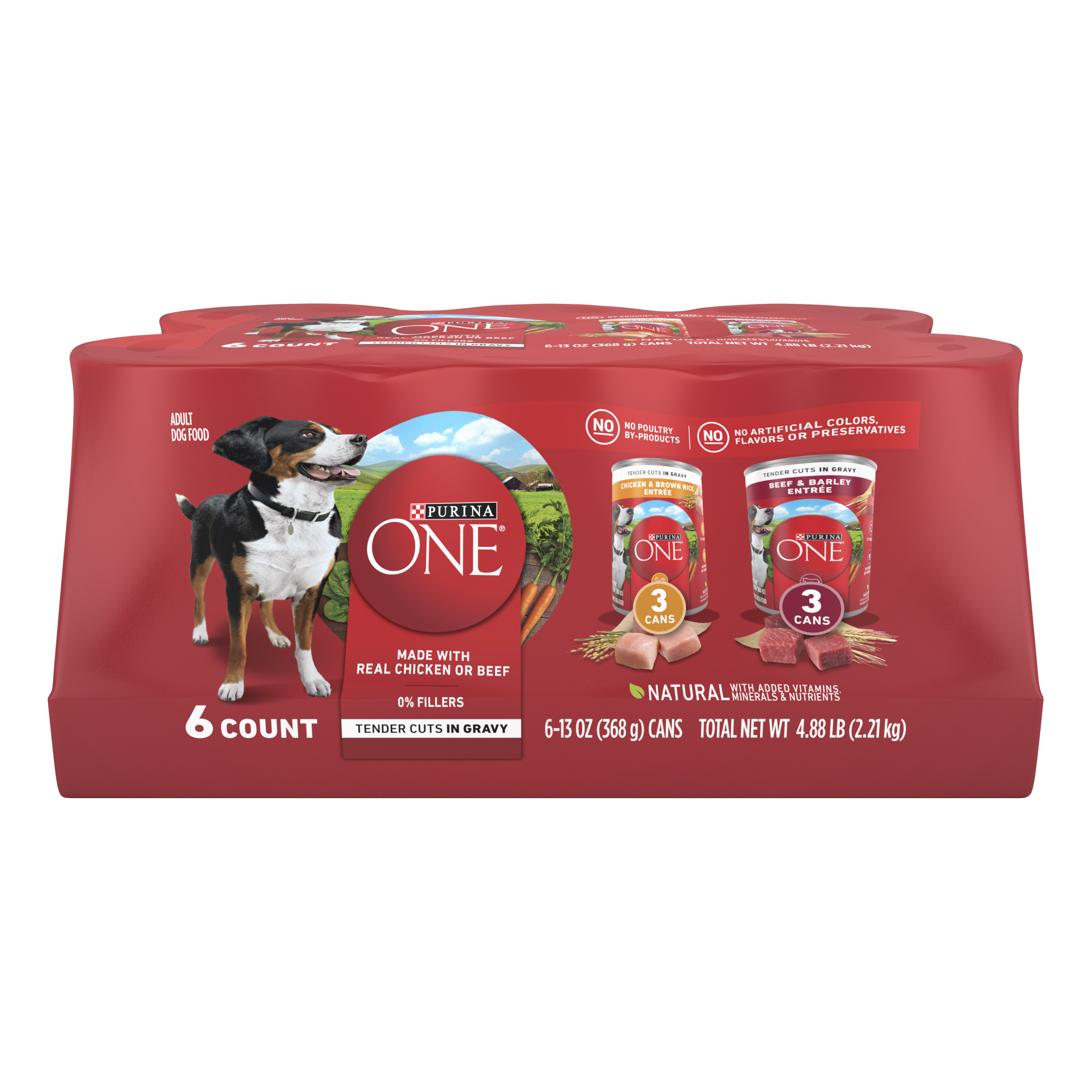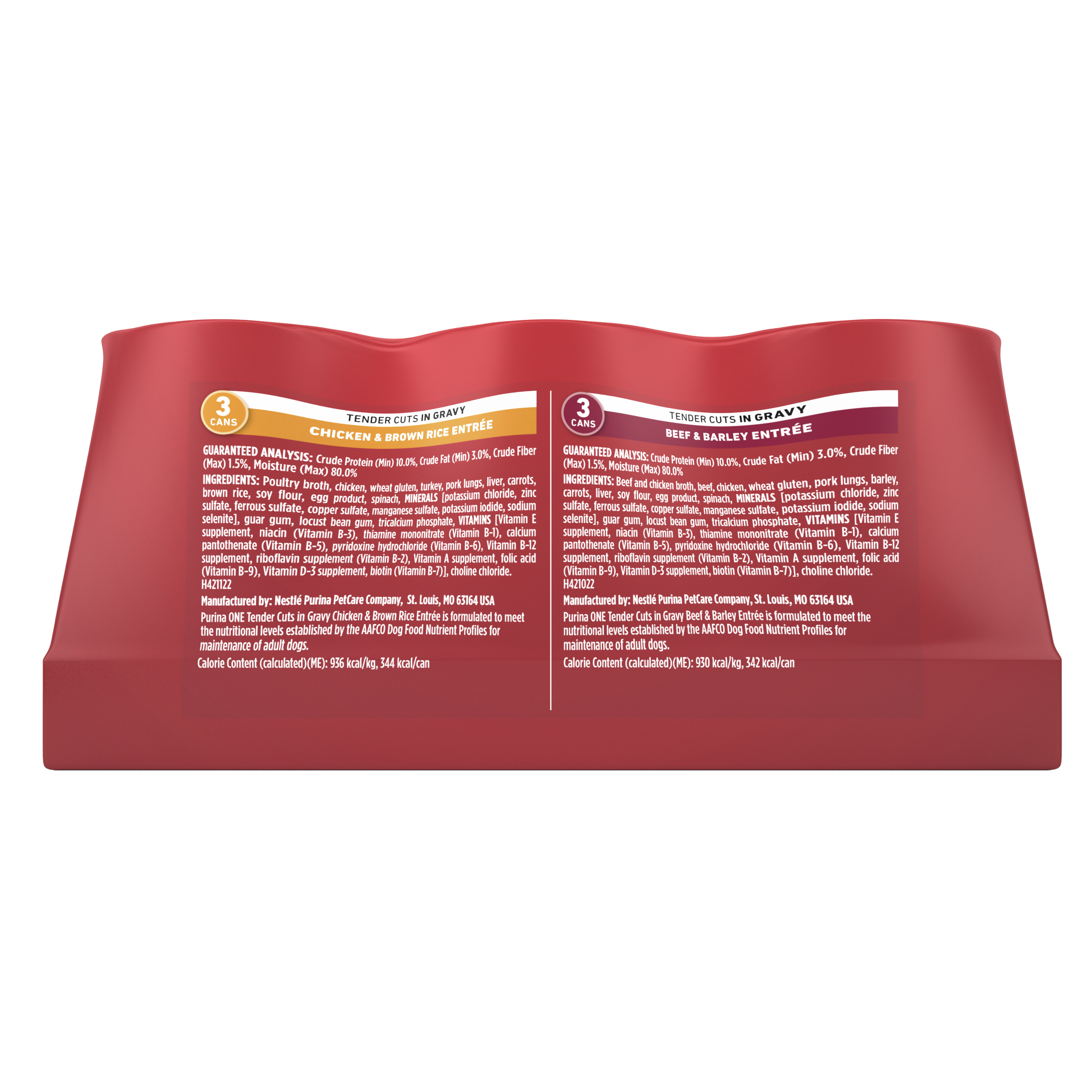 Shop / DOG / Purina ONE Tender Cuts in Gravy Chicken and Brown Rice, and Beef and Barley Entrees Wet Dog Food Variety Pack Purina ONE Tender Cuts in Gravy Chicken and Brown Rice, and Beef and Barley Entrees Wet Dog Food Variety Pack Purina ONE 13oz $11.99 13oz Purchase Options Free In-Store Pick Up Not Available Save 20% on orders $100+ Set your store for inventory and store pickup details Zip Code Search Same-day Delivery* No minimum charge for delivery orders. *Order before 2pm and have it delivered today. Orders placed after 2pm will be delivered the next day. Must be inside delivery radius. Zip Code Unfortunately delivery is not available to this address. In order to ensure the best availability accuracy, changing your selected store will remove all items from your cart. You will need to re-add these items with your newly selected store if you choose to continue. Continue Cancel Ship it to Me Quantity Add To Cart Feeding guide disclaimer ✕ Feeding guides provide a starting point for the amount of food to give your pet each day. We recommend that you keep your pet in ideal body condition and not allow them to become overweight. The amount of food your pet needs can vary based on age, activity level or other food and treats given, so be sure to work with your veterinarian to determine an appropriate weight for your pet, and to make any necessary adjustments to their feeding. Information Give your dog an assortment of mealtime options with this Purina ONE Tender Cuts in Gravy wet adult dog food variety pack that is natural with added vitamins, minerals and nutrients. Both recipes feature real chicken or beef along with other high-quality natural dog food with added vitamins, minerals, and nutrients you can feel good about giving to your dog. The tender, meaty canned dog food texture gives him something to sink his teeth into, and a rich gravy for dogs balances out each of these delicious meals for added flavor and moisture. These high protein dog food formulas are made with no poultry by-products and no artificial colors, flavors or preservatives. With 100 percent complete and balanced nutrition for your adult dog's whole-body health, this canned food for dogs is a tasty way to satisfy his nutritional needs. Alternate between these two Purina ONE wet dog food Chicken and Brown Rice or Beef and Barley Entrees and show him just how much you care about his health and happiness. Ingredients Chicken & Brown Rice: Poultry Broth, Chicken, Wheat Gluten, Turkey, Pork Lungs, Liver, Carrots, Brown Rice, Soy Flour, Egg Product, Spinach, MINERALS [Potassium Chloride, Zinc Sulfate, Ferrous Sulfate, Copper Sulfate, Manganese Sulfate, Potassium Iodide, Sodium Selenite], Guar Gum, Locust Bean Gum, Tricalcium Phosphate, VITAMINS [Vitamin E Supplement, Niacin (Vitamin B-3), Thiamine Mononitrate (Vitamin B-1), Calcium Pantothenate (Vitamin B-5), Pyridoxine Hydrochloride (Vitamin B-6), Vitamin B-12 Supplement, Riboflavin Supplement (Vitamin B-2), Vitamin A Supplement, Folic Acid (Vitamin B-9), Vitamin D-3 Supplement, Biotin (Vitamin B-7)], Choline Chloride. H421122 Beef & Barley: Beef And Chicken Broth, Beef, Chicken, Wheat Gluten, Pork Lungs, Barley, Carrots, Liver, Soy Flour, Egg Product, Spinach, MINERALS [Potassium Chloride, Zinc Sulfate, Ferrous Sulfate, Copper Sulfate, Manganese Sulfate, Potassium Iodide, Sodium Selenite], Guar Gum, Locust Bean Gum, Tricalcium Phosphate, VITAMINS [Vitamin E Supplement, Niacin (Vitamin B-3), Thiamine Mononitrate (Vitamin B-1), Calcium Pantothenate (Vitamin B-5), Pyridoxine Hydrochloride (Vitamin B-6), Vitamin B-12 Supplement, Riboflavin Supplement (Vitamin B-2), Vitamin A Supplement, Folic Acid (Vitamin B-9), Vitamin D-3 Supplement, Biotin (Vitamin B-7)], Choline Chloride. H421022 Guaranteed Analysis Chicken & Brown Rice: Crude Protein (Min)…10.0%, Crude Fat (Min)…3.0%, Crude Fiber (Max)…1.5%, Moisture (Max)…80.0%; Beef & Barley: Crude Protein (Min)…10.0%, Crude Fat (Min)…3.0%, Crude Fiber (Max)…1.5%, Moisture (Max)…80.0% Customers also liked Customer Reviews