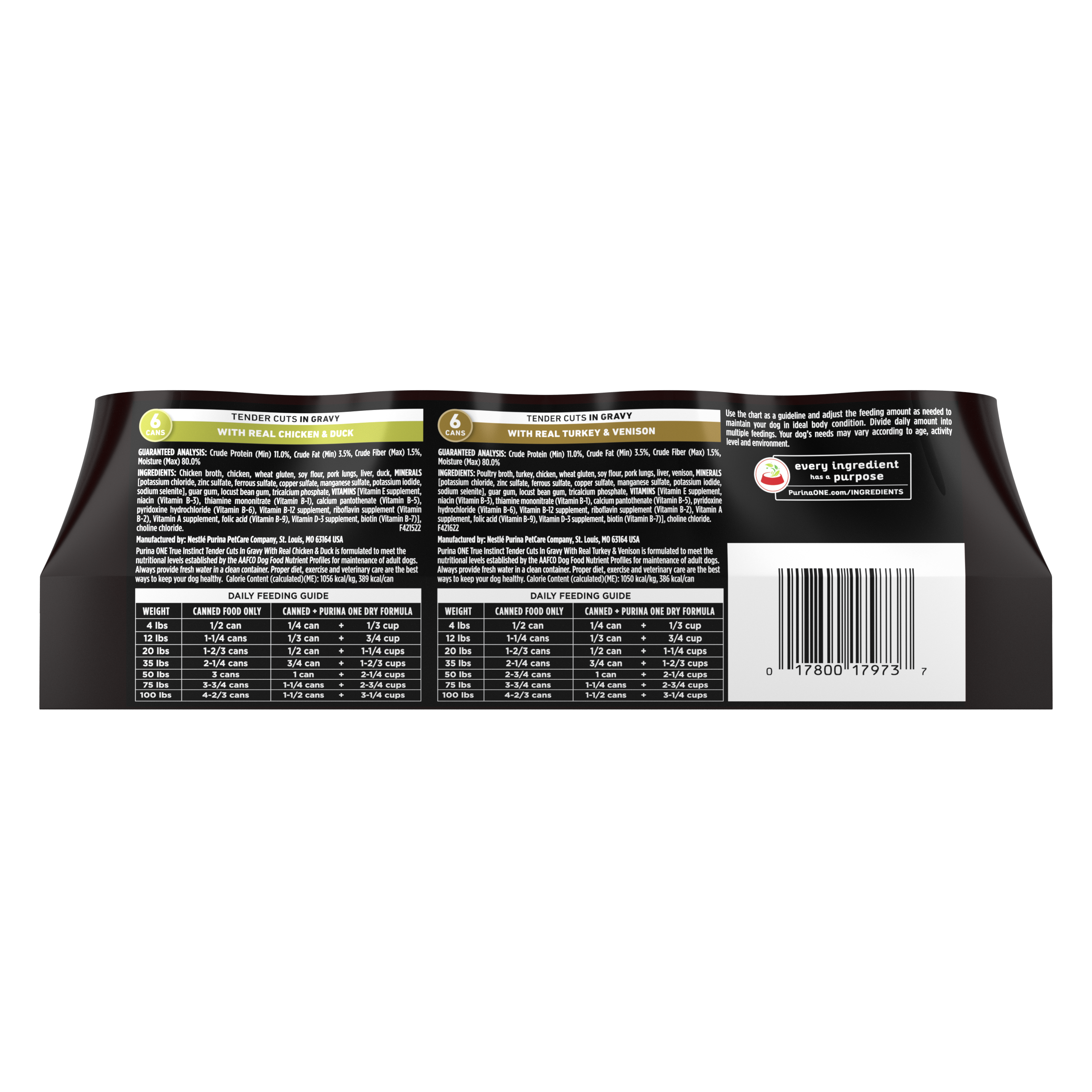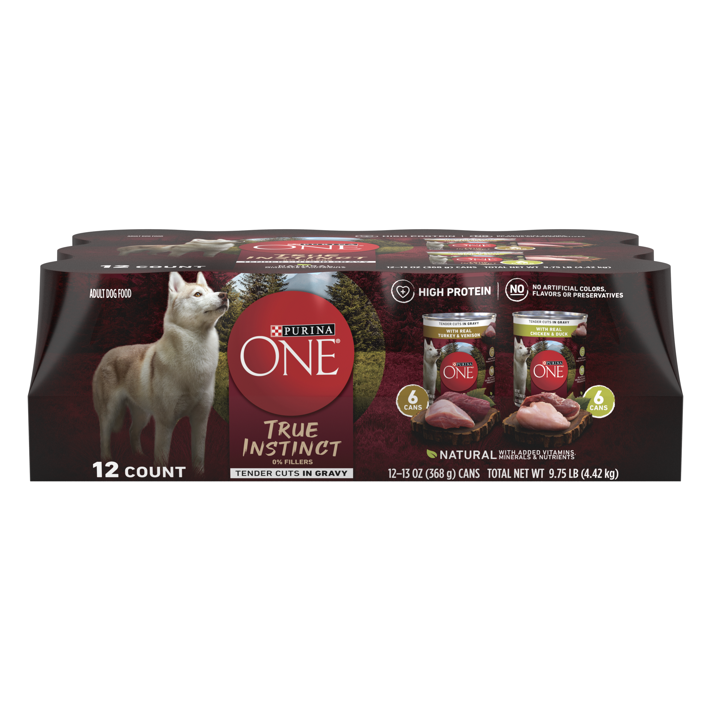 Shop / DOG / Purina ONE True Instinct Tender Cuts in Gravy With Real Turkey and Venison, and With Real Chicken and Duck High Protein Wet Dog Food Variety Pack Purina ONE True Instinct Tender Cuts in Gravy With Real Turkey and Venison, and With Real Chicken and Duck High Protein Wet Dog Food Variety Pack Purina ONE 13oz $27.99 13oz Purchase Options Free In-Store Pick Up Not Available Save 20% on orders $100+ Set your store for inventory and store pickup details Zip Code Search Same-day Delivery* No minimum charge for delivery orders. *Order before 2pm and have it delivered today. Orders placed after 2pm will be delivered the next day. Must be inside delivery radius. Zip Code Unfortunately delivery is not available to this address. In order to ensure the best availability accuracy, changing your selected store will remove all items from your cart. You will need to re-add these items with your newly selected store if you choose to continue. Continue Cancel Ship it to Me Quantity Add To Cart Feeding guide disclaimer ✕ Feeding guides provide a starting point for the amount of food to give your pet each day. We recommend that you keep your pet in ideal body condition and not allow them to become overweight. The amount of food your pet needs can vary based on age, activity level or other food and treats given, so be sure to work with your veterinarian to determine an appropriate weight for your pet, and to make any necessary adjustments to their feeding. Information Give your dog an assortment of mealtime options with this Purina ONE True Instinct Tender Cuts in Gravy wet adult dog food variety pack that is natural dog food with added vitamins, minerals and nutrients. Both recipes feature real poultry along with other high-quality ingredients you can feel good about giving to your dog. The tender, meaty canned dog food texture gives him something to sink his teeth into, and a rich gravy for dogs balances out each of these delicious meals for added flavor and moisture. These high-protein dog food formulas are made with no poultry by-products and no artificial colors, flavors or preservatives. With 100 percent complete and balanced nutrition for your adult dog's whole-body health, this canned food for dogs is a convenient way to satisfy his nutritional needs. Alternate between these two Purina ONE wet dog food With Real Turkey and Venison or With Real Chicken and Duck and show him just how much you care about his health and happiness. Ingredients Turkey & Venison: Poultry Broth, Turkey, Chicken, Wheat Gluten, Soy Flour, Pork Lungs, Liver, Venison, MINERALS [Potassium Chloride, Zinc Sulfate, Ferrous Sulfate, Copper Sulfate, Manganese Sulfate, Potassium Iodide, Sodium Selenite], Guar Gum, Locust Bean Gum, Tricalcium Phosphate, VITAMINS [Vitamin E Supplement, Niacin (Vitamin B-3), Thiamine Mononitrate (Vitamin B-1), Calcium Pantothenate (Vitamin B-5), Pyridoxine Hydrochloride (Vitamin B-6), Vitamin B-12 Supplement, Riboflavin Supplement (Vitamin B-2), Vitamin A Supplement, Folic Acid (Vitamin B-9), Vitamin D-3 Supplement, Biotin (Vitamin B-7)], Choline Chloride. F421622; Chicken & Duck: Chicken Broth, Chicken, Wheat Gluten, Soy Flour, Pork Lungs, Liver, Duck, MINERALS [Potassium Chloride, Zinc Sulfate, Ferrous Sulfate, Copper Sulfate, Manganese Sulfate, Potassium Iodide, Sodium Selenite], Guar Gum, Locust Bean Gum, Tricalcium Phosphate, VITAMINS [Vitamin E Supplement, Niacin (Vitamin B-3), Thiamine Mononitrate (Vitamin B-1), Calcium Pantothenate (Vitamin B-5), Pyridoxine Hydrochloride (Vitamin B-6), Vitamin B-12 Supplement, Riboflavin Supplement (Vitamin B-2), Vitamin A Supplement, Folic Acid (Vitamin B-9), Vitamin D-3 Supplement, Biotin (Vitamin B-7)], Choline Chloride. F421522 Guaranteed Analysis Turkey & Venison: Crude Protein (Min)…11.0%, Crude Fat (Min)…3.5%, Crude Fiber (Max)…1.5%, Moisture (Max)…80.0%; Chicken & Duck: Crude Protein (Min)…11.0%, Crude Fat (Min)…3.5%, Crude Fiber (Max)…1.5%, Moisture (Max)…80.0% Customers also liked Customer Reviews