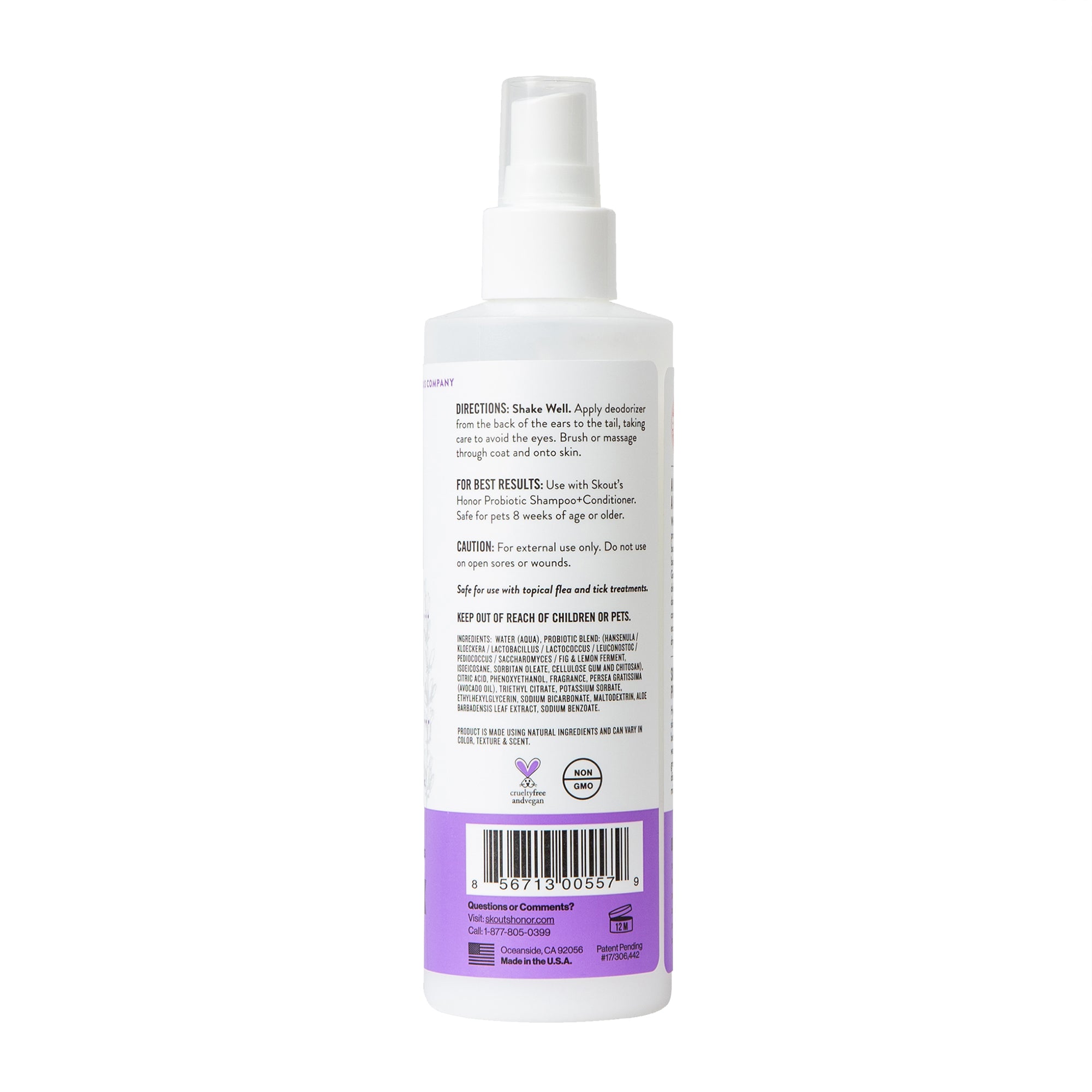 Shop / DOG / Skouts Honor Probiotic Deodorizer Lavender Skouts Honor Probiotic Deodorizer Lavender Skout's Honor Default Title $12.99 Default Title Purchase Options Free In-Store Pick Up Not Available Save 20% on orders $100+ Set your store for inventory and store pickup details Zip Code Search Same-day Delivery* No minimum charge for delivery orders. *Order before 2pm and have it delivered today. Orders placed after 2pm will be delivered the next day. Must be inside delivery radius. Zip Code Unfortunately delivery is not available to this address. In order to ensure the best availability accuracy, changing your selected store will remove all items from your cart. You will need to re-add these items with your newly selected store if you choose to continue. Continue Cancel Ship it to Me Quantity Add To Cart Information Hydrates and deodorizes the skin and coat for a fresher, better-smelling pet in between washes. Our daily-use deodorizing spray hydrates and deodorizes the skin and coat for a fresher, better-smelling pet in between washes. Designed to support your pet's natural defenses against itching, dryness, irritation & odor, it contains avocado oil and topical probiotics that help support a healthy microbiome. For dogs and cats. Customers also liked Customer Reviews